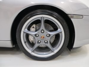 The 7.5 J x 18 and 9 J x 18 light alloy wheels fitted front and rear respectively are finished in Seal Grey with coloured Porsche Crests. All four rims are in flawless condition and the ultra low profile tyres are the highest quality Michelin Pilot sport with masses of tread remaining. The ABS assisted braking system incorporates 4-Wheel ventilated and cross-drilled discs with 4-piston fixed monobloc callipers. Both ornate discs and cool aluminium painted callipers unique to this model are clearly visible through the spokes and hint towards the racing pedigree infused within the cars genes.