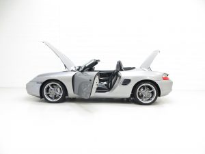 The Boxster S Anniversary Edition was the modern tribute to the artistry and innovation that defined the legendary Porsche 550 Spyder, the phenomenally successful racer that helped redefine the future of sports car design. Built to commemorate fifty years since Ferdinand Porsche devised the original lightweight aluminium Spyder in 1953, just 1,953 Anniversary Edition Boxster S vehicles were built, all finished in unique GT Silver Metallic. Porsche engineers endowed the cars with more power (264hp at 6,200rpm) and a re-engineered six speed gearbox with 15% shorter throw from standard models. Additional styling notes to distinguish the Anniversary Edition include a stainless steel tailpipe flanked by silver mesh grilles, wheel spokes painted in Seal Grey with matching centres and coloured Porsche Crests, bright chrome rear boot lid badge and an individually number plague placed on the centre console.