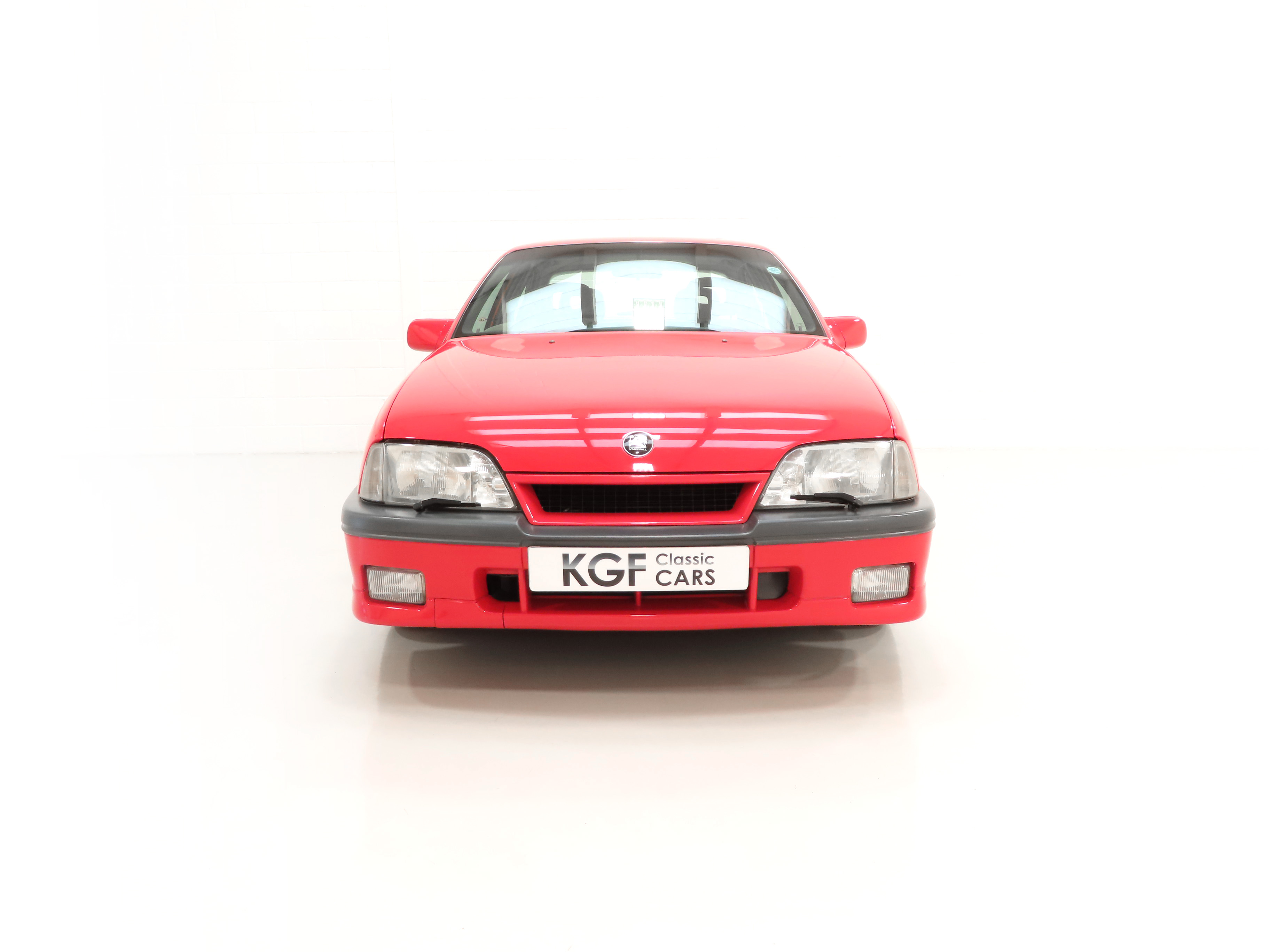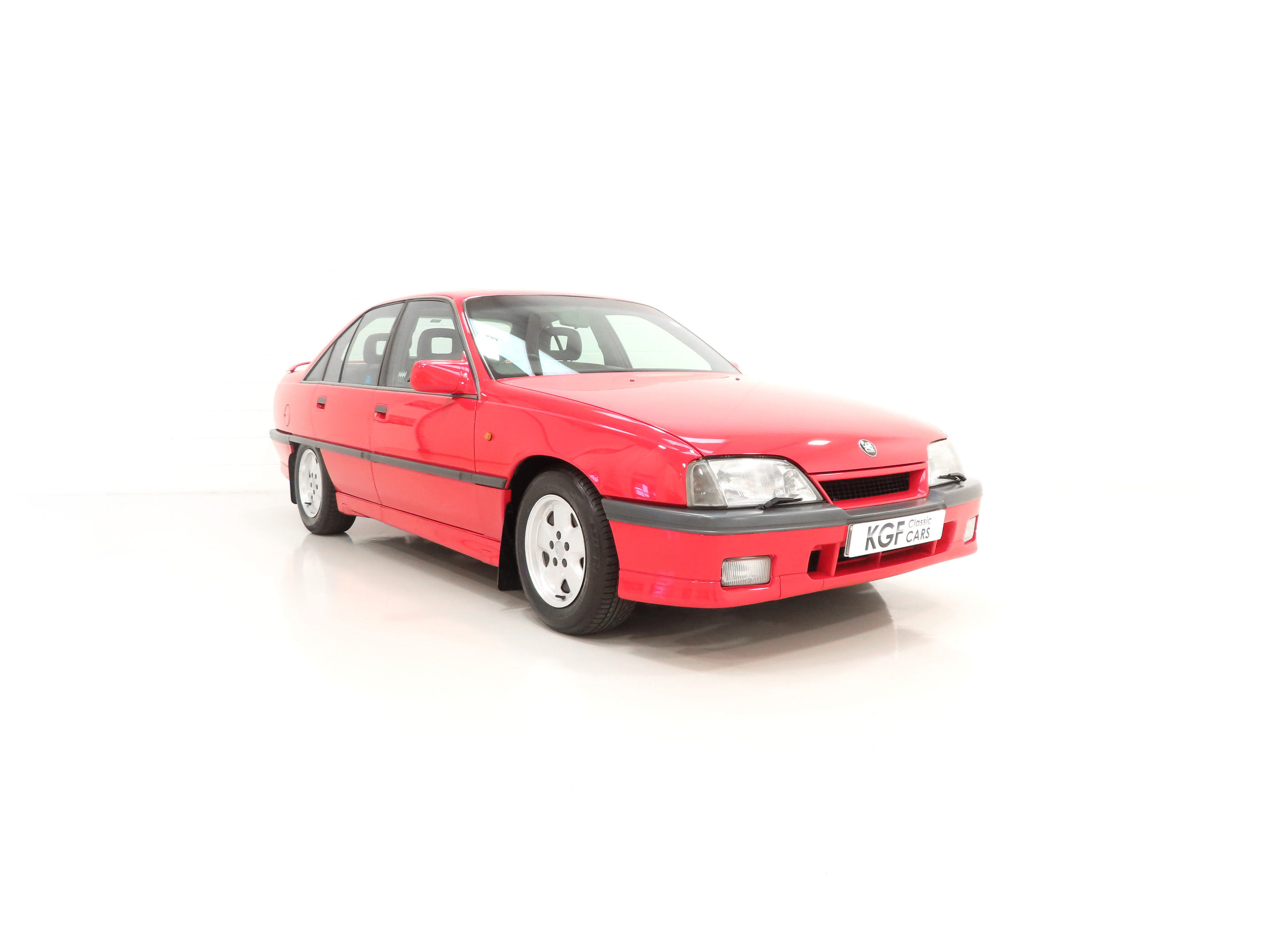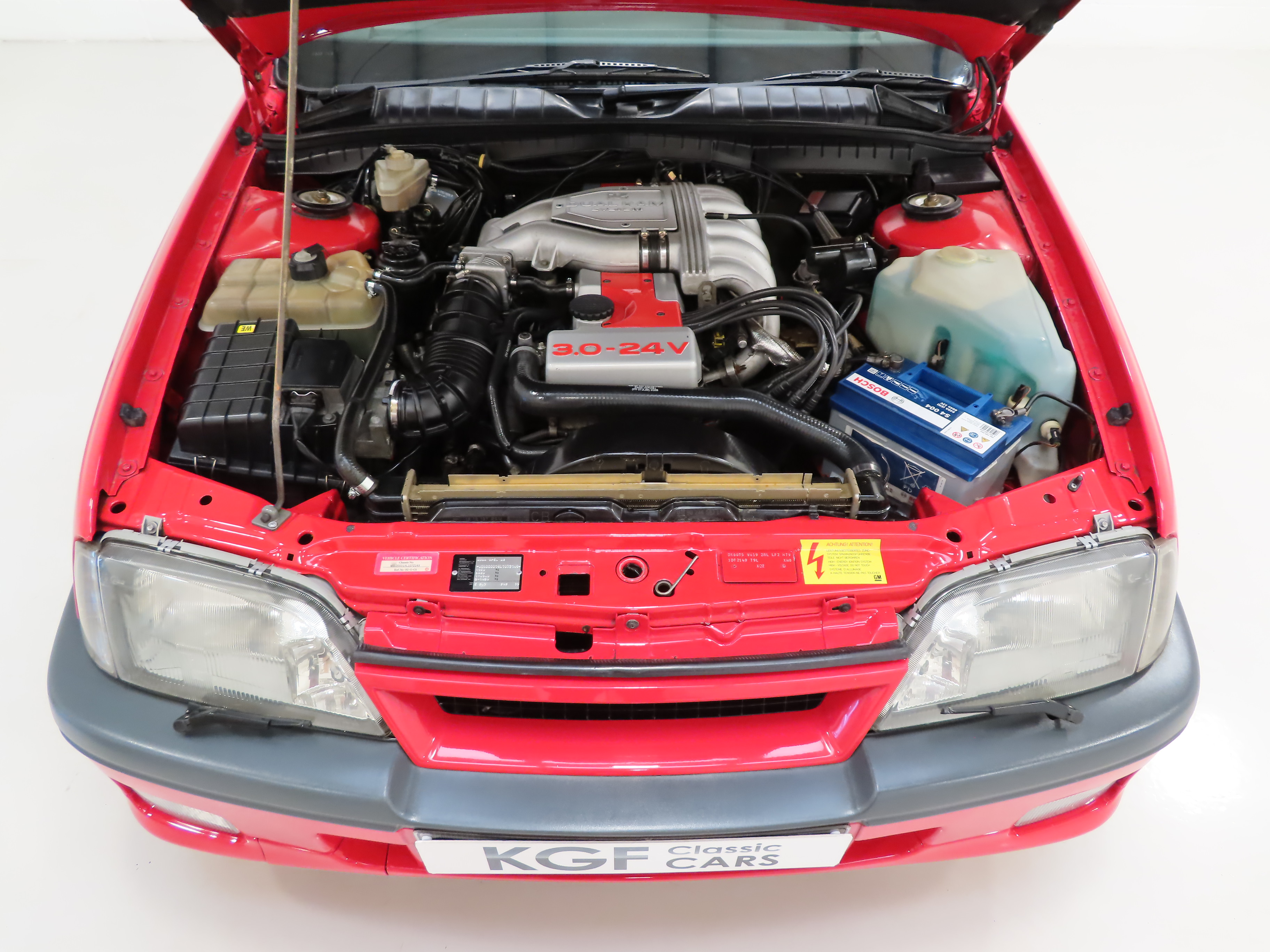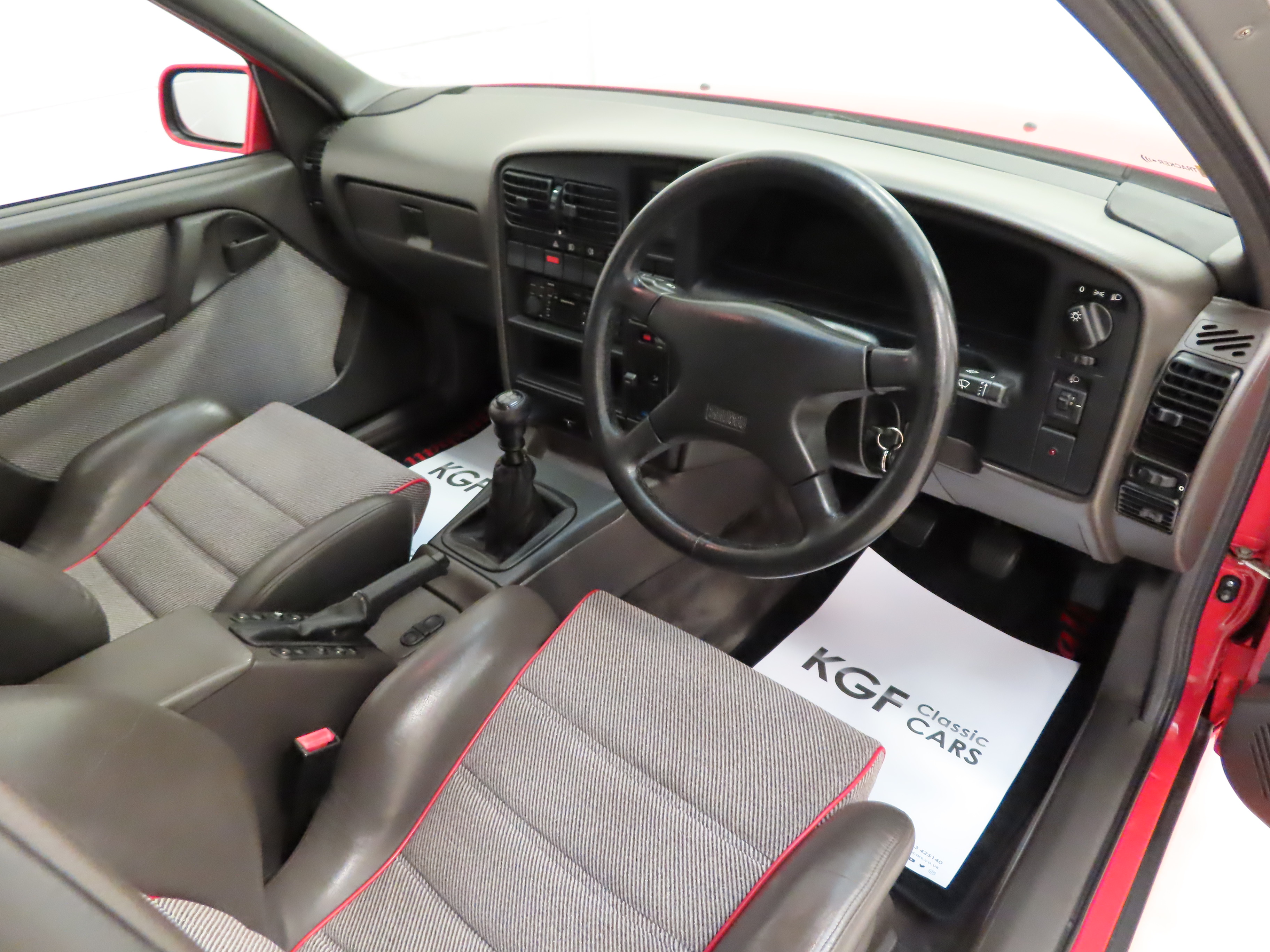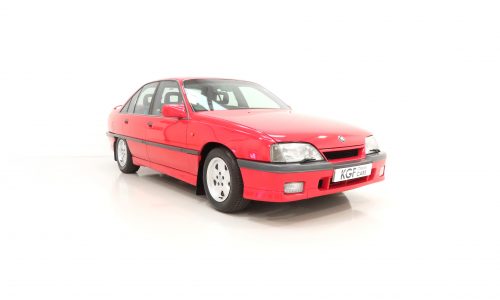 This imposing and rare Vauxhall Carlton is the most desirable 24v model with manual transmission and furthermore has enjoyed single fastidious ownership since it was just two years old. Finished in original solid Carmine Red, (Code E 547), the paintwork gleams thanks to its pampered existence which even extends to garaged storage within a dehumidifying air-chamber! A deep polished shine to the pin-straight factory panels is difficult to fault and the common troublesome areas such as the rear inner wheel arches are perfect. Some carefully treated frontal stone chips and a touched in scratch to the nearside front wing is visible and the underside is carefully protected without the unnecessary application of crude heavy underseal. The unique body trim pieces and aerofoils are in superb condition and free from distortion. Originality seekers will be delighted to see all glass panes security etched, including the graduated tint windscreen, still with factory labels as well as original light clusters and Cibie headlamps. A stunningly preserved and very rare Vauxhall.