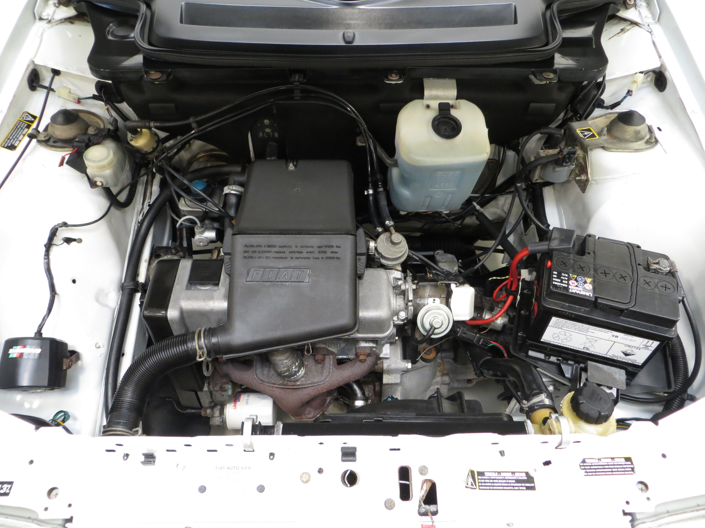 Five factory standard steel rims including the spare wheel are shod in 155/70 R13 tyres, and the original Fiat full wheel covers are fully intact and in excellent order. The spare wheel is housed in the spotless boot area which is totally original, even down to factory build and paint code stickers to the inner boot hatch. Independent brake circuits with servo assistance incorporate front discs and rear drums to bring the car to a straight line stop quickly and safely.