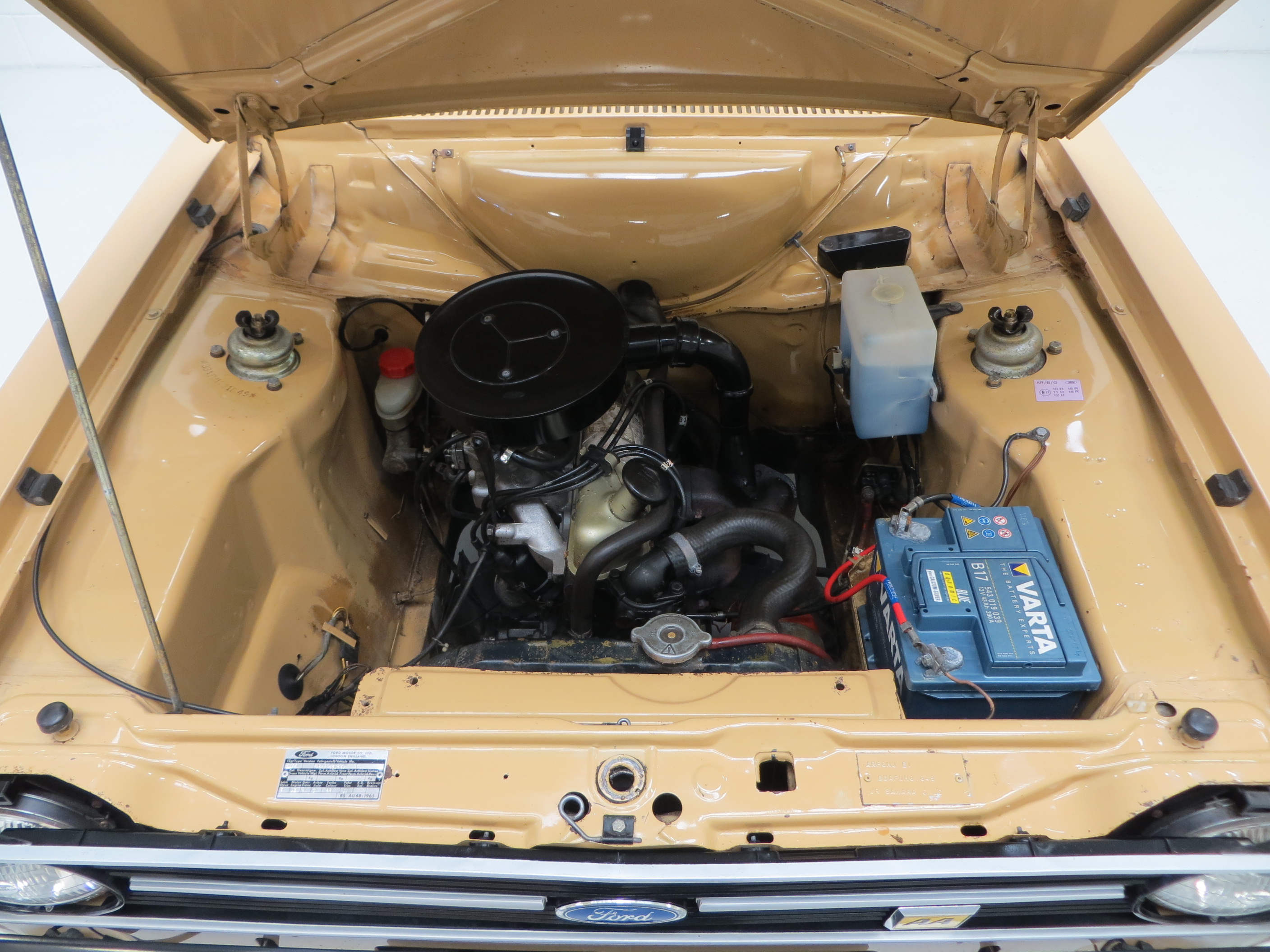 The 1298cc single choke OHV engine is simple, robust, well proven and a home mechanics dream. With 57bhp at 5500rpm a top speed of 88mph and 0-60 in 16.5 seconds is quoted. Amazingly factory stickers are intact and even serviceable items such as the ignition coil and radiator cap display the Motorcraft logo. The strut top chassis stamping is untouched. The four speed all synchromesh gearbox is light, exact and effortless.