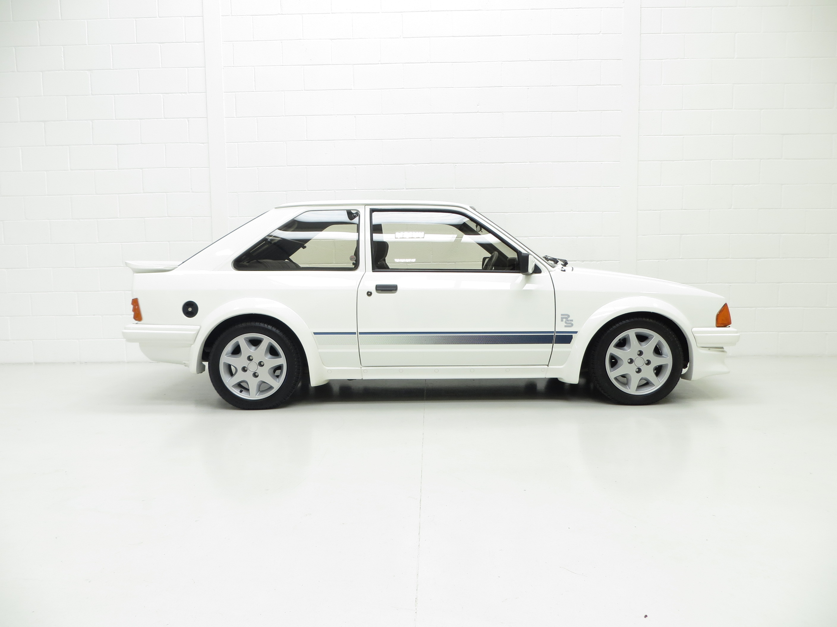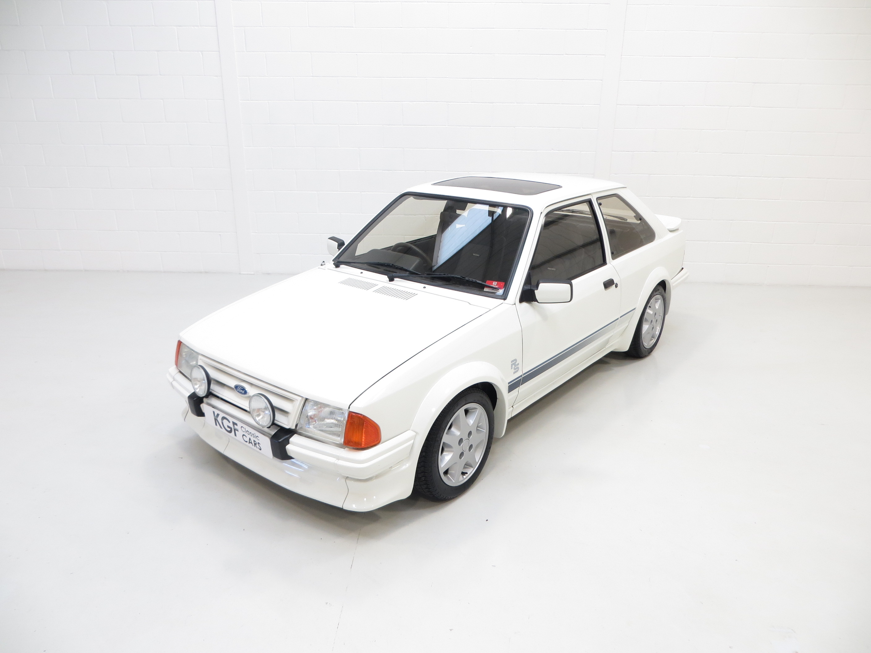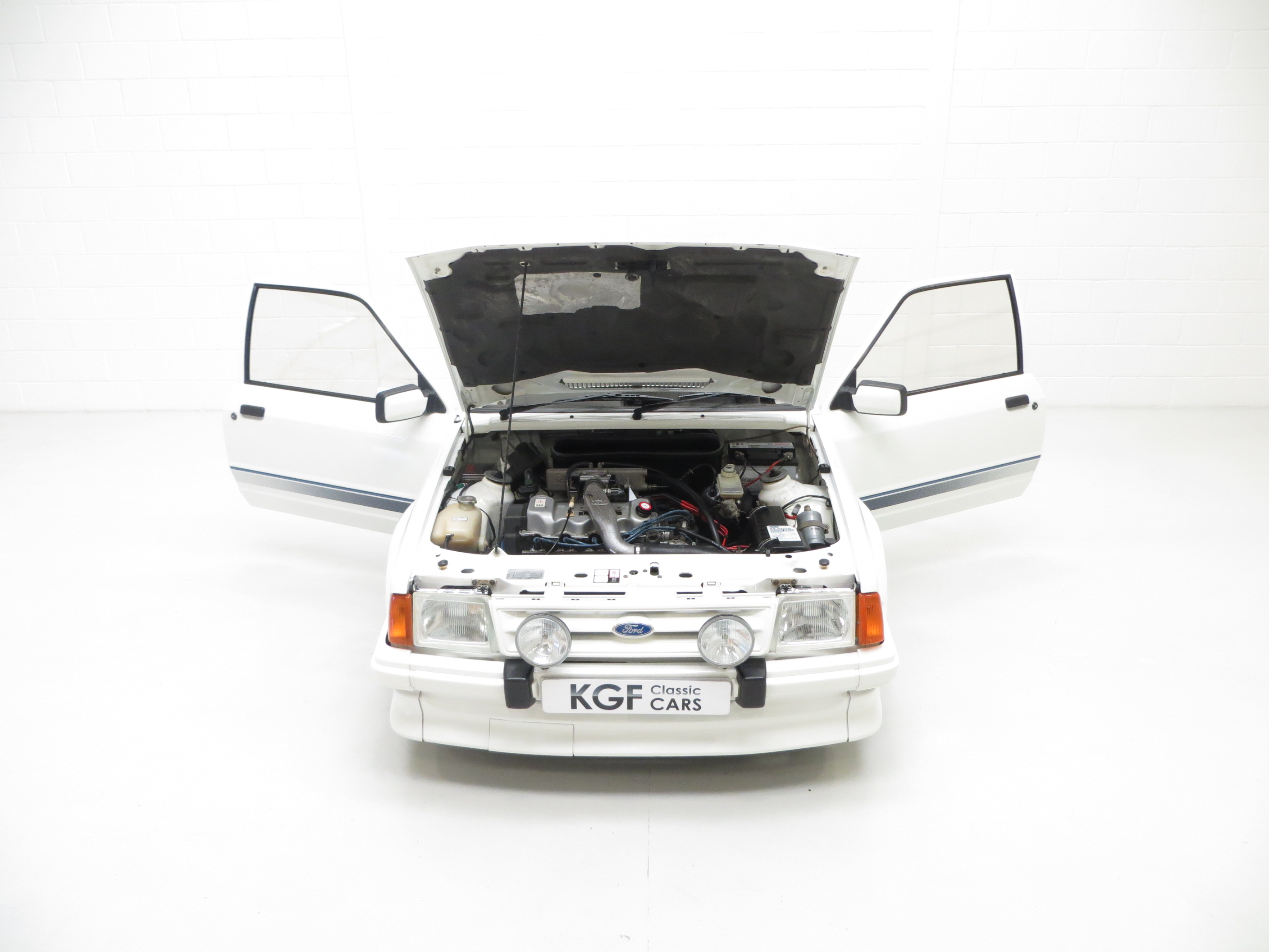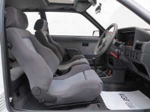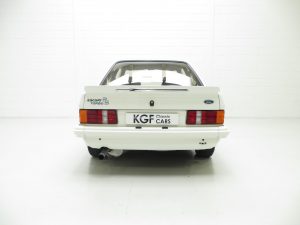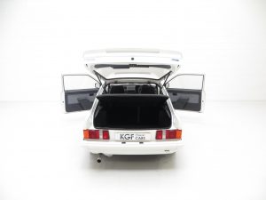 The unrestored Diamond White (code B3) paintwork is exceptional with a brilliant pure shine and uniform finish. Both front wings and windscreen scuttle panel are factory panels with date stampings clearly visible. The correct Carello headlamps, spot lights and the factory glass remain including the Ford inscribed front screen. The offside front wing was repainted after the previous keeper dropped a power tool on it and at the same time the front slam panel and grille were refreshed. The original decals are intact aside from a small section on the driver’s side where the film edge has come away and the rubbers are ever so slightly dry. This truly genuine example proudly displays it’s unmolested and unrestored credentials including visible factory underseal and the often missing foam pads to the underside of the four wheel arch extensions still attached along with the original PDI sticker on the rear wishbone! The underside having never been refurbished displays an honest age and mileage related film of debris. A few small dings are barely visible and gravel rash is evident on the rear wheel arch extensions. An extraordinary opportunity to own a slice of Ford RS history.