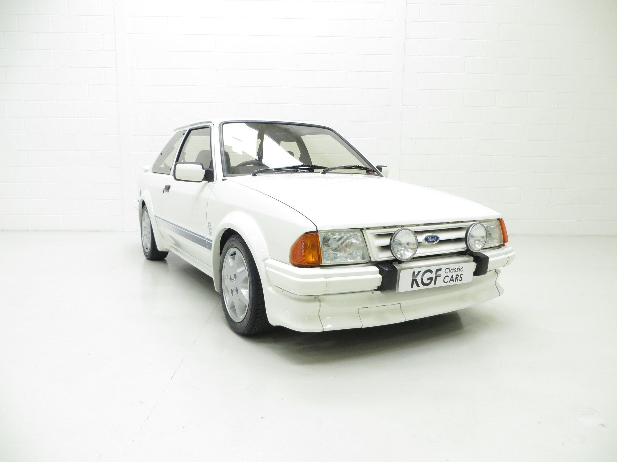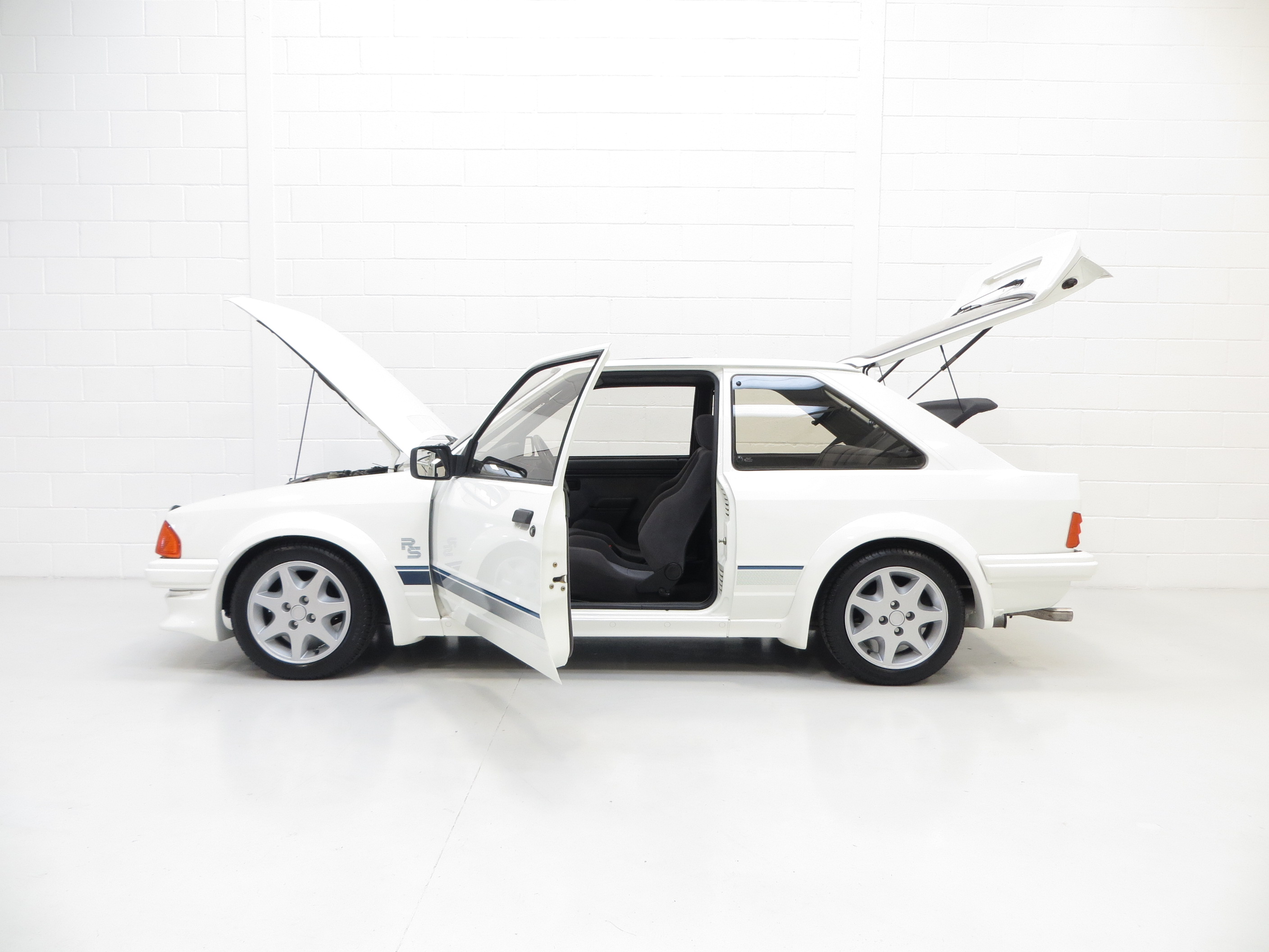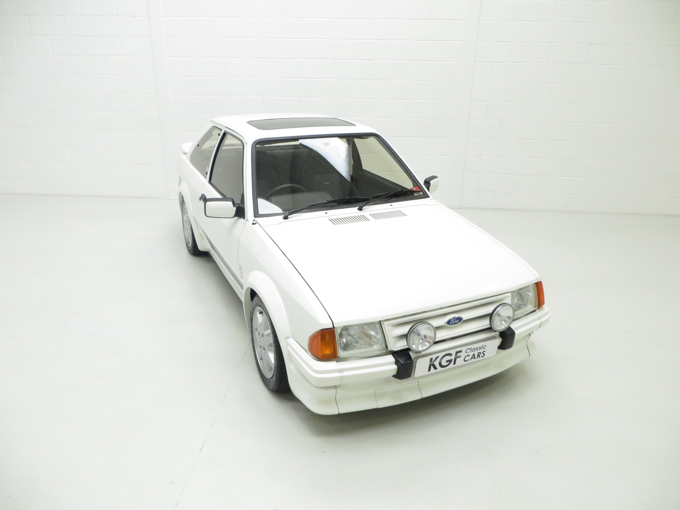 The unrestored Diamond White (code B3) paintwork is exceptional with a brilliant pure shine and uniform finish. Both front wings and windscreen scuttle panel are factory panels with date stampings clearly visible. The correct Carello headlamps, spot lights and the factory glass remain including the Ford inscribed front screen. The offside front wing was repainted after the previous keeper dropped a power tool on it and at the same time the front slam panel and grille were refreshed. The original decals are intact aside from a small section on the driver’s side where the film edge has come away and the rubbers are ever so slightly dry. This truly genuine example proudly displays it’s unmolested and unrestored credentials including visible factory underseal and the often missing foam pads to the underside of the four wheel arch extensions still attached along with the original PDI sticker on the rear wishbone! The underside having never been refurbished displays an honest age and mileage related film of debris. A few small dings are barely visible and gravel rash is evident on the rear wheel arch extensions. An extraordinary opportunity to own a slice of Ford RS history.