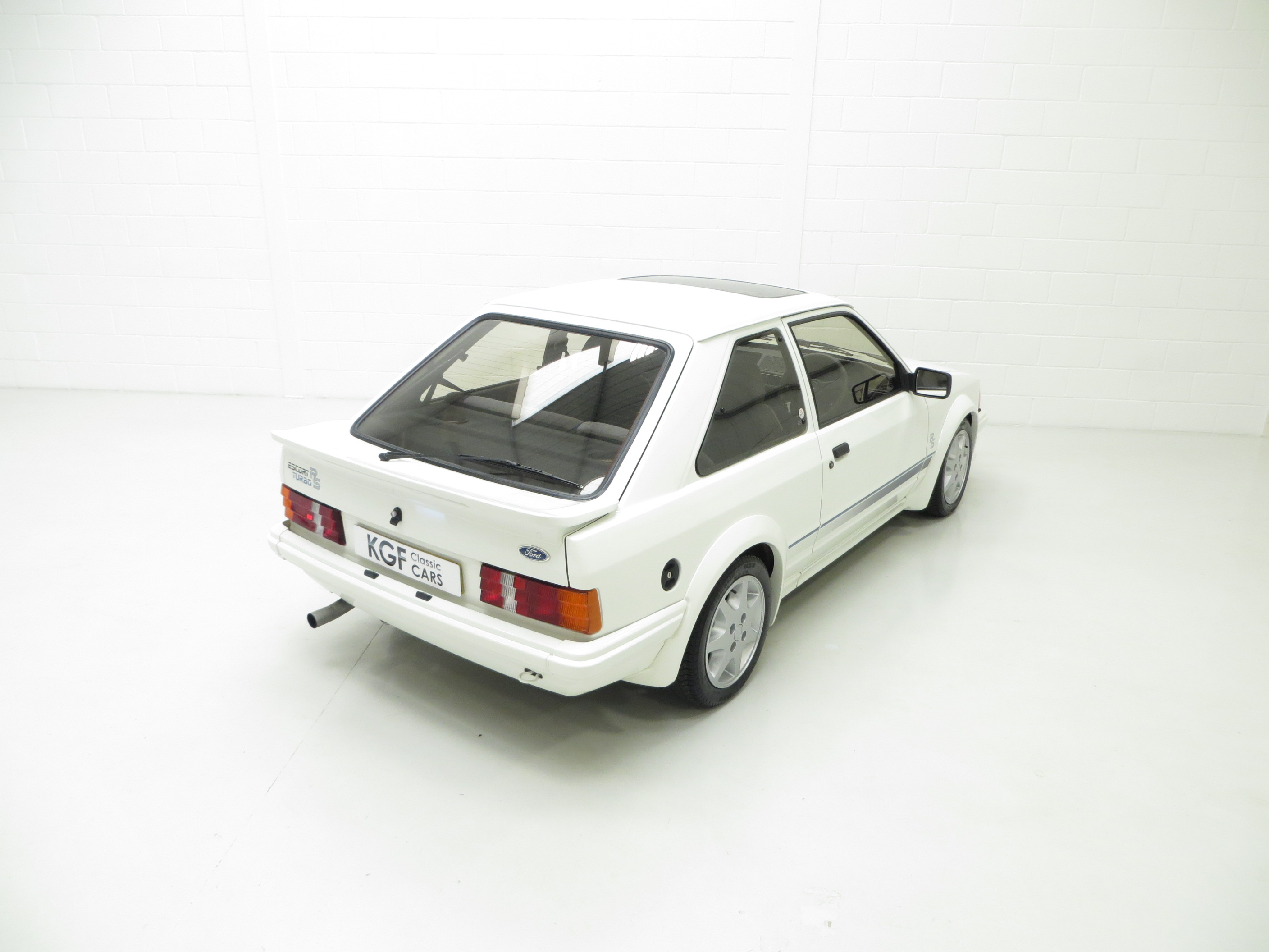 Colour coded bumpers with front over riders, laminated windscreen and all round safety glass, RS aerodynamic front and rear spoilers, RS Turbo decals, Ford spot lamps, remote control colour coded door mirrors, colour coded ‘Orion’ radiator grille, RS 3 spoke steering wheel, cigar lighter, rear ashtrays, front door stowage bins, 3-speed heater fan, coin box, radio cassette, trip recorder, tachometer, roof mounted digital clock. Factory specified Custom Pack includes: Electric windows, central locking, tilt/slide glass sunroof and opening rear quarter windows.