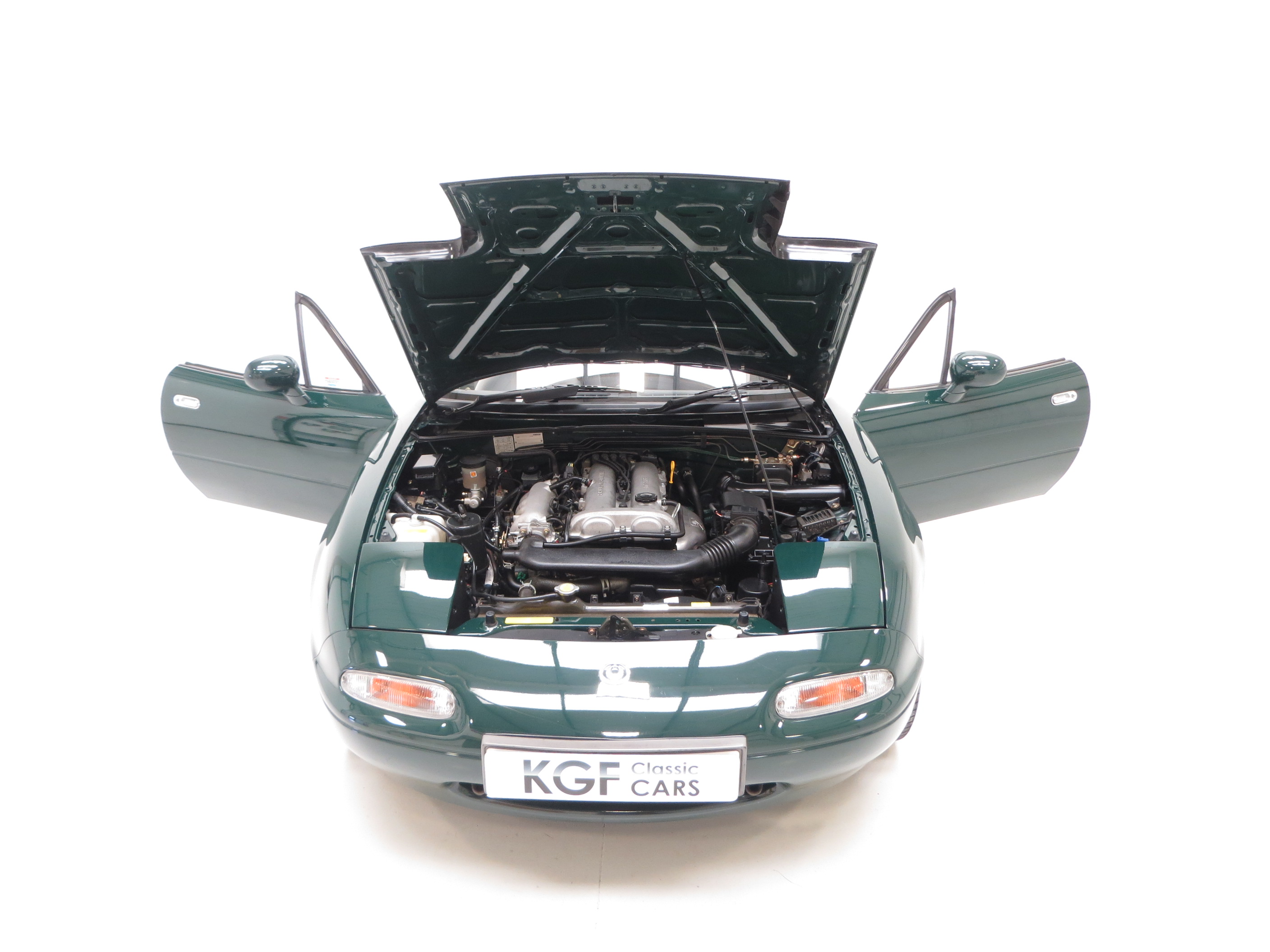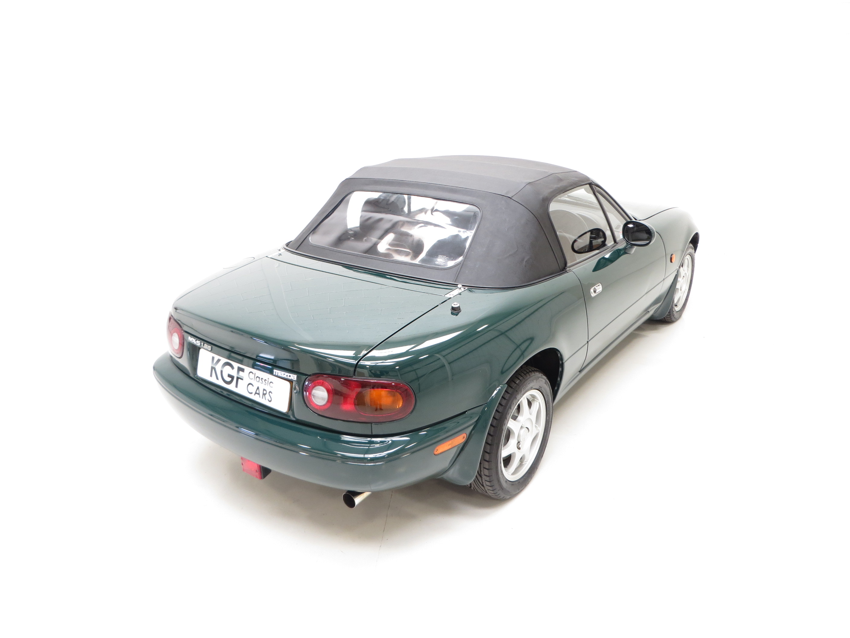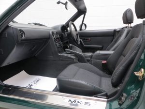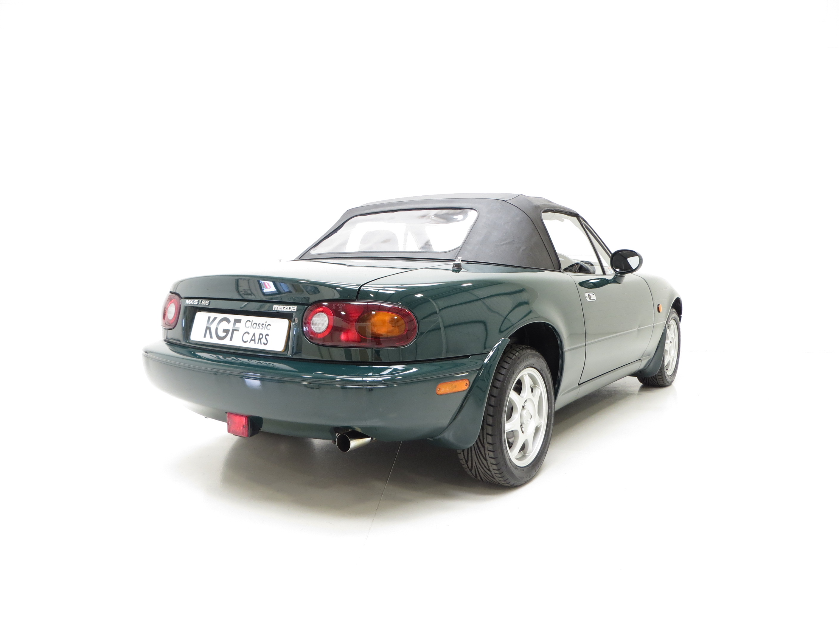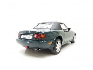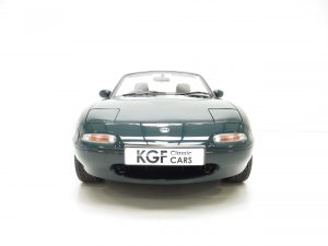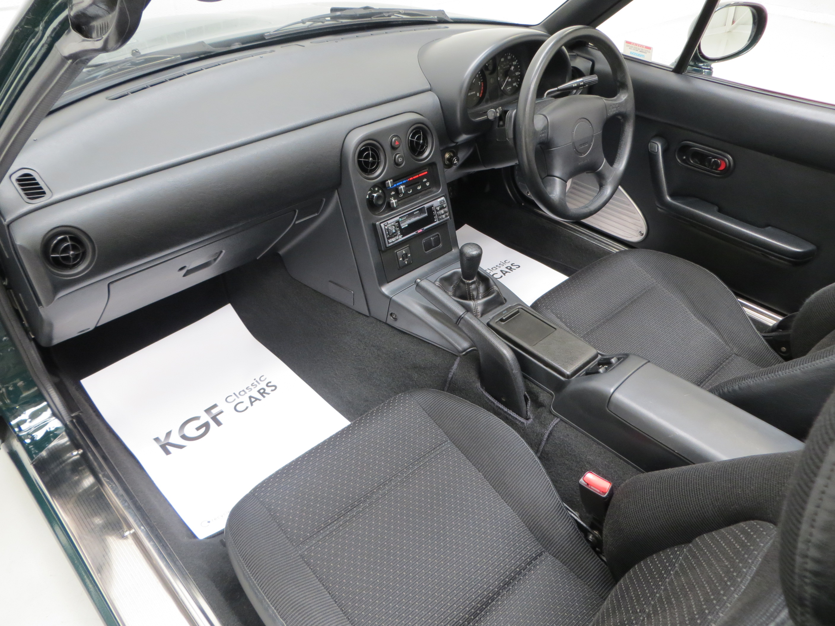 This fabulous Mazda MX-5 in factory original British Racing Green, (Code HU), boasts a deep gloss shine owing to the very low mileage and garaged storage from new. The problematic sills are spotlessly clean and the black canvas hood is in perfect order with a tight fit and no cracks or damage. The rear plastic window is clear with no crease marks whatsoever. A few tiny stone chips to the front panel and a small ding on the drivers door can be seen. The supplying Mazda Dealer number plates front and rear remain on the car as does the security coded window etching. The epitome of a modern classic sports car, preserved to the highest order.