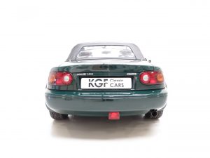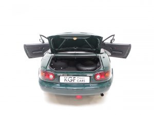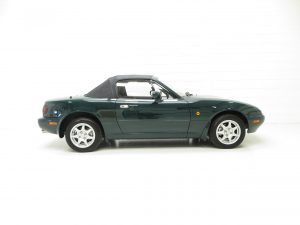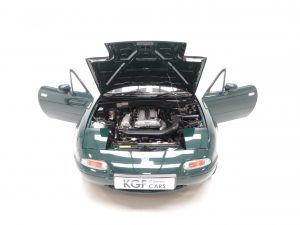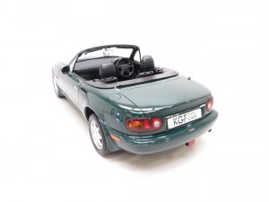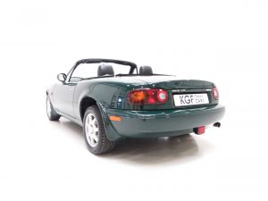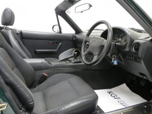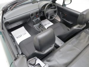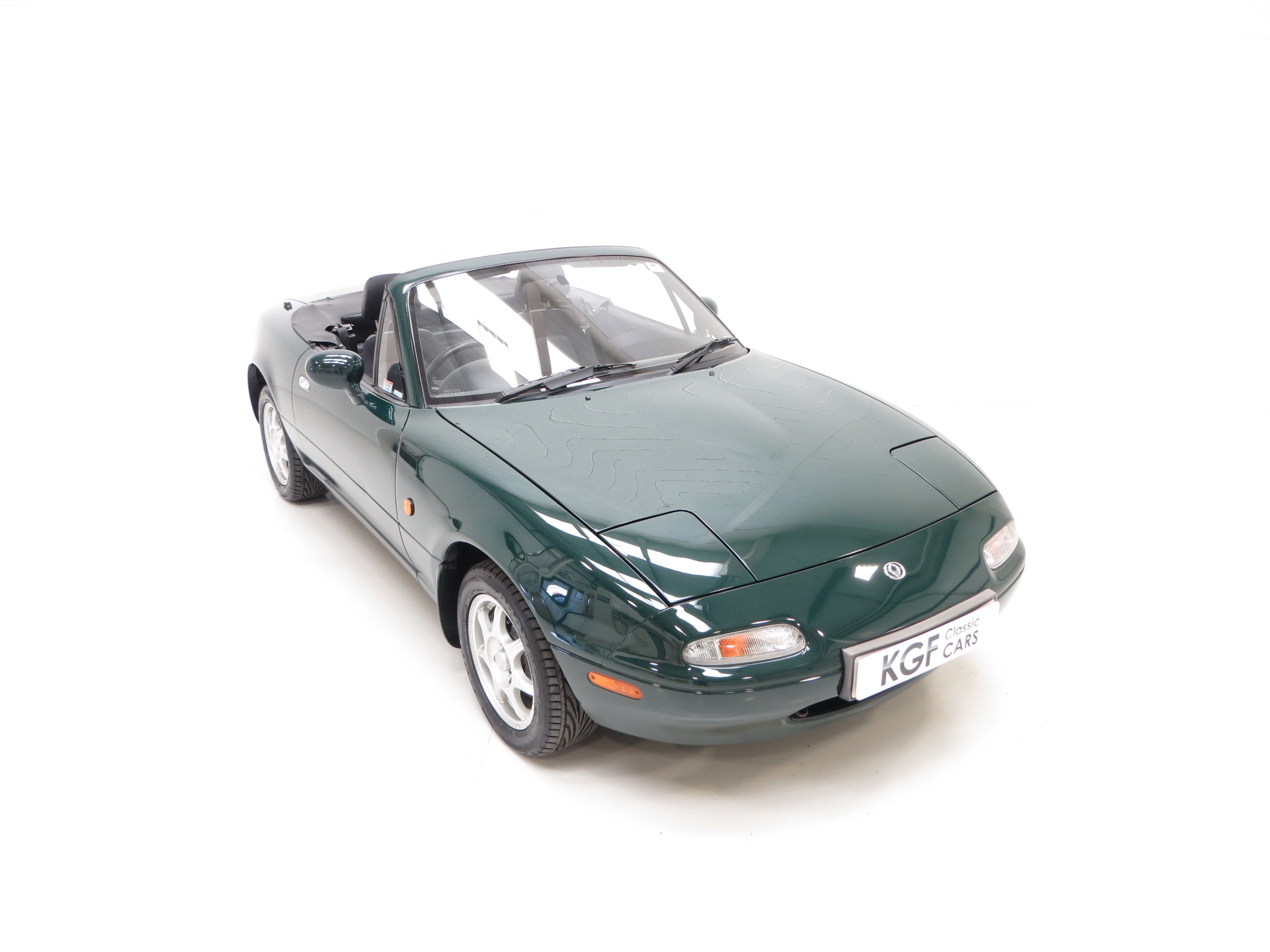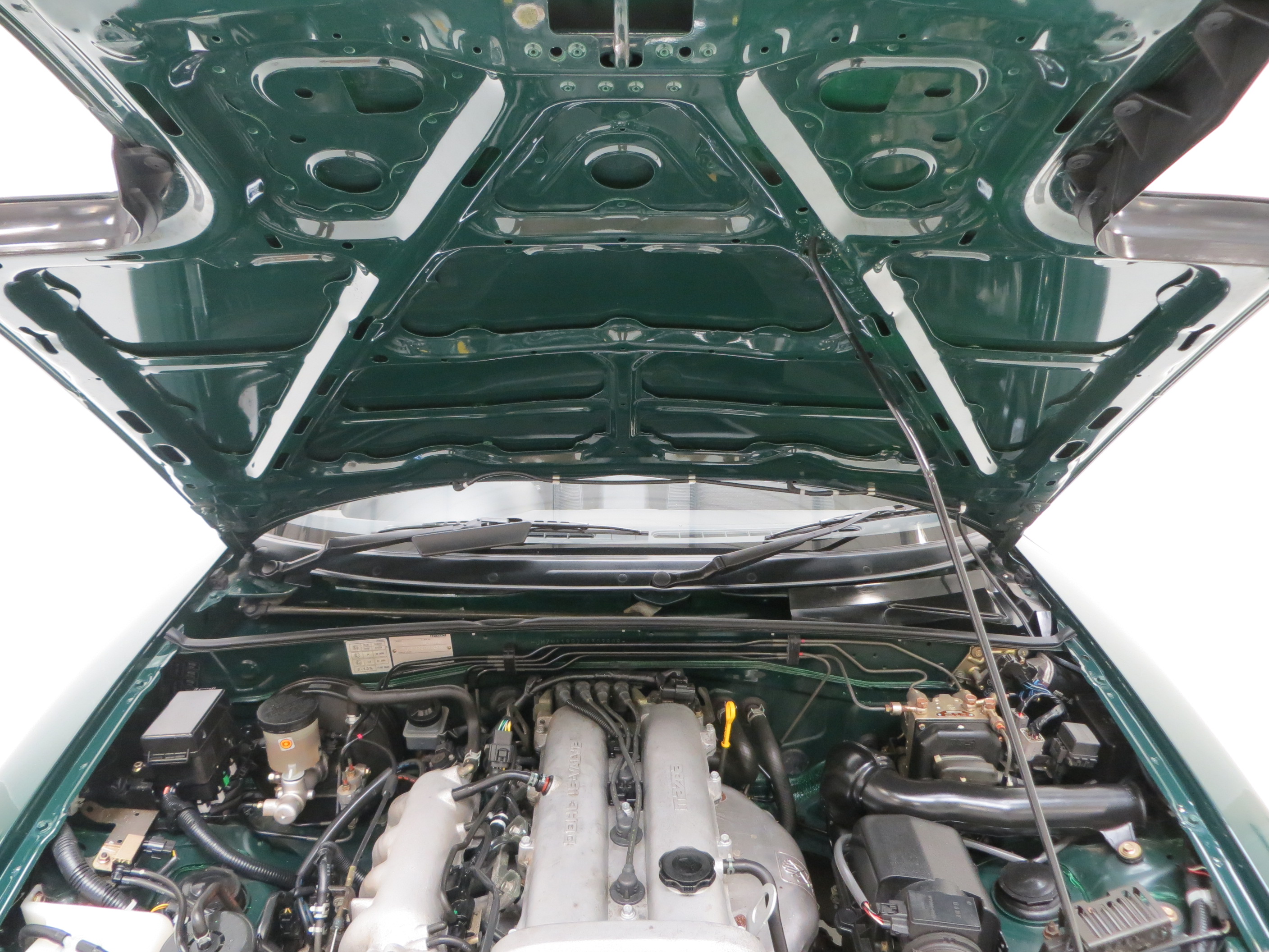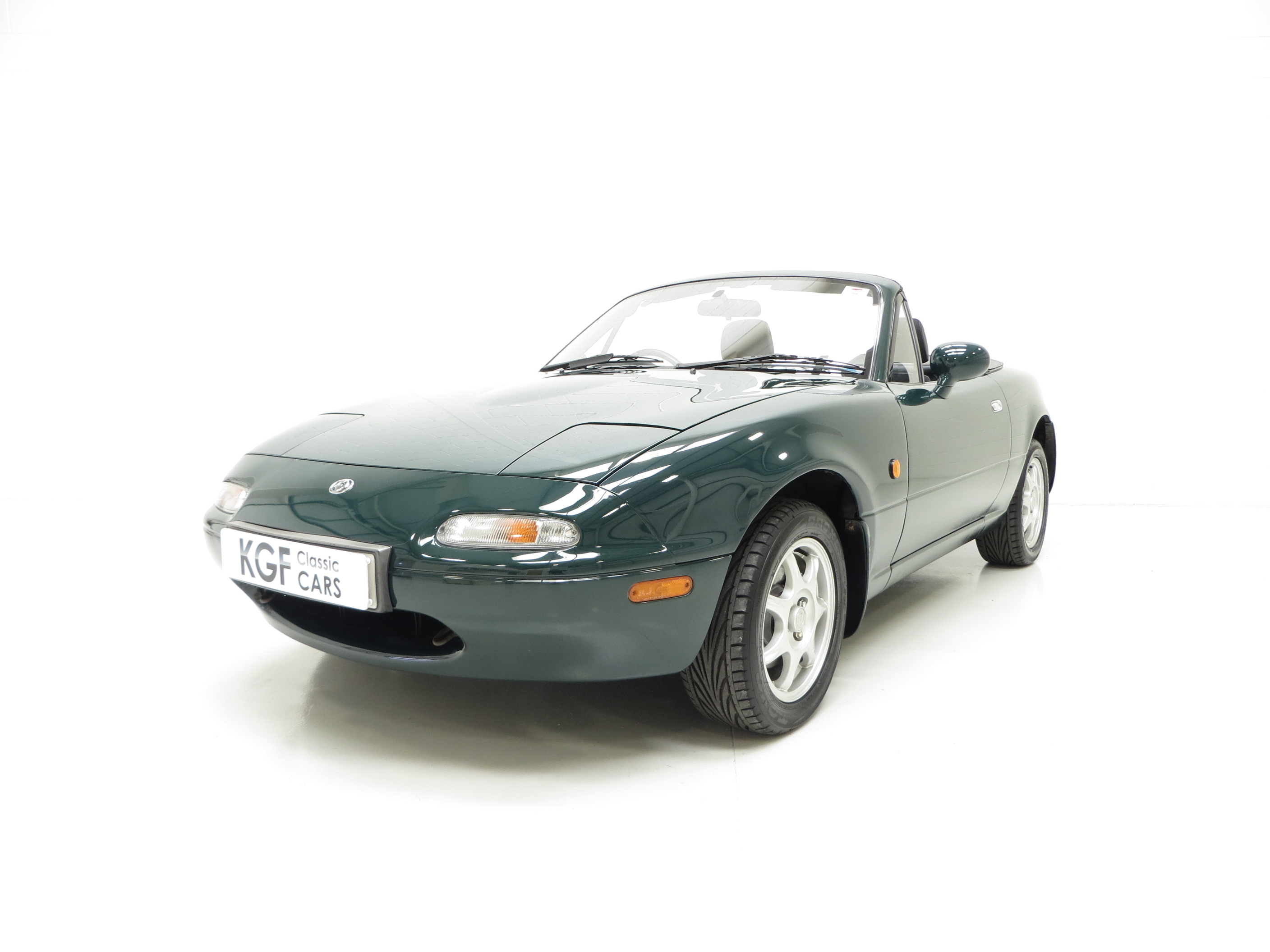 This fabulous Mazda MX-5 in factory original British Racing Green, (Code HU), boasts a deep gloss shine owing to the very low mileage and garaged storage from new. The problematic sills are spotlessly clean and the black canvas hood is in perfect order with a tight fit and no cracks or damage. The rear plastic window is clear with no crease marks whatsoever. A few tiny stone chips to the front panel and a small ding on the drivers door can be seen. The supplying Mazda Dealer number plates front and rear remain on the car as does the security coded window etching. The epitome of a modern classic sports car, preserved to the highest order.