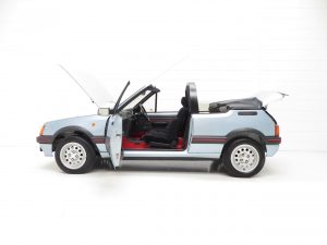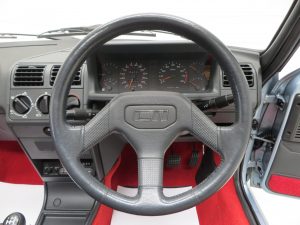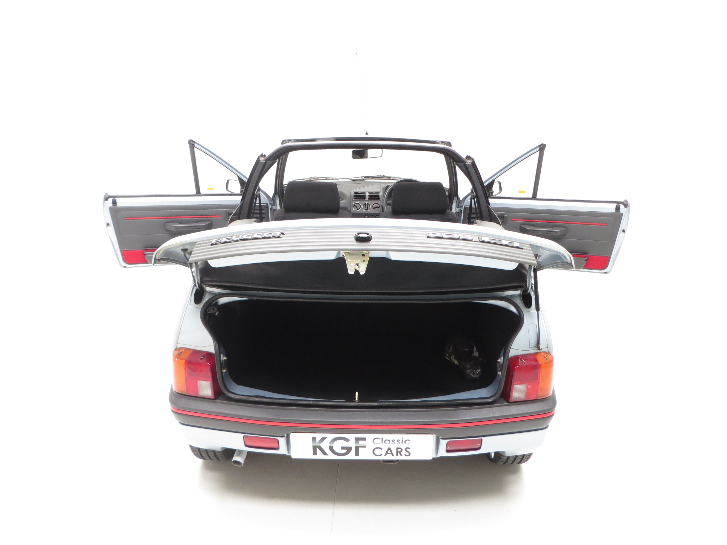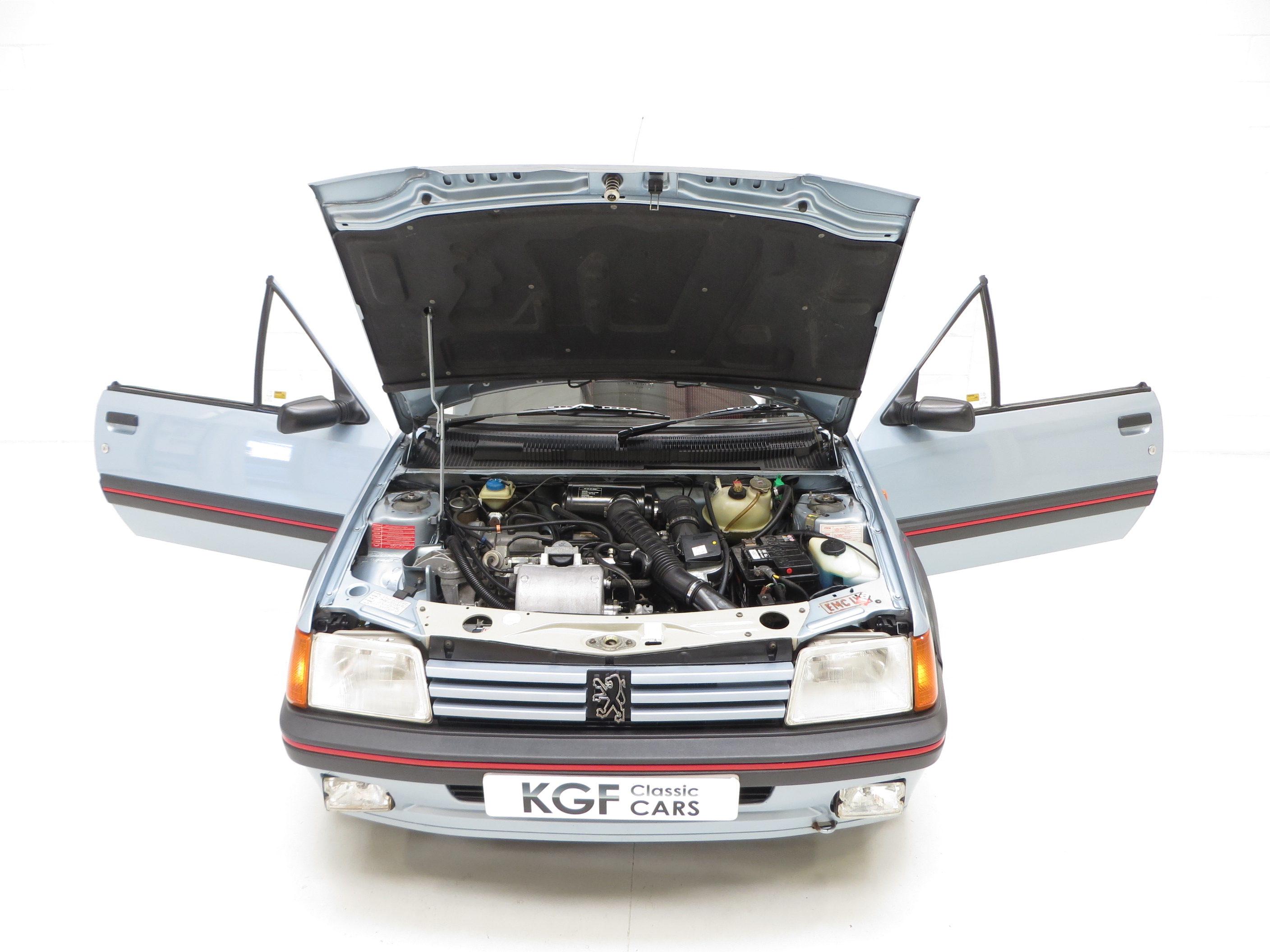 Benefiting from the later model interior revisions, this genuine example looks amazing. The Quartet velour seat trim in black and red offers hip hugging support. All the clear sports dials operate faultlessly as do the push button switches. The sports red carpeting is vibrant and spotlessly clean and unique features such as the red stitching on the leather gear gaiter are clear to see. A period immobiliser is fitted and the correct Peugeot Clarion cassette stereo tuner with code card is in situ. An iconic interior exactly as the manufacturer intended.