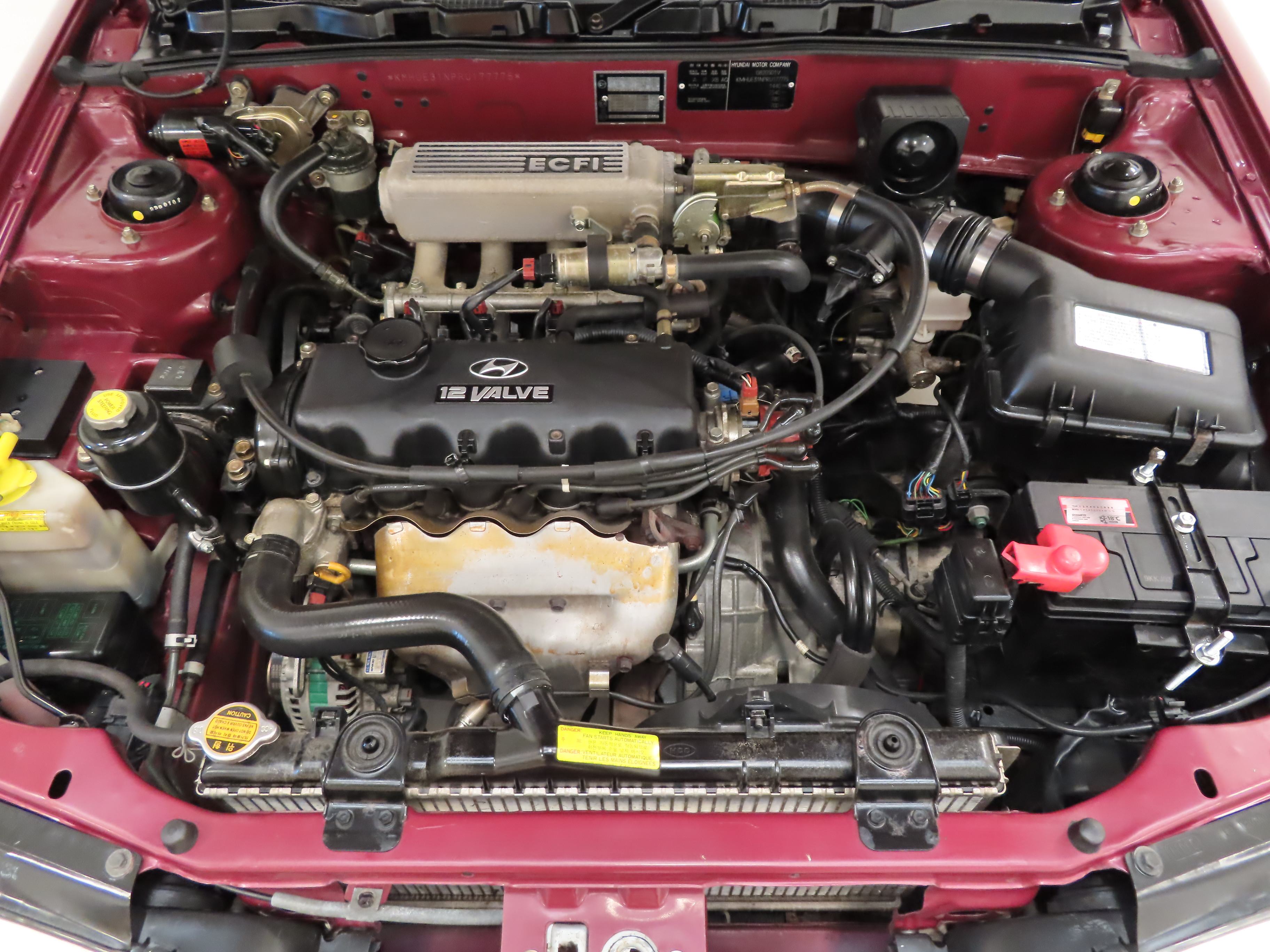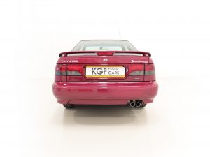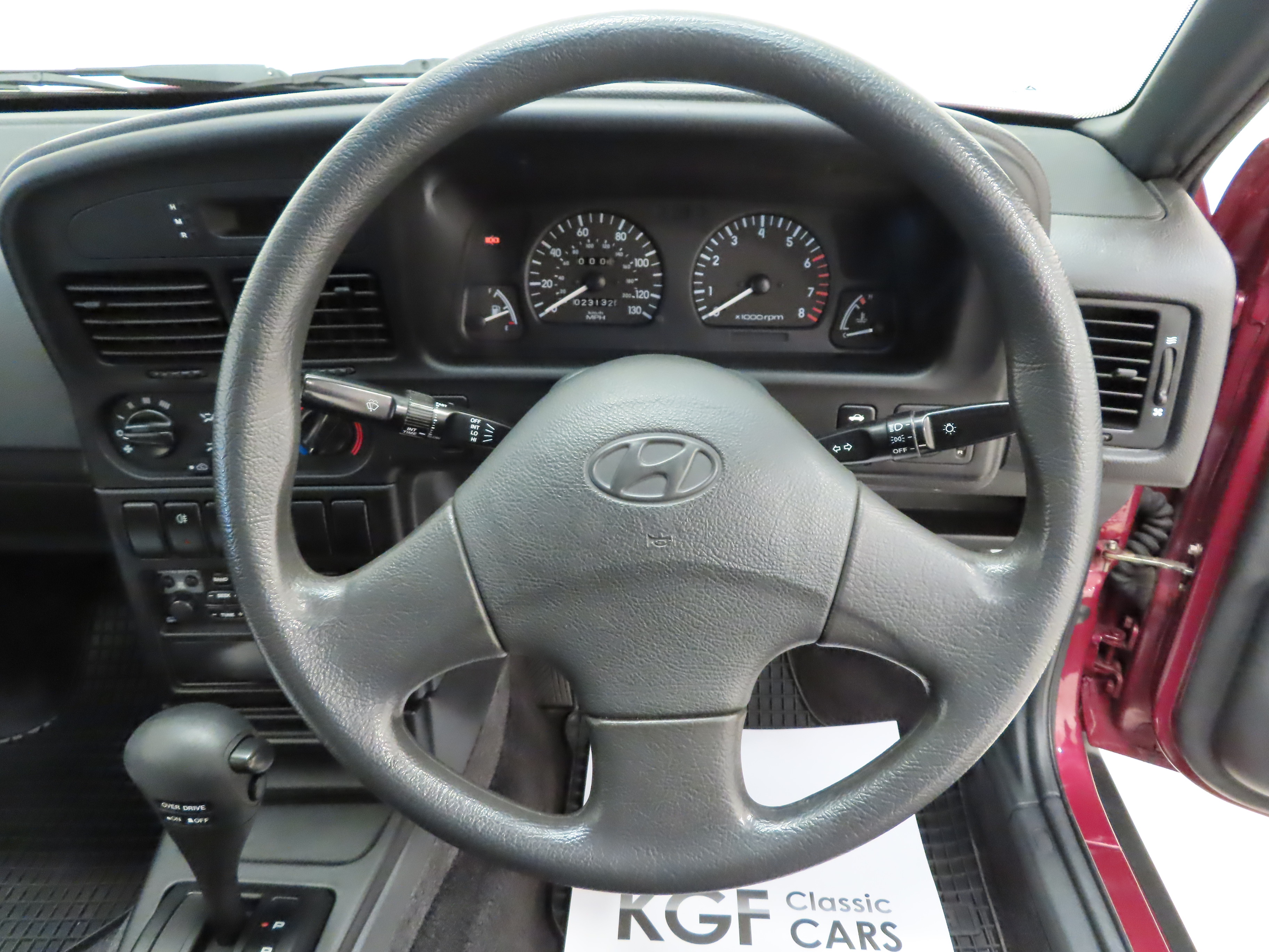 Body colour bumpers, door handles and door mirrors, body colour side mouldings and rear spoiler, anti-perforation cavity and underbody treatment, tinted glass and laminated windscreen, halogen headlamps, front fog lamps, power assisted steering, remote fuel filler release, low bucket-type front seats, Hyundai stereo cassette with 4-speakers, electrically adjustable door mirrors, electric windows to front, door ajar and boot lid warning lamp, overdrive switch ‘off’ warning lamp. Factory options; 4 speed automatic transmission. Dealership accessories; Hyundai rubber tailored over mats.