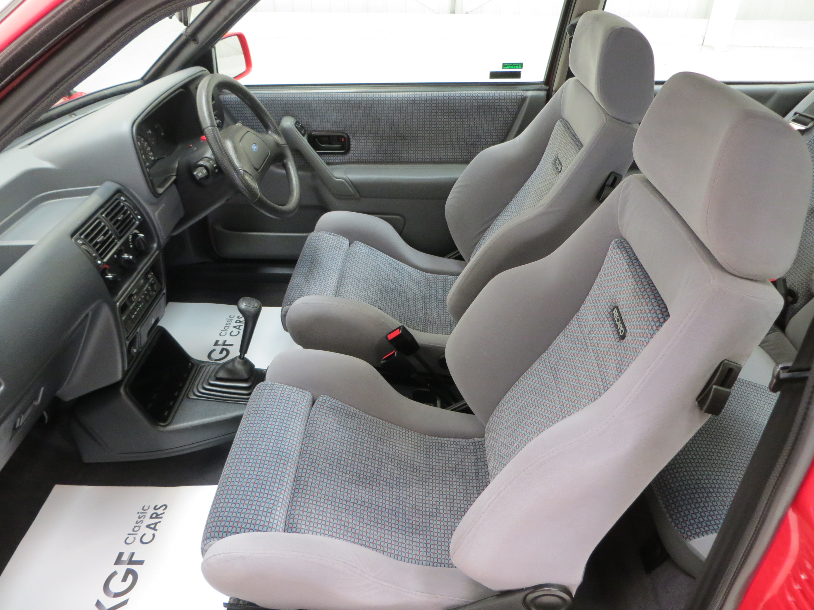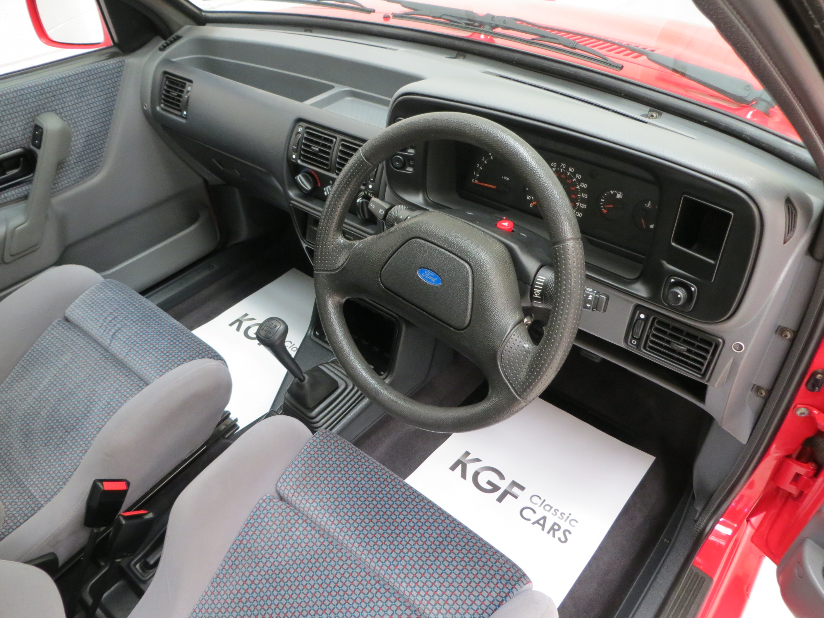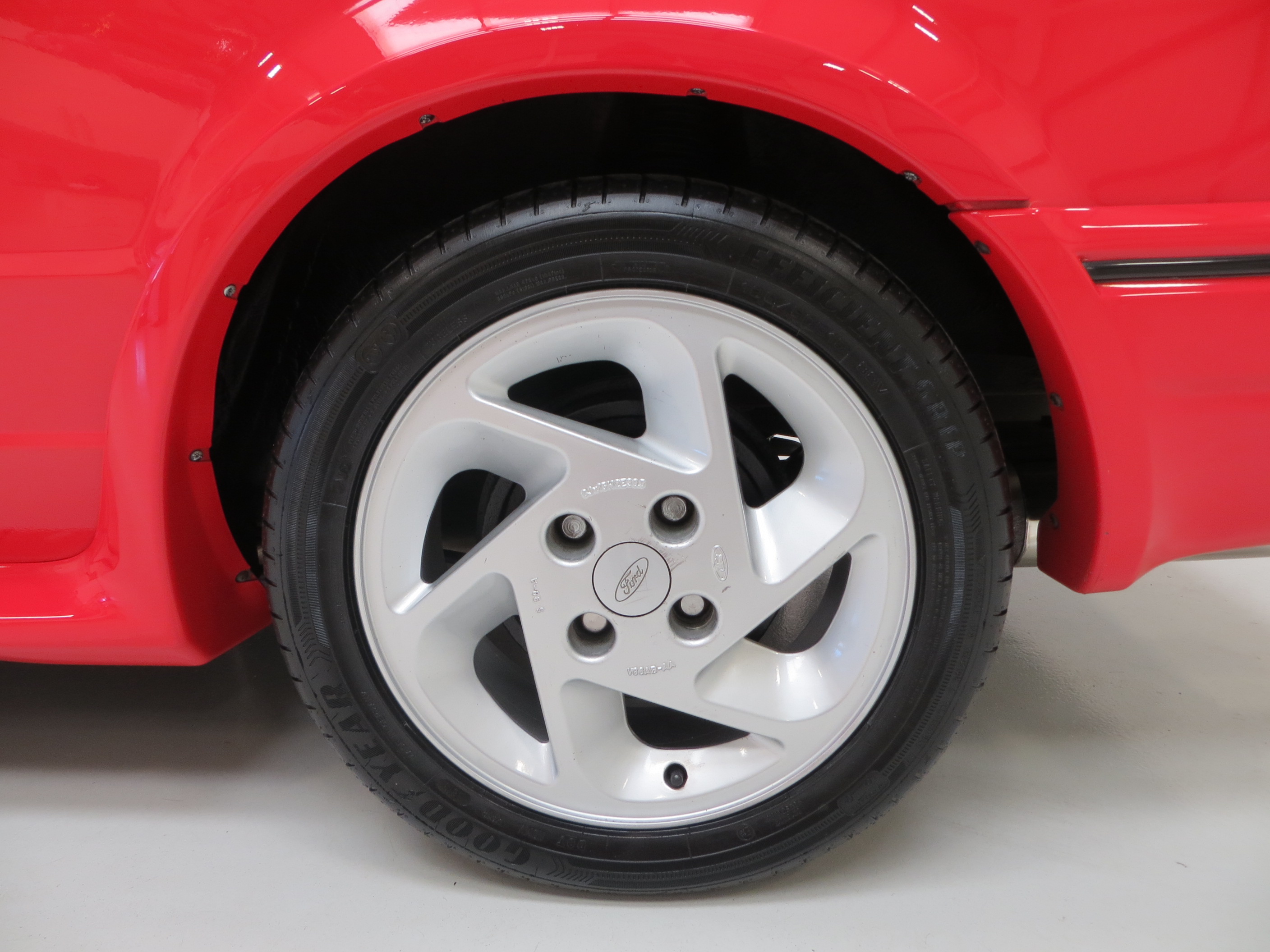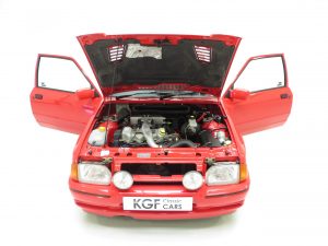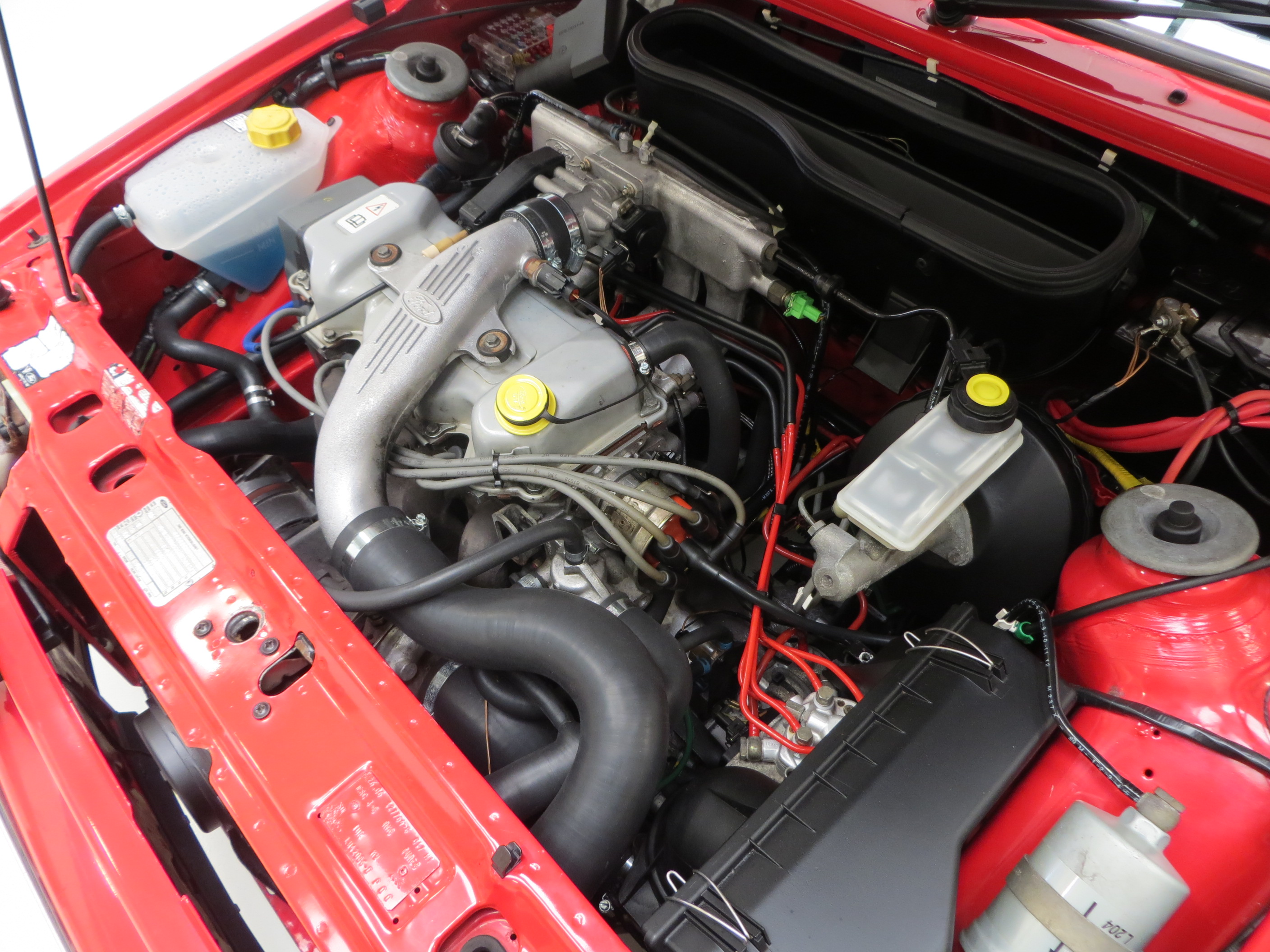 The 1.6 OHC (CVH) fuel injected engine with a Garrett AiResearch T3 turbo charger and intercooler is completely factory standard making this vehicle a rare example that is now the exception. Quoted figures of 132bhp give this vehicle a 0-60 dash of 8.2 seconds and a top speed of 128mph. The engine bay is spotlessly clean with all factory stickers attached allowing bonnet up exhibiting. A stainless steel exhaust system is fitted and new dampers. The 5-speed manual Ford BC box with standard 220mm clutch is light, precise and a joy to use.