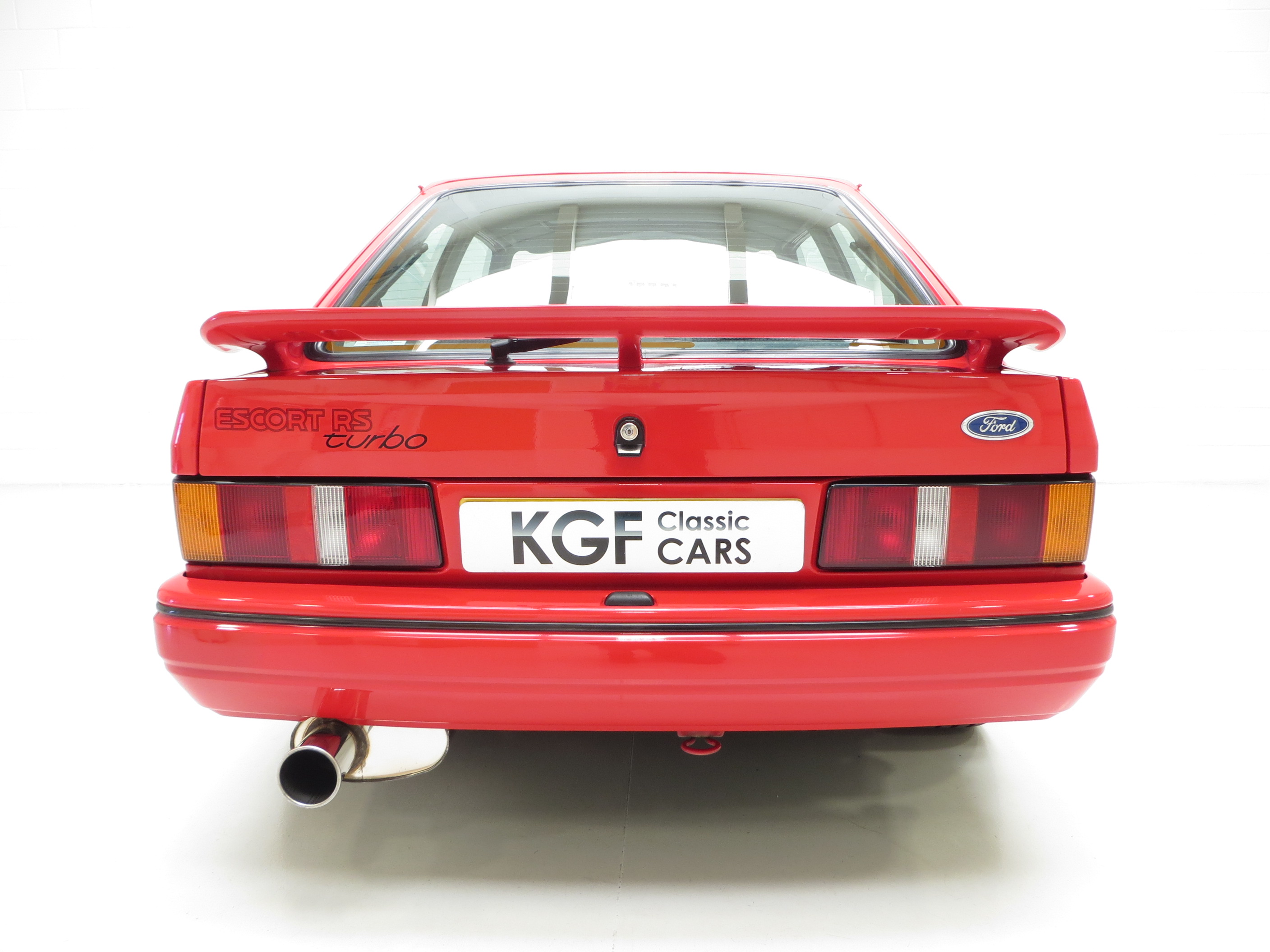 This fabulous Escort RS Turbo has a perfect and stylish interior which remains exactly how the manufacturer intended. The fully adjustable supportive Recaro seats show virtually no wear to the ‘ Zolda ‘ fabric which is grey, red and blue. The prominent side bolsters are firm and the matching door cards are pristine. The carpets were protected by over-mats (recently removed but included), again revealing the care lavished on this example. All switches, knobs and dials function correctly and the 90 spec Ford stereo radio/cassette model 2005 remains fitted with original speakers. A Laserline alarm system has been fitted. The boot area is spotless with manufacturer stickers still on the boot floor and the grey carpeted parcel shelf is straight and uncut. Truly magnificent.