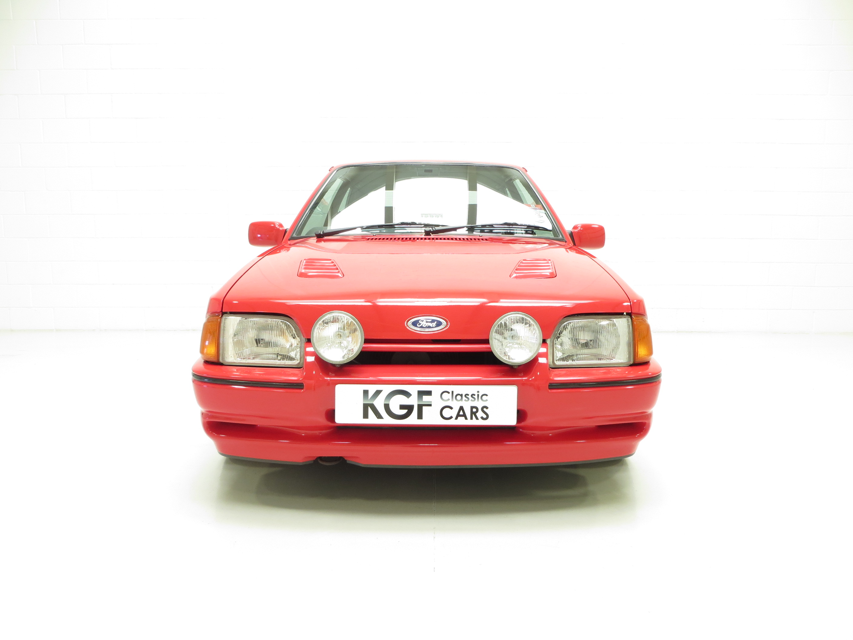 Finished in striking Radiant Red, (Colour Code P9), this character-packed RS Turbo retains all the manufacturers originality and has a polished gloss smoothness. The desirable 90 spec enhancements such as the face-lift front bumper and rear spoiler are unmarked and straight. Correct decals, aerodynamic aids and original Carello front lighting remain in perfect condition. Tinted exterior glass is security etched and the interior rubber to the rear screen has swelled in places. The front wings are date stamped and the tiny Ford logo can be seen to those who know where to look. The scuttle panel is also correctly stamped and a few minor chips to the bonnet are just visible. A very rare show piece.