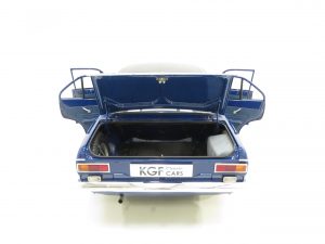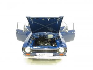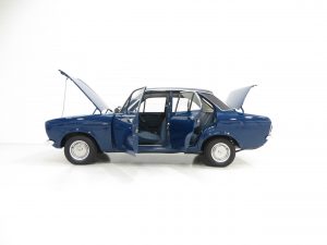 The interior of this Escort 1300L is beautifully preserved and commensurate with a low mileage cherished example. The original seat coverings in blue vinyl, (code EA) are clean and show no damage. Only faint markings to the top edge of the rear bench backrest are visible. The headlining is tight and unmarked, and the black deep looped pile carpets are in remarkable order. Two small holes and a hairline crack can be seen in the rear parcel shelf. The thin steering wheel with padded centre is in amazing order, as are all controls and rockers switches. The padded dash top and wood effect trim are both exceptional. This car really is a beautiful, unspoilt place to be and just as Ford intended.