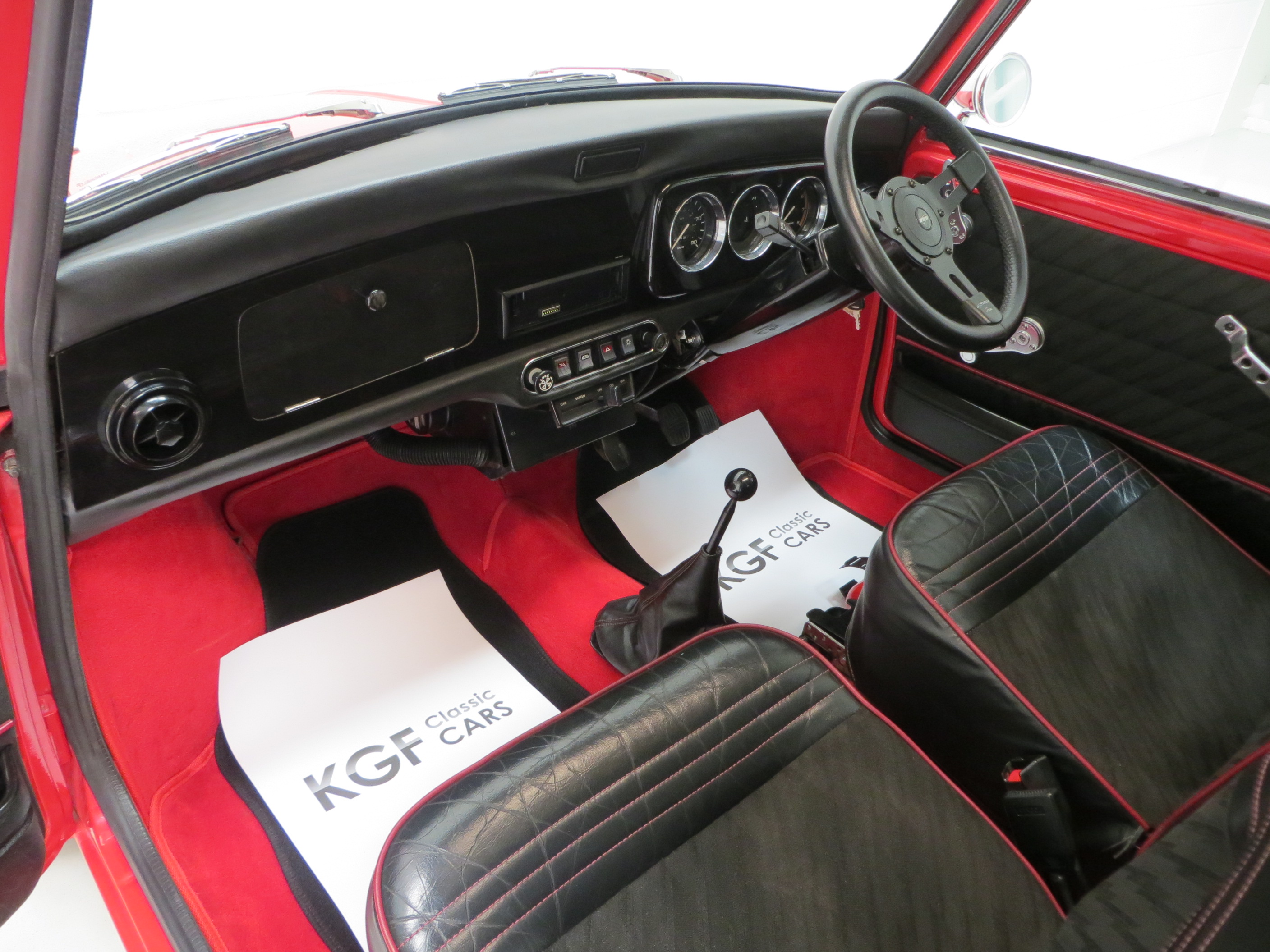 Upon entering the cockpit of this marvellous Mini, you are instantly exposed to the original Mini seats and door cards in excellent condition. To lift the interior, a set of quality bright red carpets have been professionally fitted and features such as the Piano Black dashboard, chrome fixtures and Mountney steering wheel complete the look. One of the project parameters was to ensure that the original Mini charm was preserved, a goal that has certainly been achieved with the work carried out to the interior. A beautifully clean interior with only subtle hints towards what lays beneath the bonnet, very exciting!