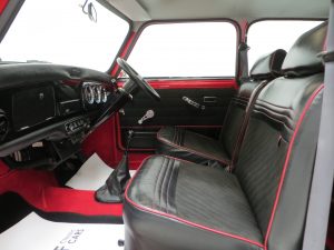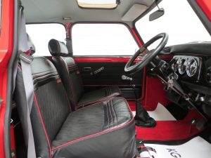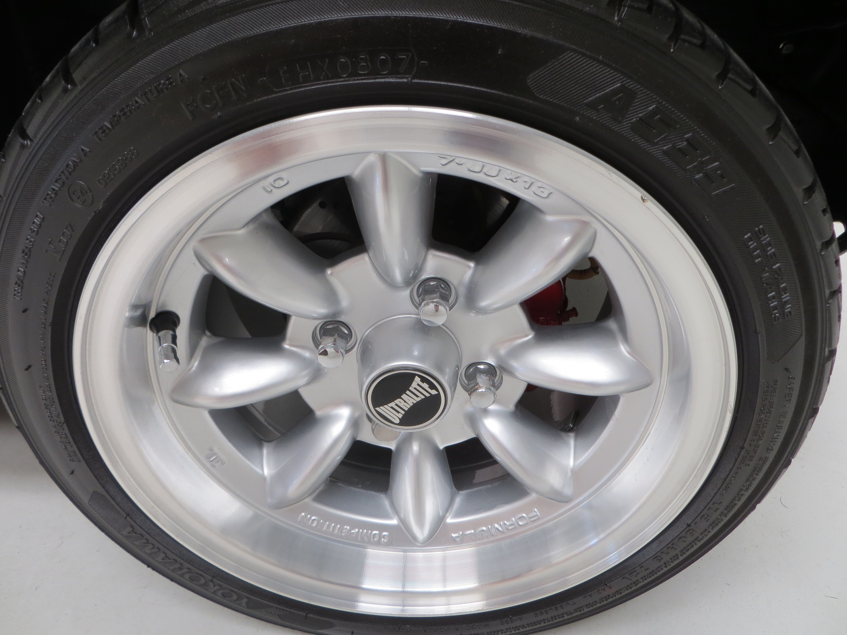 Ultralite 7×13 alloy wheels with polished rims are fitted, including the spare, with matching quality Yokohama 175/50 R13 tyres. These beautifully crafted rims are complimented by a Group 5 Race wheel arch kit to offer an extreme sporting look. This Mini stops as well as it goes with a vastly uprated braking system to include Mini Braided turbo Metro vented four pot callipers and Braided Aeroquip hose kit.