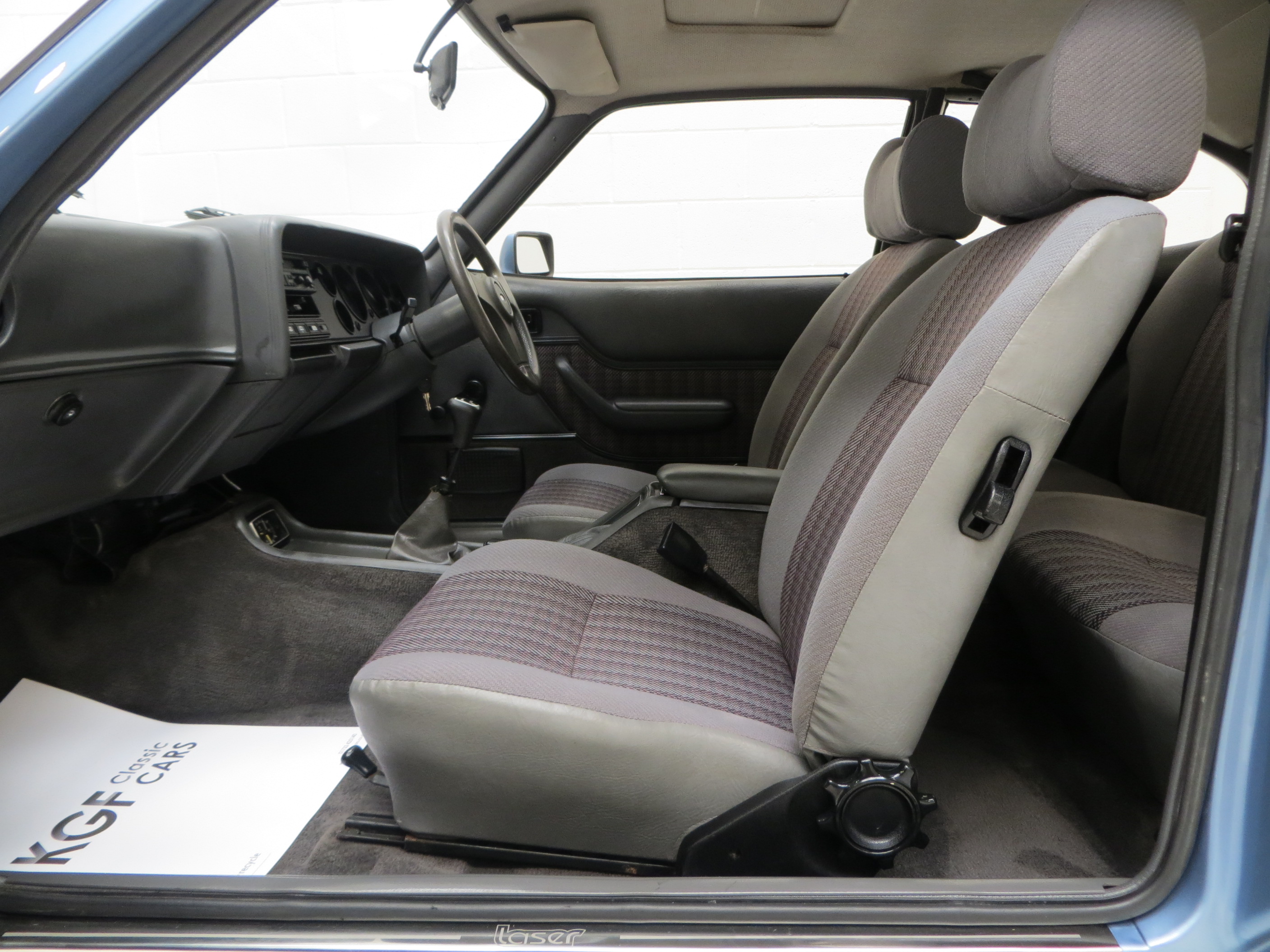 This incredible special edition Laser was built as a run out model of the Capri and is beautifully finished in Ford Paris Blue (code 35), a cost option when new. A deep mirror shine from the stunning paint finish is worthy of pride of place at any show, with only a tiny marking is visible where the offside wiper arm meets the scuttle panel. All factory fitted panels are straight with linear gaps and the exterior trim items and decals are pristine to firmly cement the fantastic appeal of this very special car. A clean underside free from overuse of underseal allows inspection to see the good structural integrity. Hard to source fitments such as the rubber spoiler and colour coded front grill are excellent. The supplying Ford Main Dealer rear screen sticker remains fitted. This unmolested example remains exactly as Ford intended and is certain to delight the blue oval enthusiast.