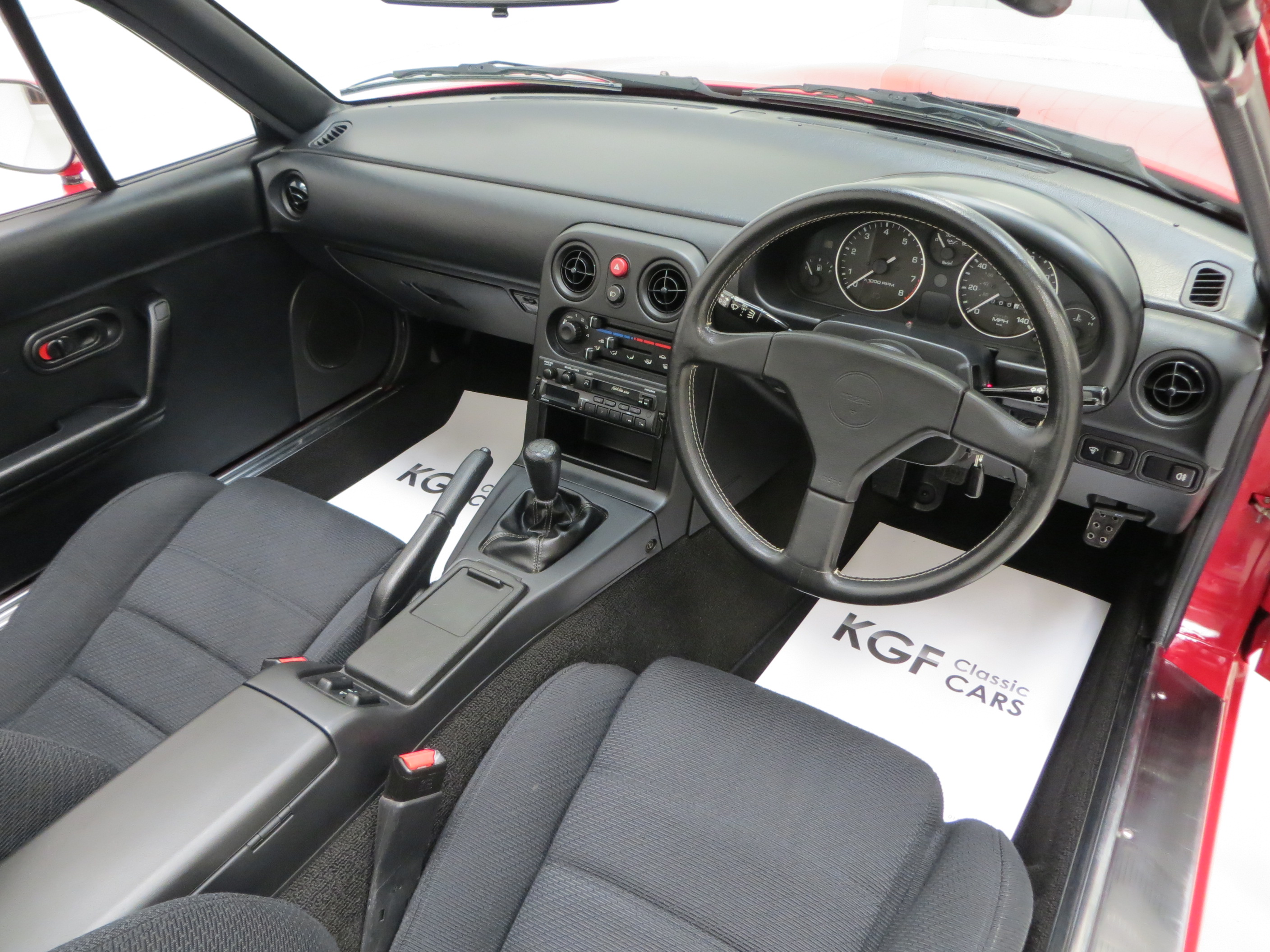 Trimmed in the standard Black Cloth upholstery this interior is exactly how Mazda intended. Everything is co-ordinated and operates perfectly. The spotless high backed seats have integral headrests offering maximum comfort and support and show virtually no wear. The driver’s seat has a small section of bobbling to the fabric. The classic sports dashboard houses a cluster of crystal clear instruments that function precisely and retain a new car feel. The leather trimmed steering wheel with pristine white stitching is as new and factory applied stickers to the lower dashboard remain. A Moss alarm module is neatly fixed between the seats and the original Clarion Finish Line 540 stereo cassette is still fitted. The iconic MX5 sports car interior ready to take you back to a 1992 Mazda showroom!