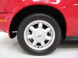 This exceptional Mazda retains its factory fitted 14” alloy wheels which are shod in quality matching Bridgestone Turanza 185/60R14 tyres with excellent tread remaining. The unrestored wheels show minor age related markings but still have prominent factory stampings which are otherwise lost upon refurbishment. The tool kit, wheel brace and covered space saver wheel are all present and spotlessly clean. Ventilated front and solid rear discs install maximum braking confidence.