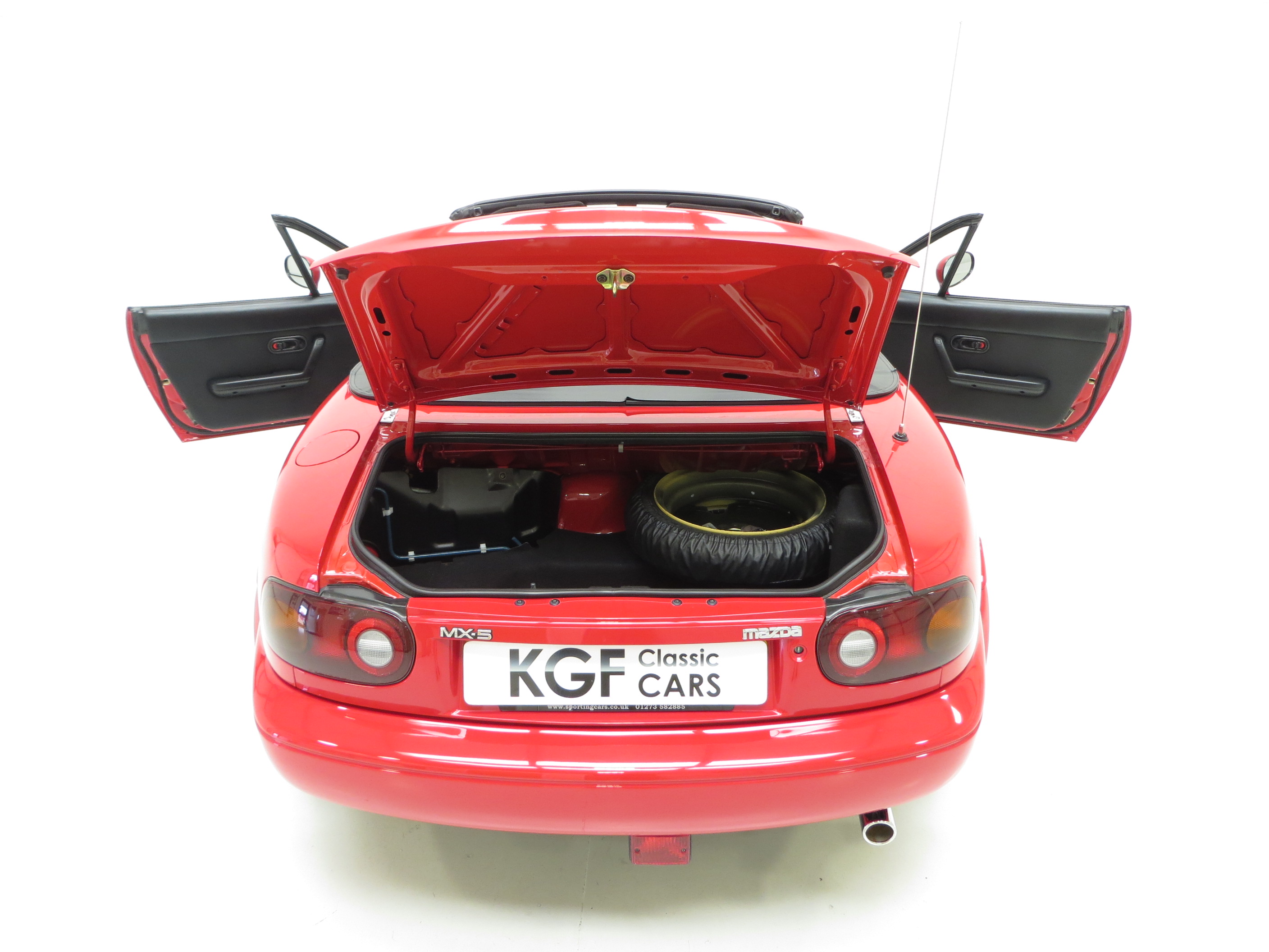Laminated windscreen, retractable halogen headlamps, bright finish door handles, colour keyed bumpers and outer mirrors, colour keyed mud guards, manual folding black canvas soft top, rear tonneau, side impact beams, suspension brace bar, vehicle immobiliser, tachometer, leather steering wheel and gearknob gaiter, bucket seats, interior light, cigar lighter and ashtray, locking glovebox, locking centre storage box.