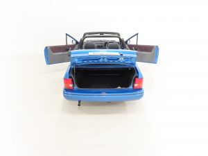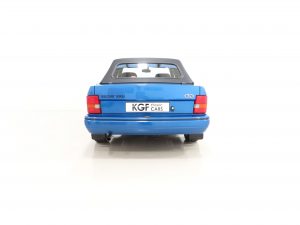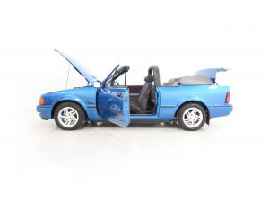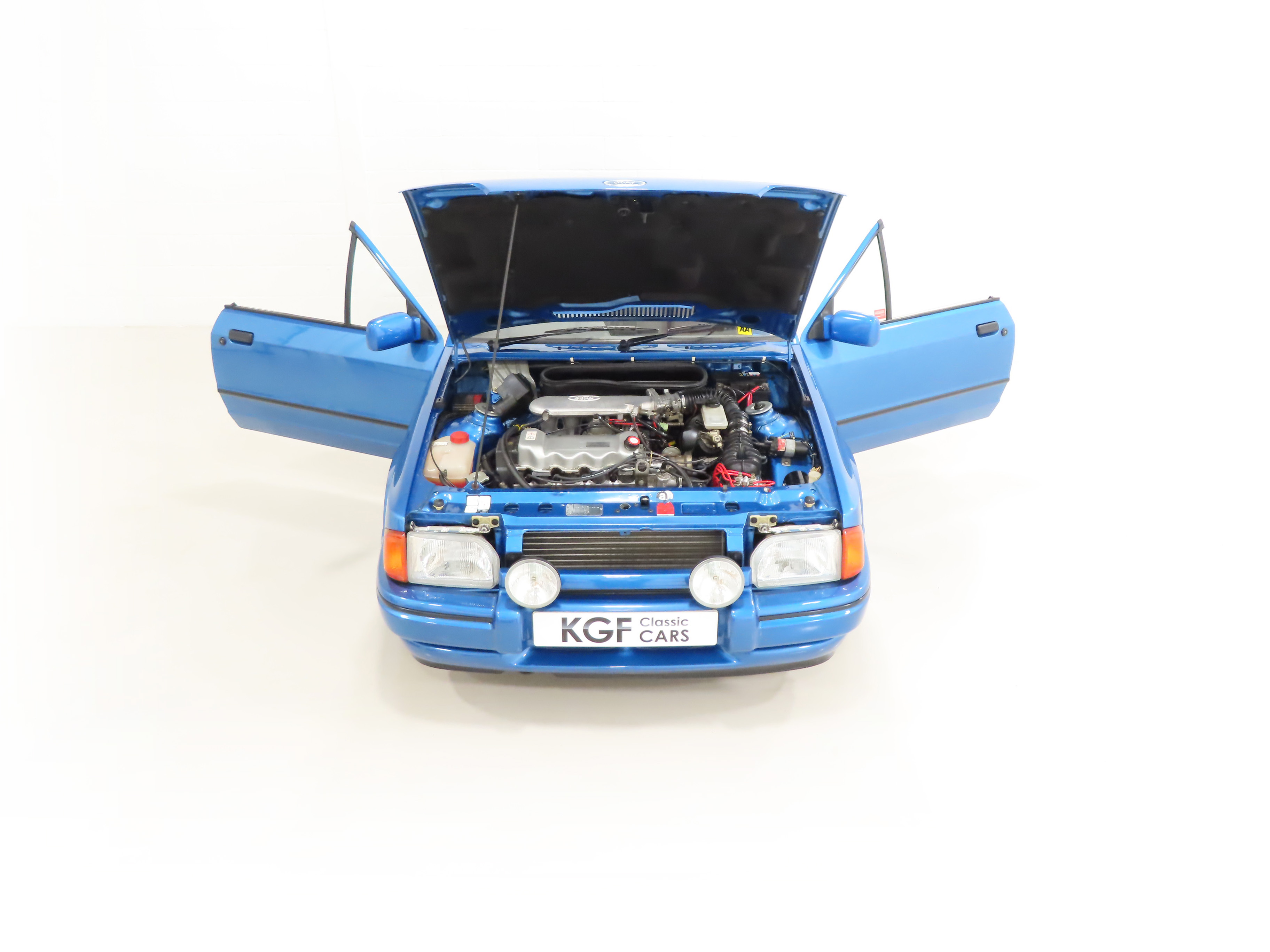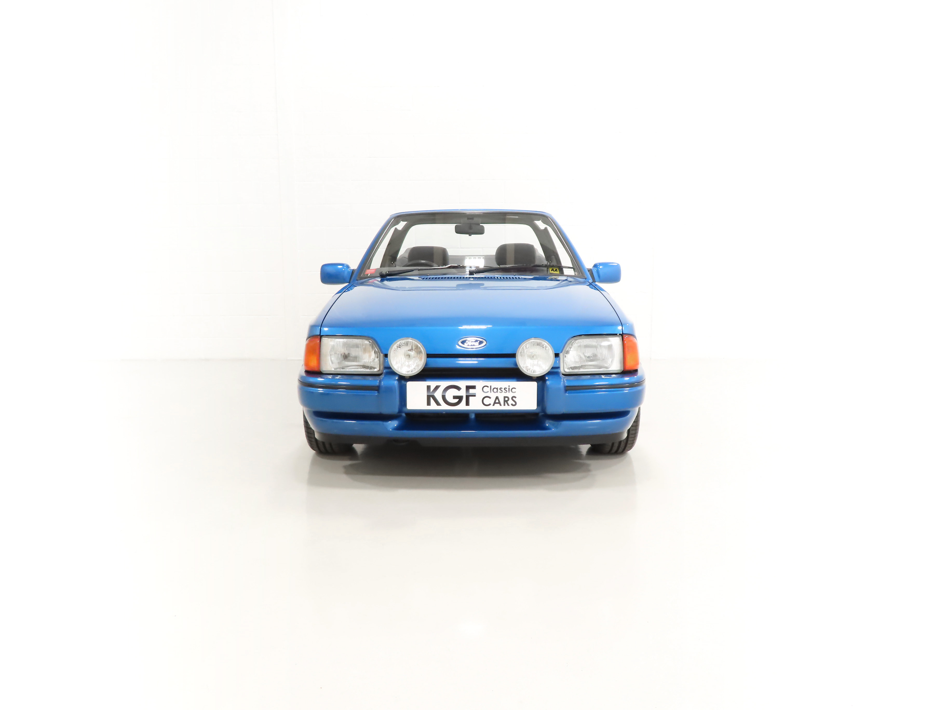 A beautifully clean, original and unspoilt example of a rare sporting hot cabriolet with the iconic XR3i name. Finished in factory optional Azure Blue Metallic with a Black vinyl roof, (Code TA4), the finish is uniform throughout with a stunning deep shine and the original soft-top roof in superb condition with no damage whatsoever. The colour keyed hood cover for use when the hood is lowered is present. Nothing other than very light touched in scratches and stone chips are visible. The panels on this example boast factory fitment with date stampings clearly visible and the underside is free from excessive underseal allowing easy inspection and revealing perfect structural integrity. Not only does this model have exhilarating looks with colour-coded trim, XR3i decals, and Ford driving lights, but 80% of the Cabriolet bodyshell panels were either new or modified to maintain strength and eliminate rattle when new. All glass is factory fitment with original stickers and the light clusters are genuine Carello and Ford fitment. The supplying Ford dealer number plates remain fitted. A prime example of a soft-top FastFord.