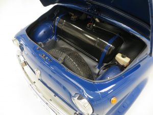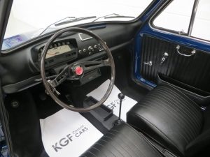 The interior styling of this classic Italian supermini is every inch a fashion icon and epitomises chic design. The Black vinyl seats with matching door cards and padded dash rail are in remarkable condition with no tears or damage. All original functions and controls operate perfectly and the floor mounted choke control and starter remain. The flat band style speedometer and warning lights function. A fully detailed front luggage compartment houses the spare wheel and rubber holding strap. A period Jaeger clock and modern 12v power outlet and CD player have been professionally installed. This is a lovely understated interior which is true to design.