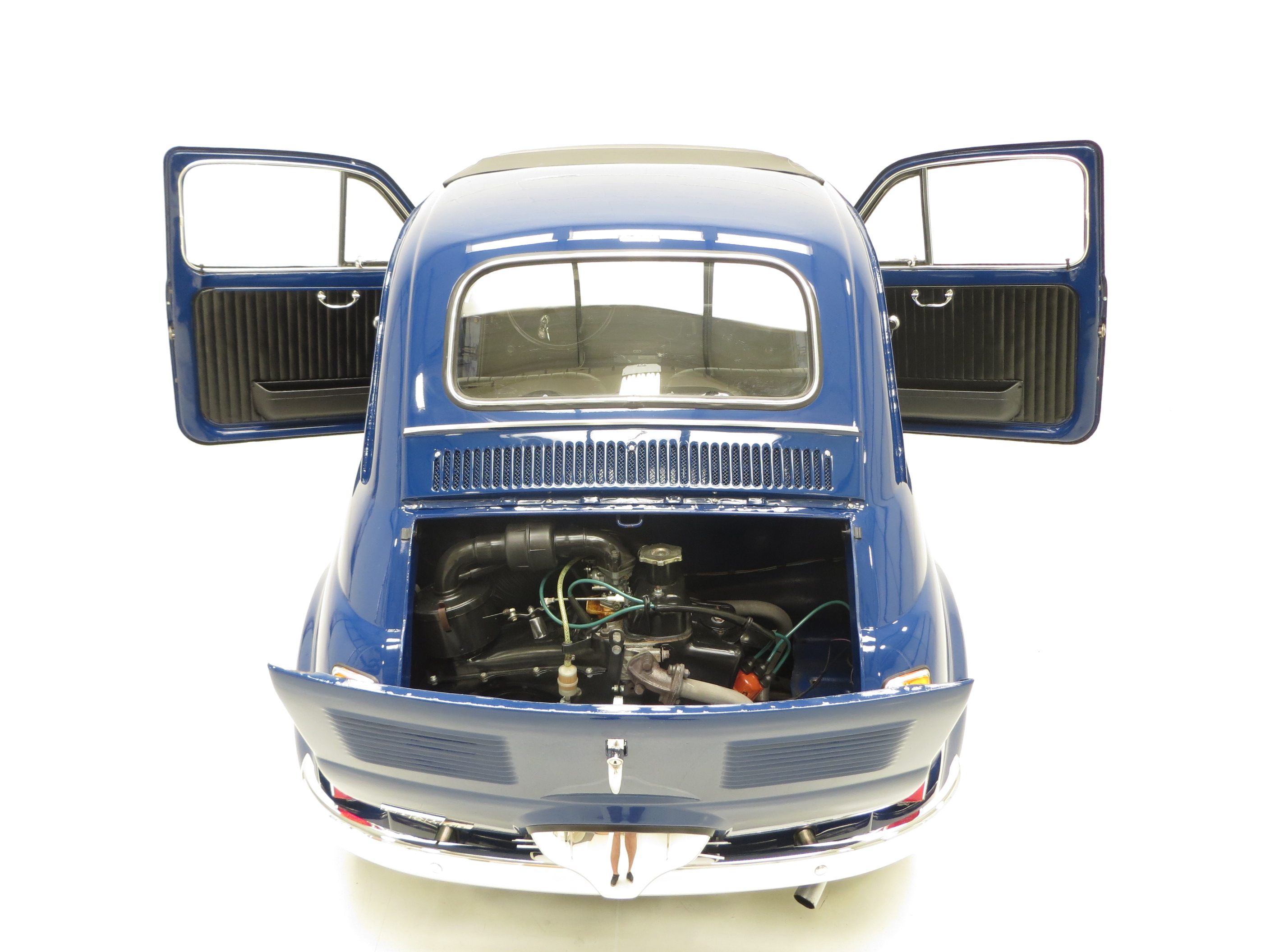Finished in the gorgeous colour of Blu Scuro, (Code 456), the paintwork boasts a deep luscious shine which suits the cheeky characteristics of this most famous of little Fiats. All quality chrome and brightwork trim is present and remains in excellent order as do the Fiat badges. The window rubbers with chrome inserts, door rubbers and sunshine roof have all been recently replaced in this high standard and catalogued restoration. The underside presents fabulously with components and floor pans Waxyol protected. Delightful in every respect.