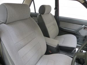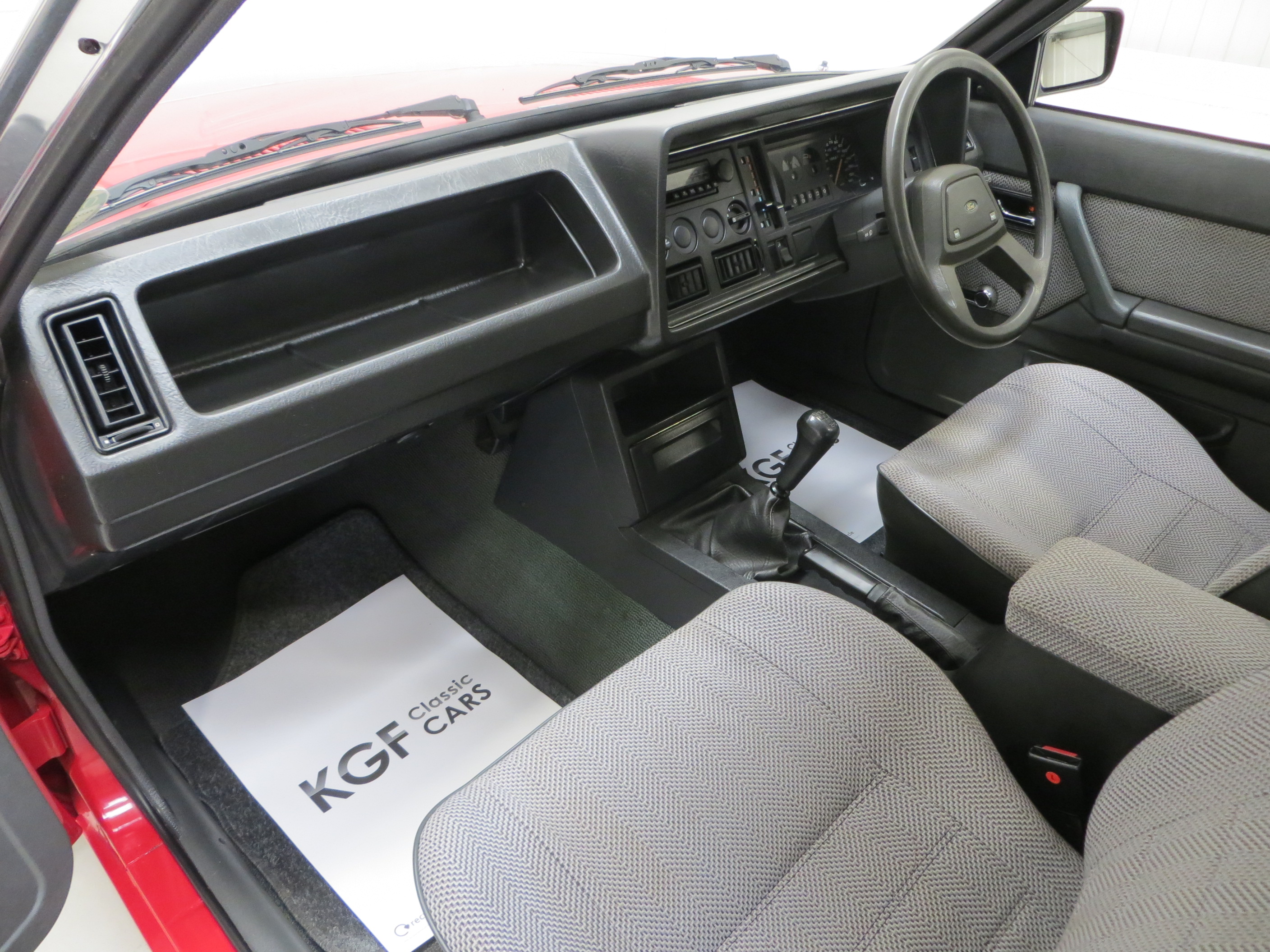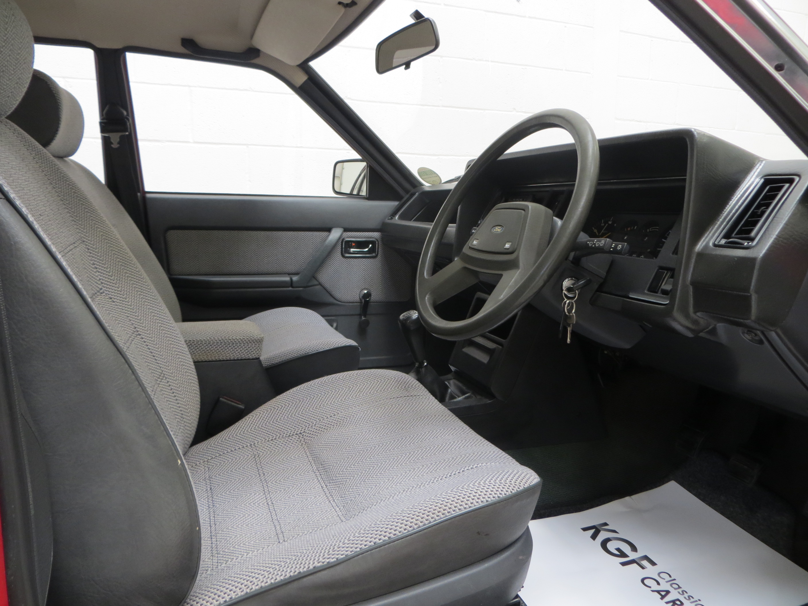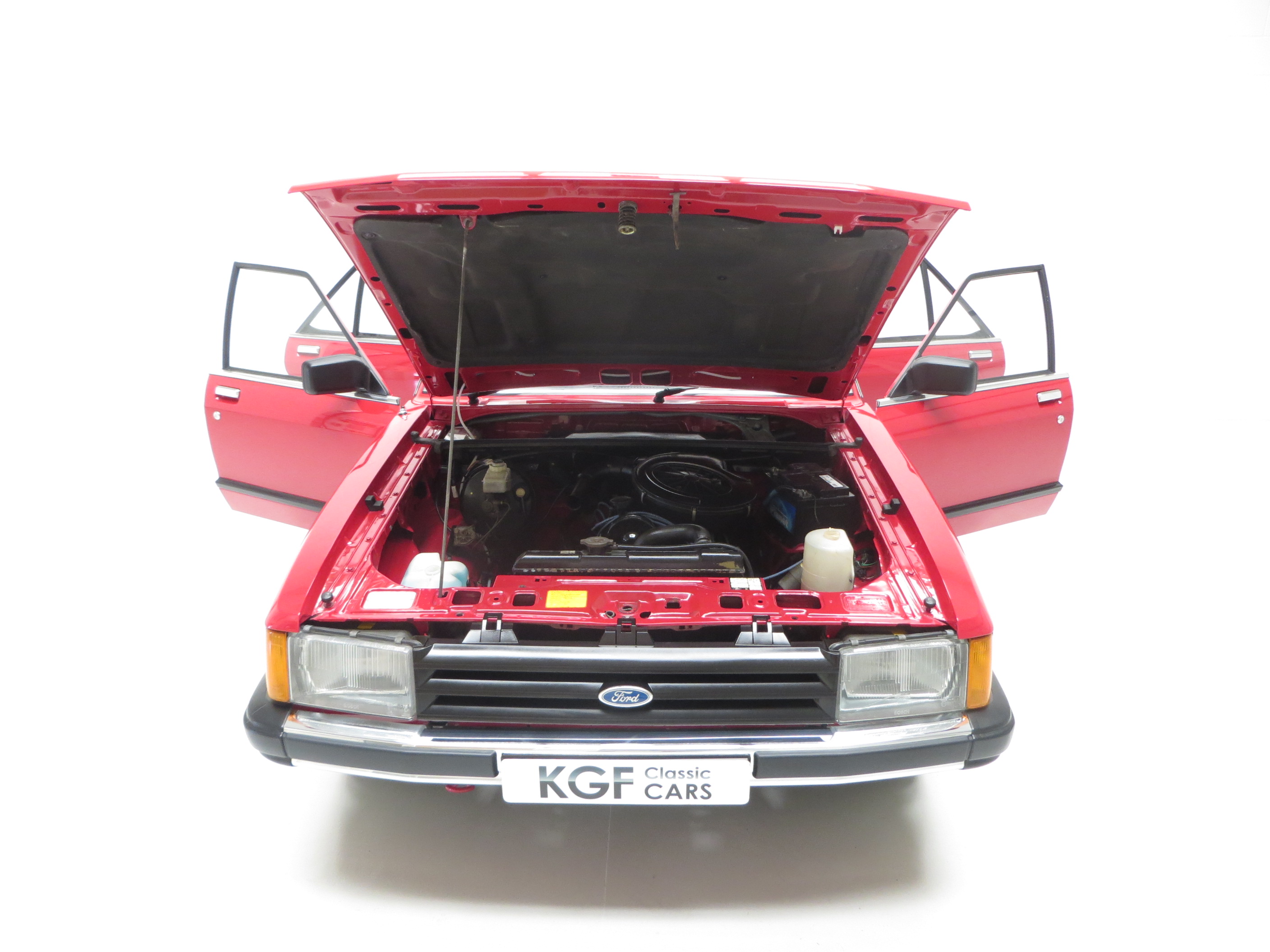 Owing to the low mileage and cosseted ownership the Grey Truro fabric seat trim and door cards, cut pile carpets and factory materials throughout are exemplary. The intricate seat pattern is still clearly visible having been protected by wooden beaded seat covers, still included! The headlining is tight and spotlessly clean and all controls function correctly including the Quartz clock and three speed heating fan. Two hairline dash splits are barely visible and the boot area is as new with the liner and even the factory colour code sticker in place. Comfortable perfection and exactly how Ford intended.