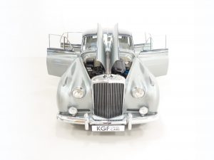 Chrome radiator grill, Bentley flying ‘B’ bonnet ornament, chrome bumpers with moulded over-riders, dual bonnet openers, double dipping headlights, ride control switch, power steering, twin foglamps, central chrome bonnet running line, chrome wheel covers, inspection lamp socket, loudspeaker balance control, adjustable elbow rests, front and rear picnic tables, locking cubby box, interior radio aerial retraction knob, rear window de-misting, roof companion and boot lamps, remote petrol filler flap, low fuel warning lamp, ammeter, oil pressure, water temperature gauge, front and rear cigar lighters, rear leather hand pulls and personal mirrors, small and heavy tools, inspection lamp, jack, tyre pump.