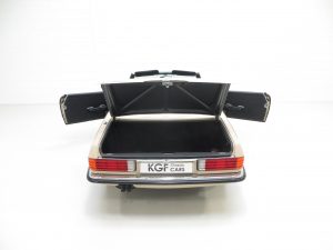 Large wide-opening doors give convenient access to a simply outstanding interior, one which truly deserves the often misused term of ‘time warp’. The spacious interior is tastefully upholstered in full black leather (code 031) with matching colour scheme carpets. The seats are in pristine order with no discolouration or cracking and the deep pile carpeting throughout has been protected by original fit Mercedes-Benz over-mats. The wood veneer is preserved and the fascia is perfect. All the gauges, controls and electrics operate exactly as they should, as does the factory optional Blaupunkt Cambridge M23 stereo cassette. The original jack, first aid kit and even the dealer supplied Mercedes valet kit and wheel changing guide are stored alongside the spare wheel! The boot area has factory build stickers present. The interior of this super low mileage example is essentially flawless and has been preserved in A1 condition. A comfortable refined and ergonomically designed environment.