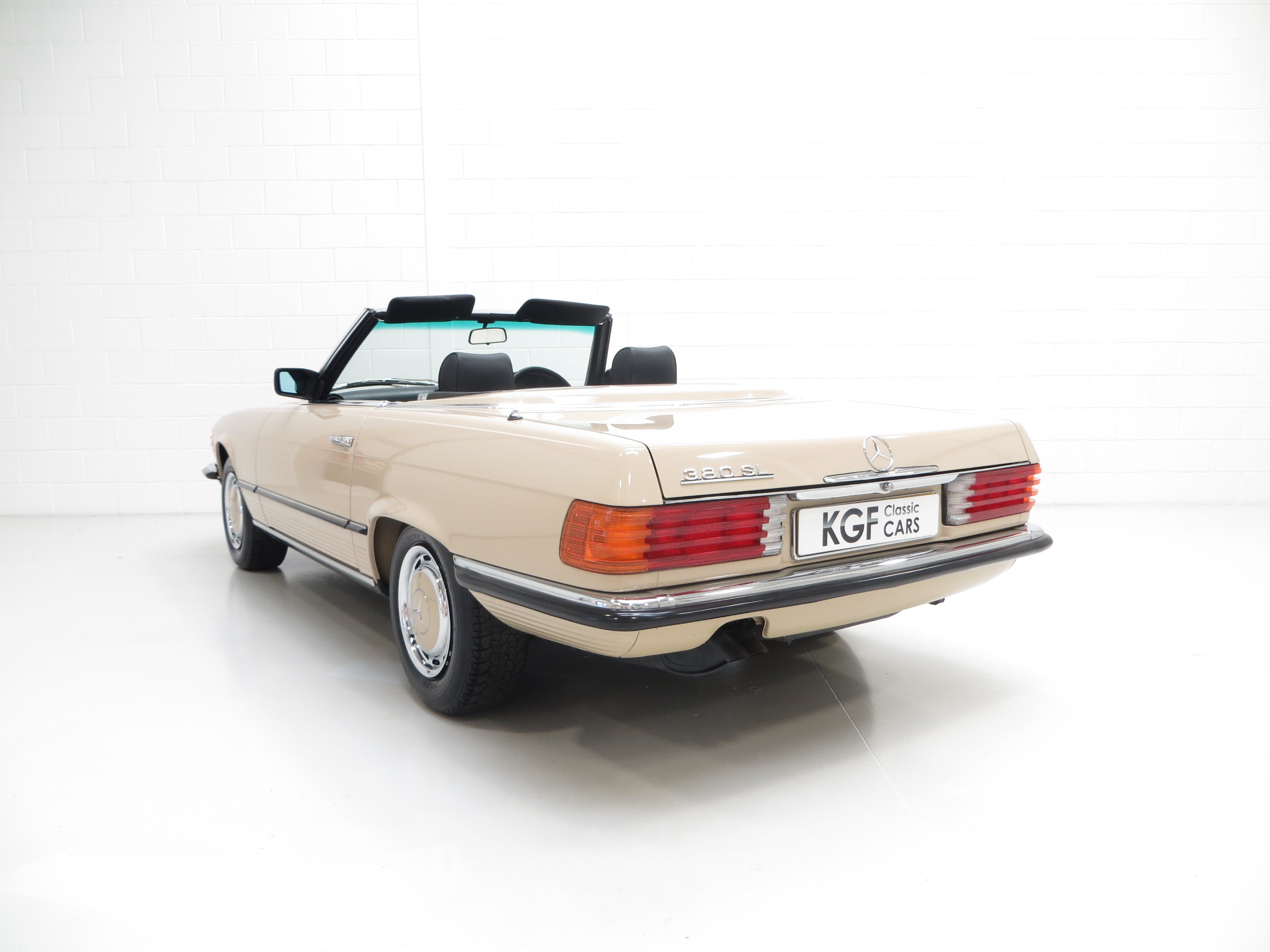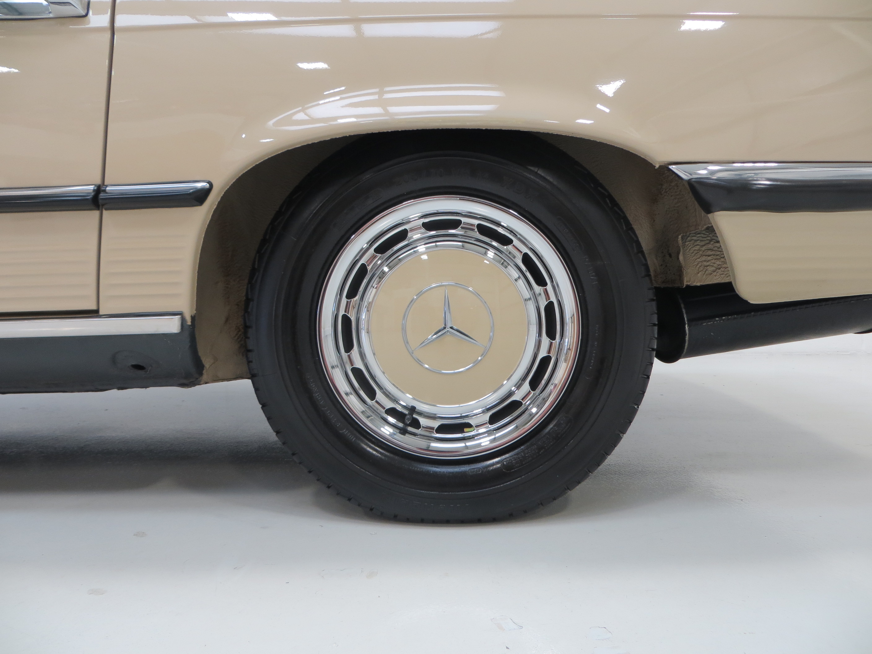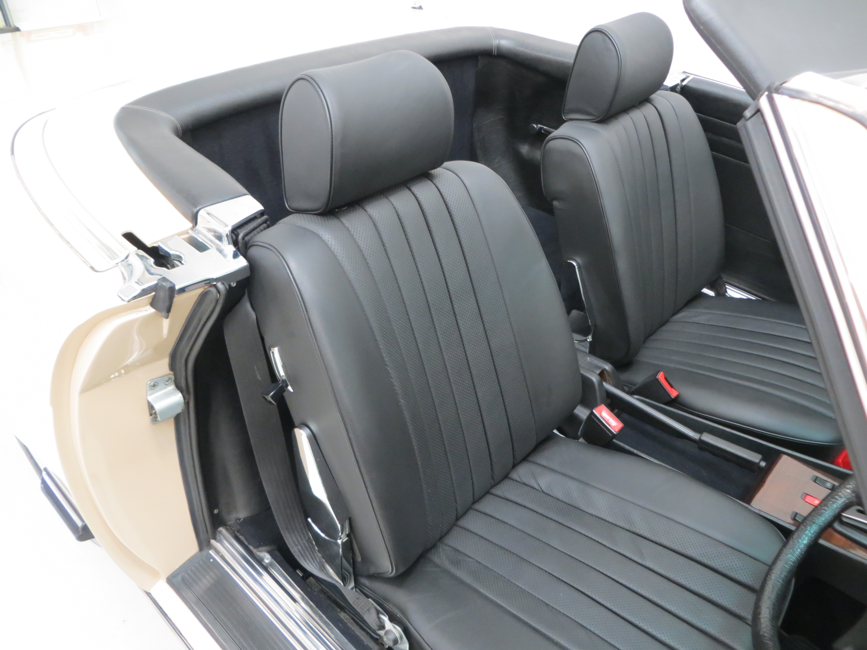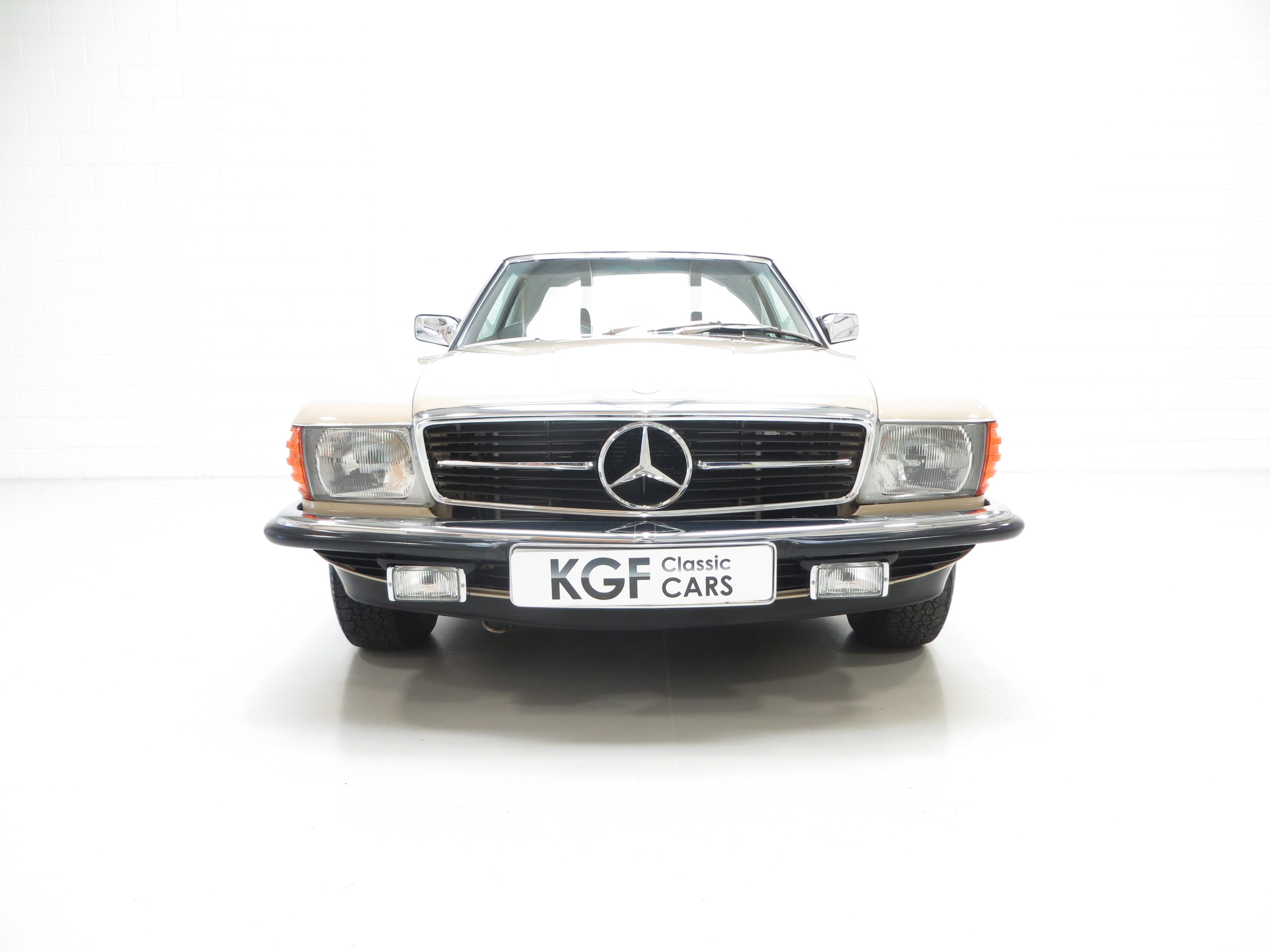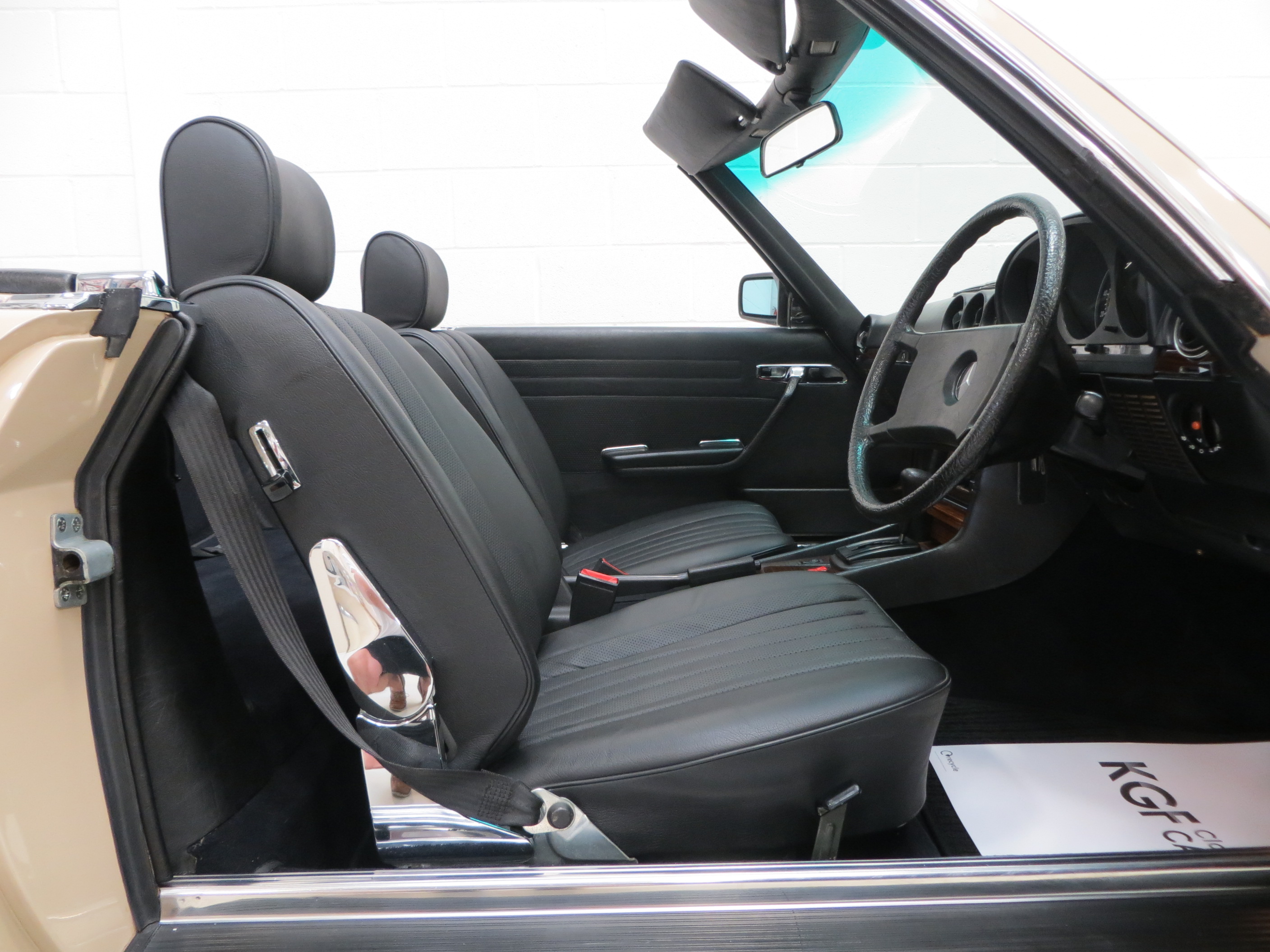 This classic Mercedes-Benz Sport Leicht (SL) is finished in factory original Pastel Beige (colour code 684) which boasts a magnificent finish and show winning shine. The instantly recognisable lines of the R107 series are elegant yet subtle and this example is surely one of the best there is, commersurate with the incredibly low mileage and cosseted existence this superb car has enjoyed. An absence of excess underside protection enables inspection to reveal factory underseal and stickers still affixed to the exhaust system! The Black hood (code 740) is clean and free from rips or tears, as are the side and rear hood windows. The original colour coded hard top with supplying dealer Bradshaw Webb sticker remains with the car and is perfect. All the chrome has a mirror finish and trim sections and rubbers are virtually as new. An exceptional vehicle from an era when the name Mercedes Benz stood for exemplary build quality and engineering prowess.