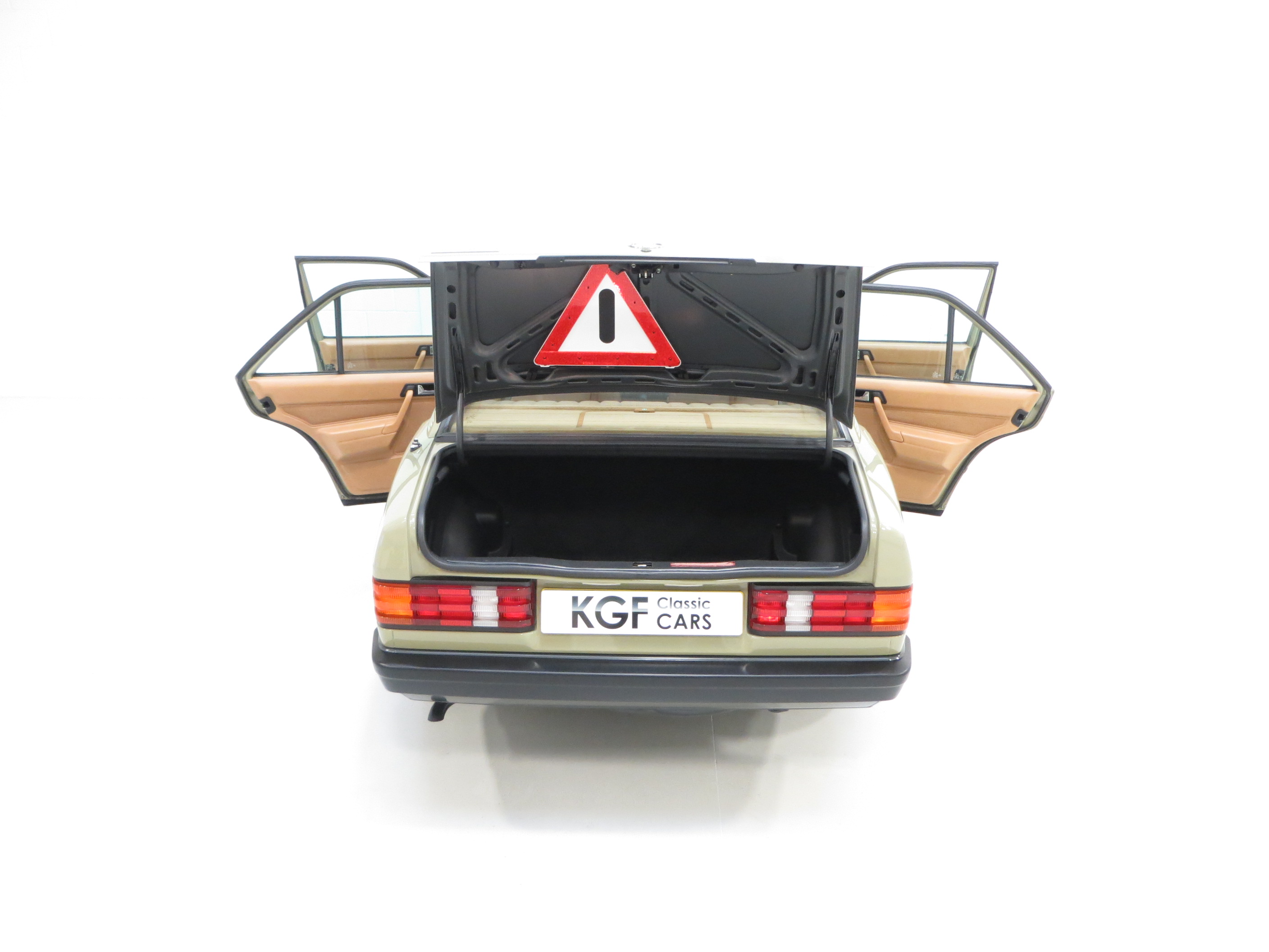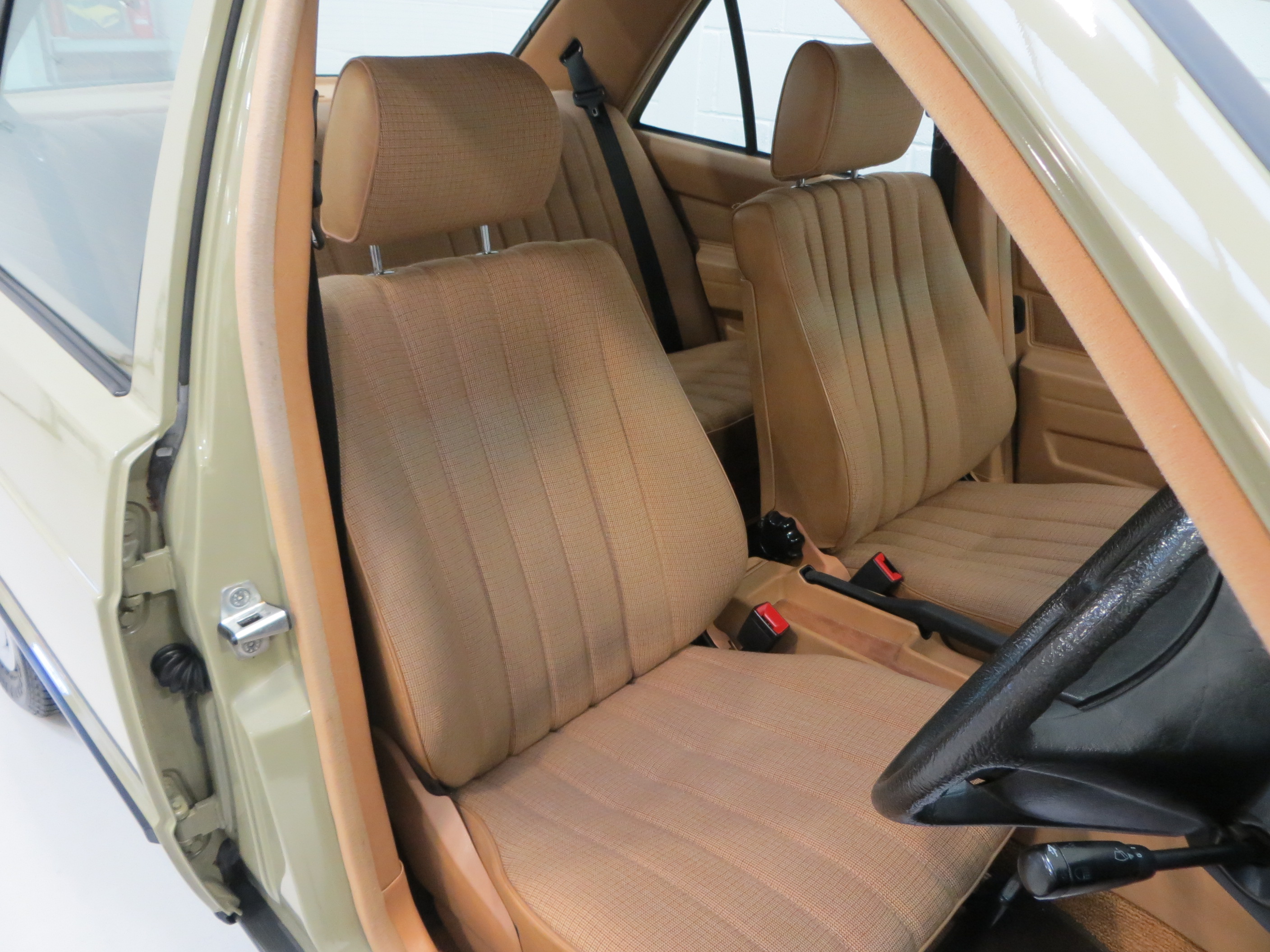 The ergonomically designed interior of this example is truly remarkable. The highest quality materials and first class workmanship can be felt in every feature from the positively contoured seats trimmed in original mid brown, (code 054), to the precision made and fully functional switchgear. A tiny five pence piece sized area of the driver’s bolster has rubbed slightly thin in comparison to the otherwise flawless upholstery. All carpeting has been protected with Mercedes-Benz over mats from new and the headlining is tight and spotless. The boot area is perfect with the tool roll, spare wheel and warning triangle correctly stored, in addition to the boot floor carpet which has factory tags still intact! The original first aid kit is stored in the rear parcel shelf compartment and there are service stickers still affixed to the driver’s door shut. An impeccable and well preserved cabin space, the epithet of classic motoring comfort.