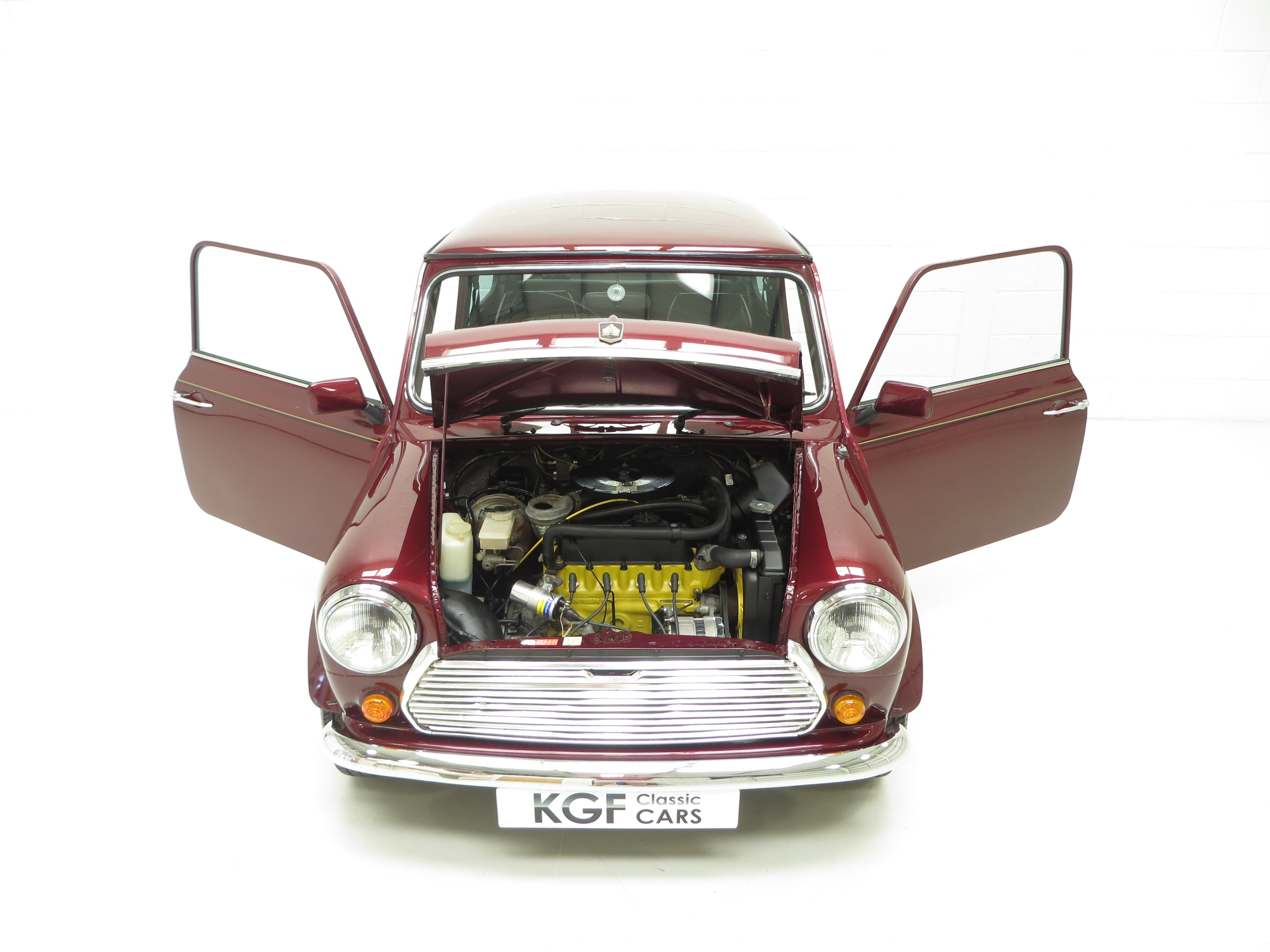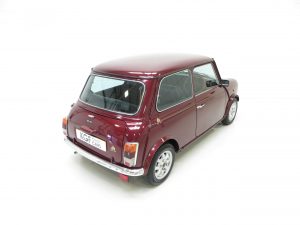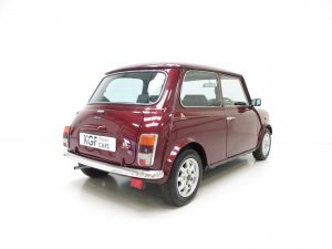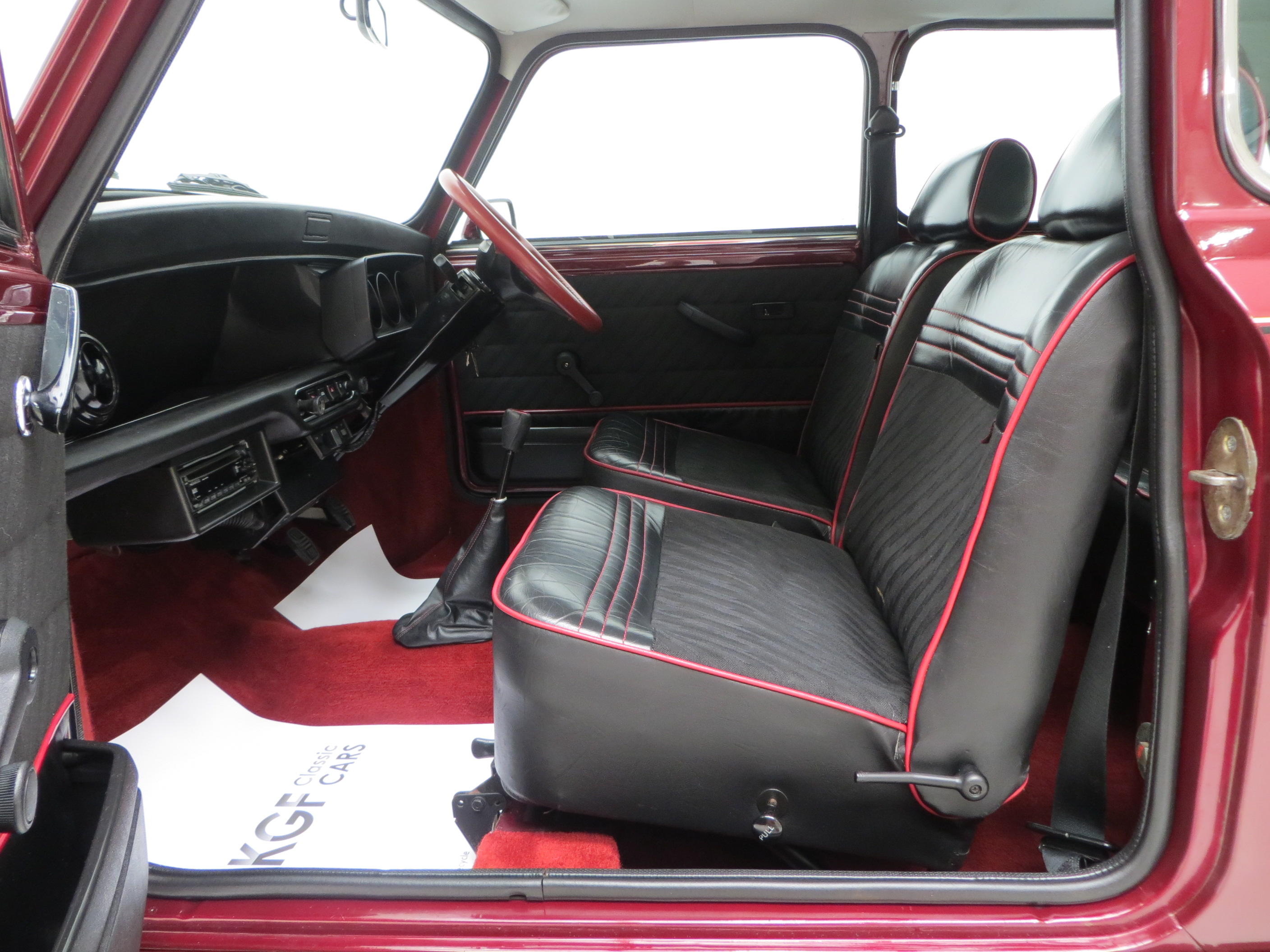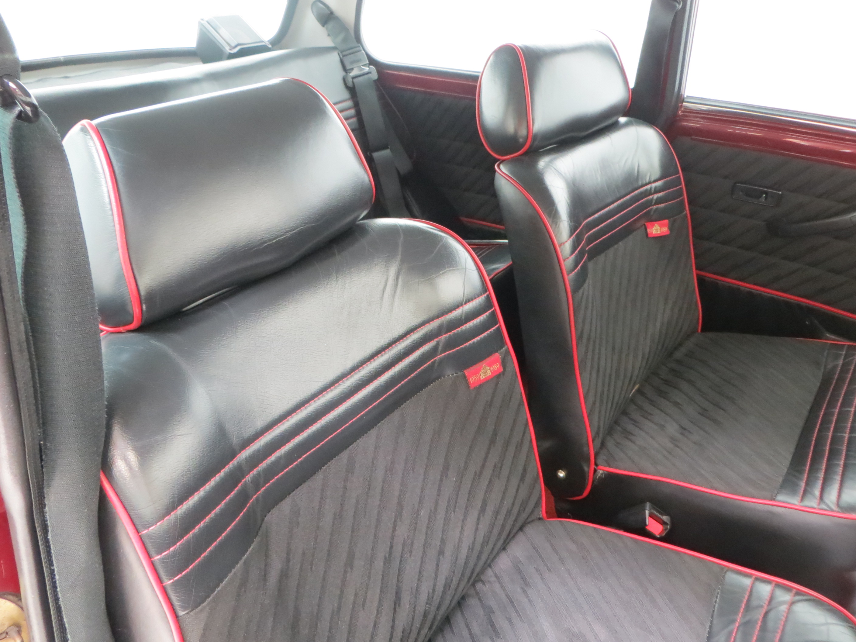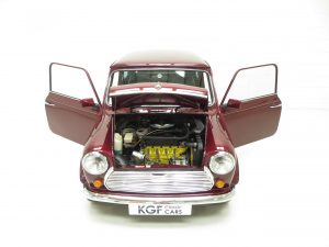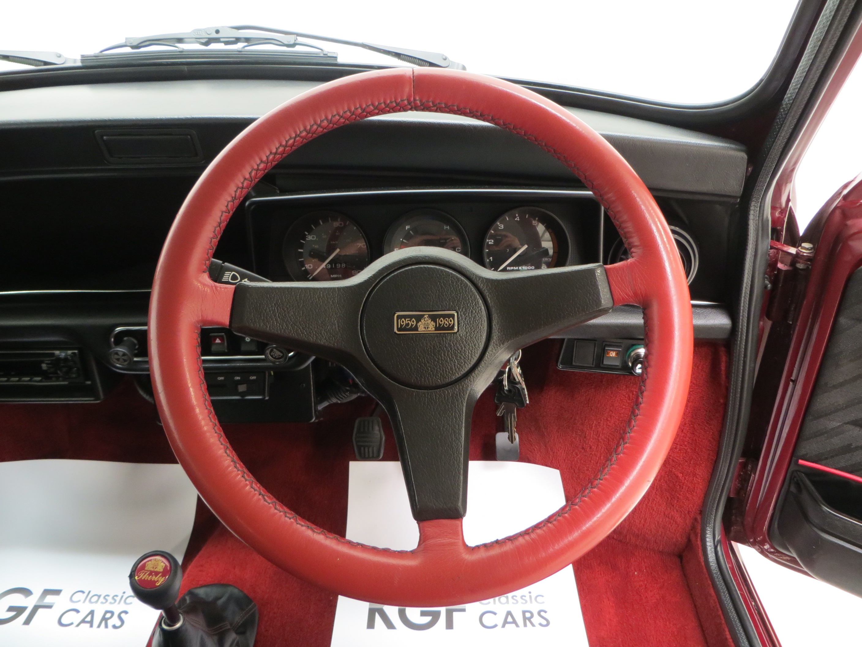 The interior of this outstanding Mini Thirty is in fabulous original condition. The seats are finished in the elegant blend of black leather and ‘Lighting’ cloth (code PMA) with the important ‘1959 to 1989’ tag neatly sewn into the seat. Two tiny nicks to the driver’s seat base and one to the unique leather gear knob are minor imperfections. The exclusive Claret deep cut pile carpets are wear free and full of colour. The red leather sports steering wheel with ‘Thirty’ crest is in fantastic order with all stitching intact. All instruments, switches gauges operate correctly and the interior plastic trim, door cards and headlining are perfect. A modern CD player has been profe3ssionally installed. Very special and not to been missed.