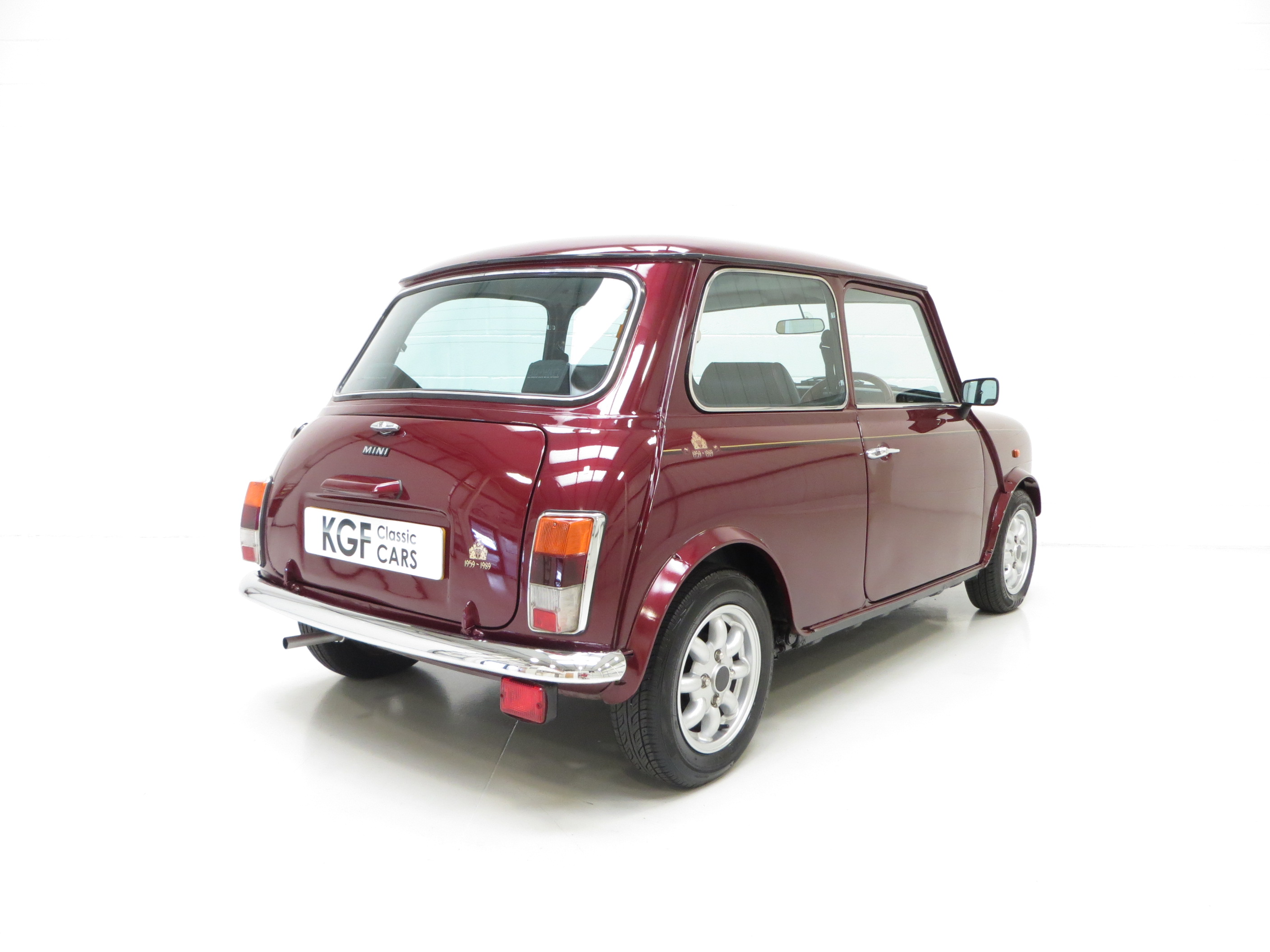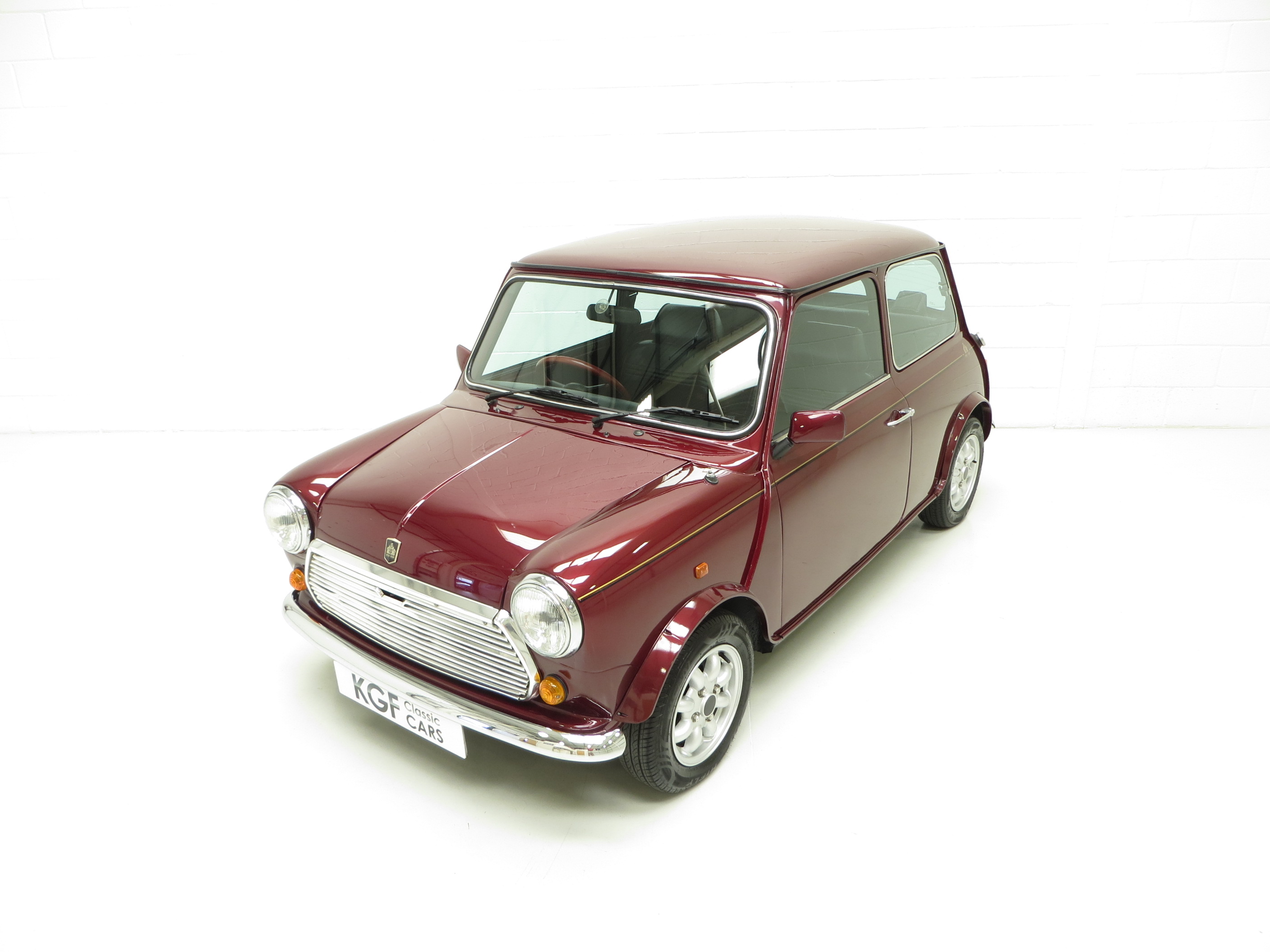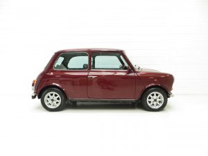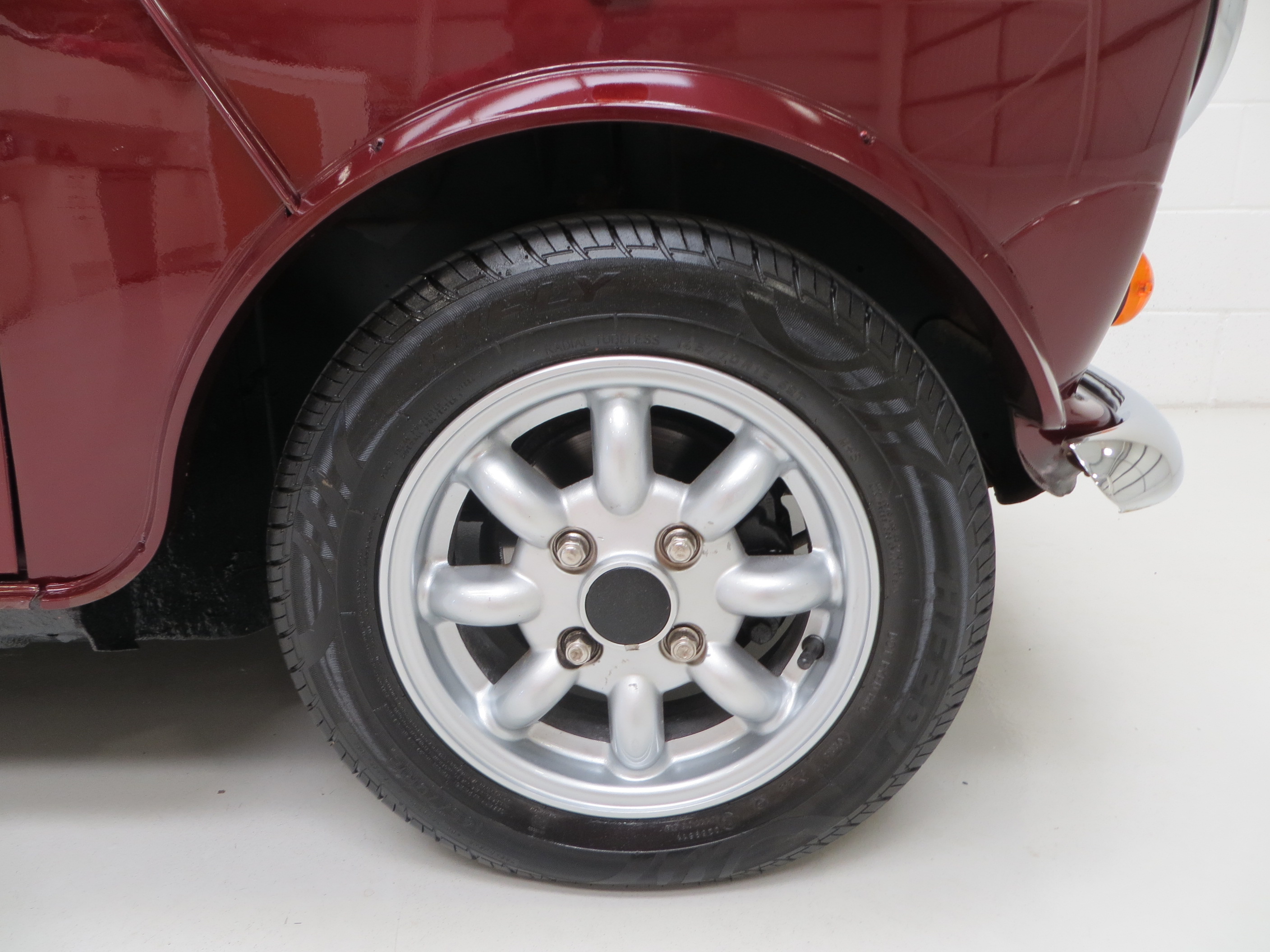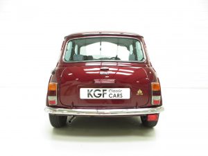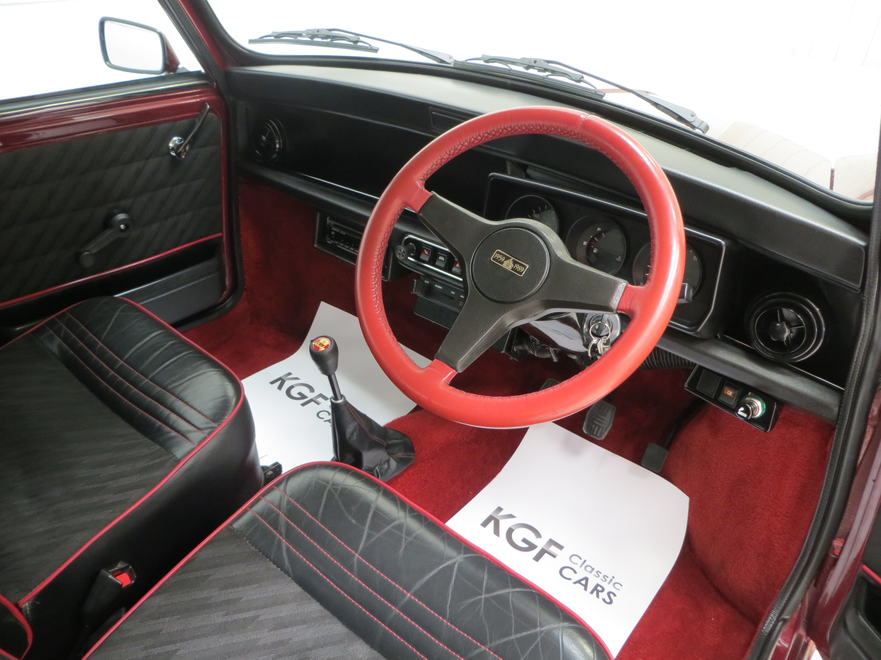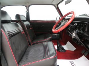 The interior of this outstanding Mini Thirty is in fabulous original condition. The seats are finished in the elegant blend of black leather and ‘Lighting’ cloth (code PMA) with the important ‘1959 to 1989’ tag neatly sewn into the seat. Two tiny nicks to the driver’s seat base and one to the unique leather gear knob are minor imperfections. The exclusive Claret deep cut pile carpets are wear free and full of colour. The red leather sports steering wheel with ‘Thirty’ crest is in fantastic order with all stitching intact. All instruments, switches gauges operate correctly and the interior plastic trim, door cards and headlining are perfect. A modern CD player has been profe3ssionally installed. Very special and not to been missed.