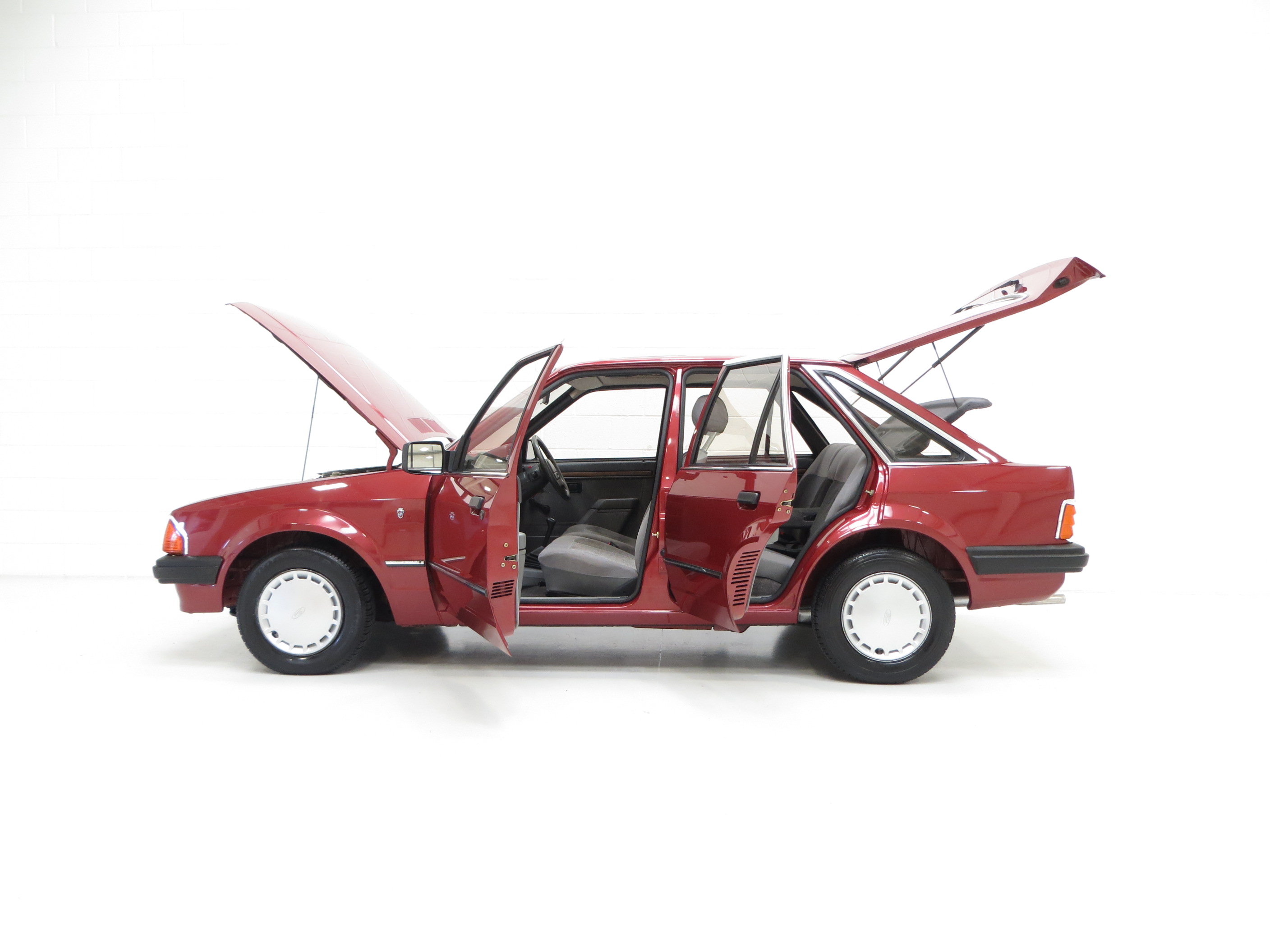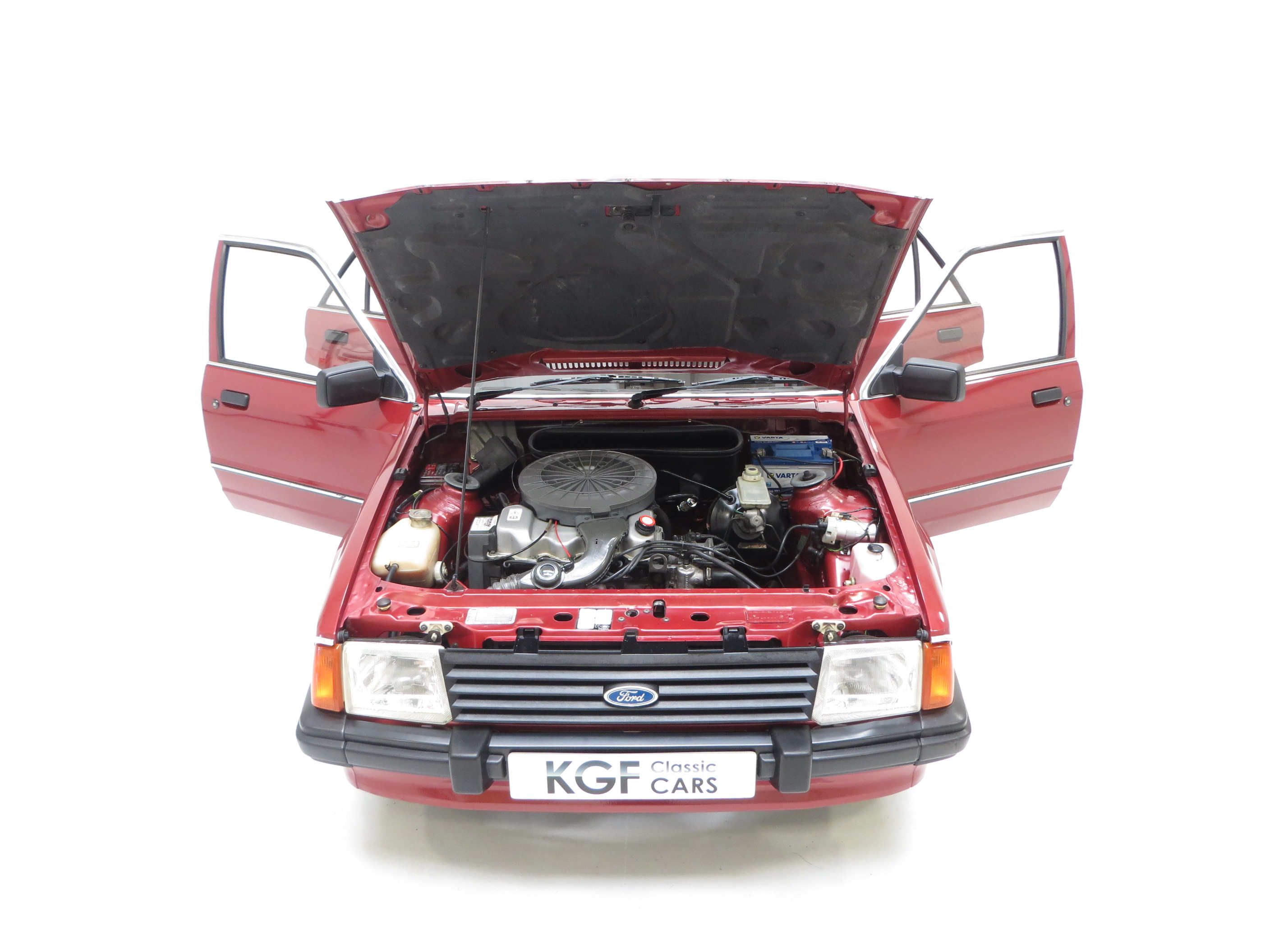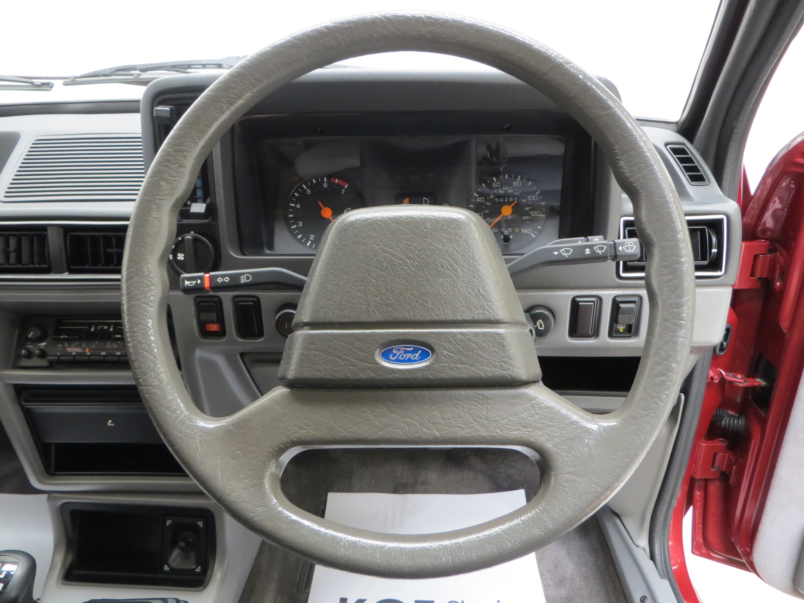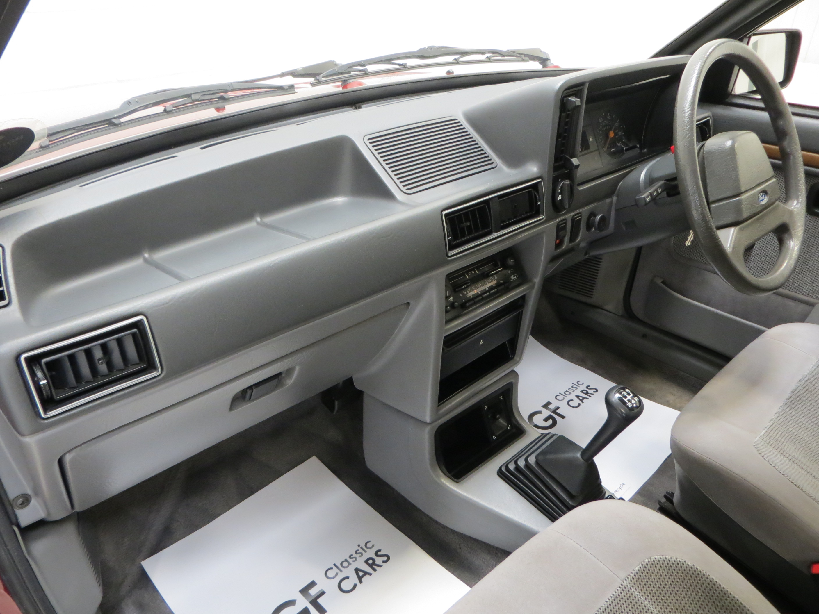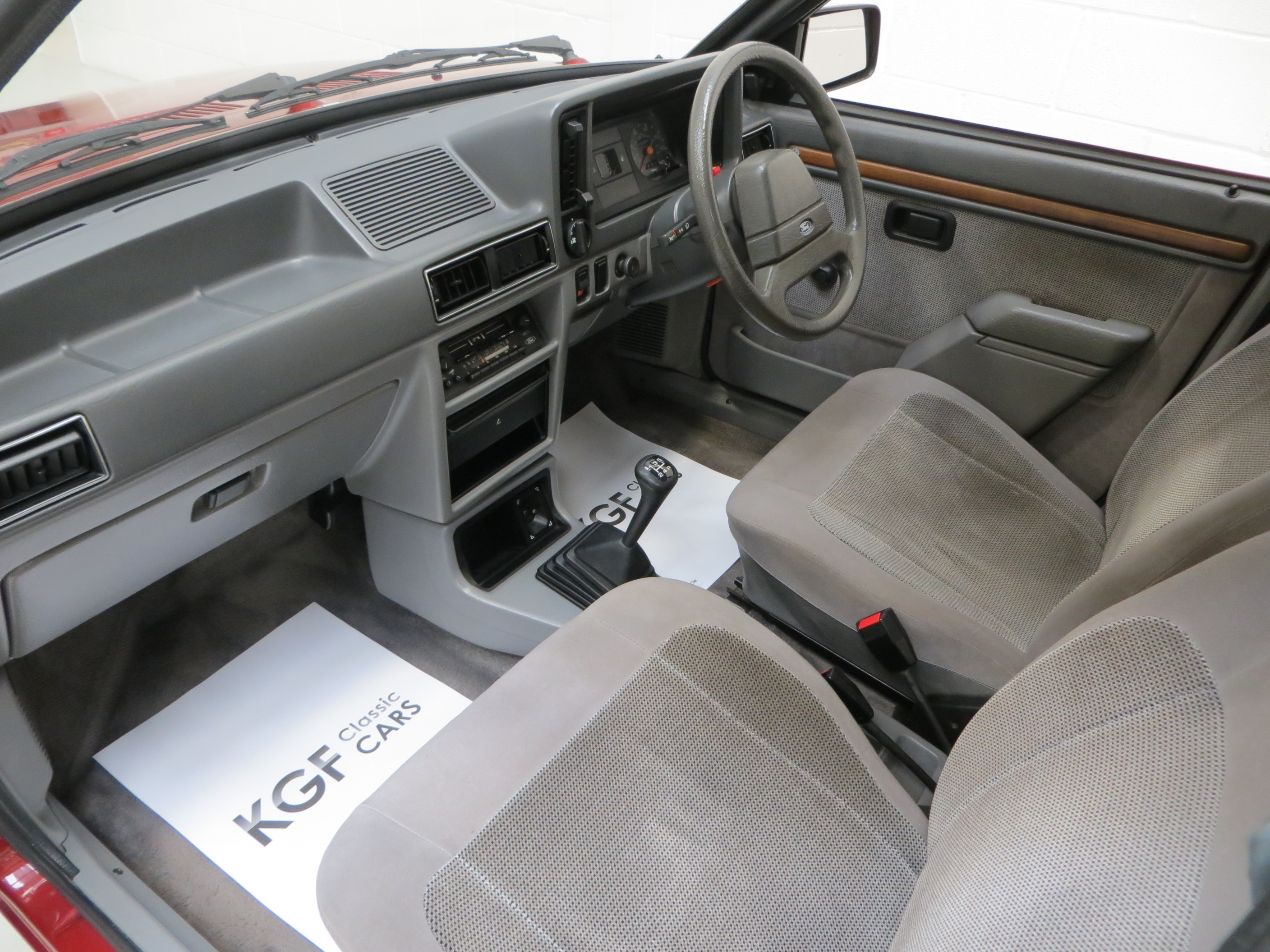 Finished in lavish Grey Savoy Crushed Velour the thick contoured seats and condition of the specialist materials unique to the Ghia model are pristine. Fully commensurate with the low mileage and cherished ownership the matching door cards with wood effect inserts are spotless and the colour keyed cut pile carpets have defied the years remarkably well. All switchgear is functional and intact, and the original dashboard top has no cracks thanks in part to a tailored made cloth religiously placed whenever the car attended shows. The original trimmed parcel shelf is intact, straight and complete with the rubber hangers and genuine Ford speakers. Lift the carpet in the immaculate boot area reveals factory PDI stickers and the number in white pen written by the PDI tester. Even the factory Ford radio and cassette holders remain fitted with joystick speaker control! Very retro and very 1980’s!