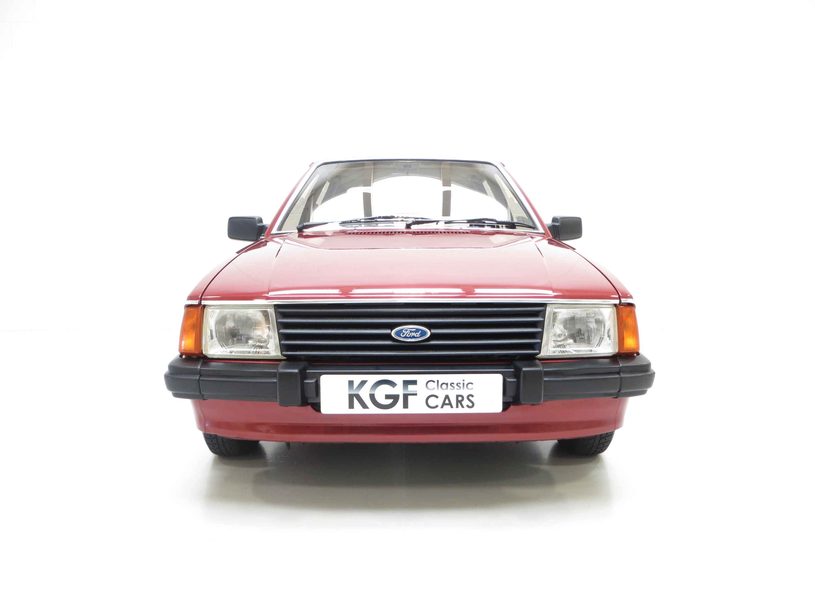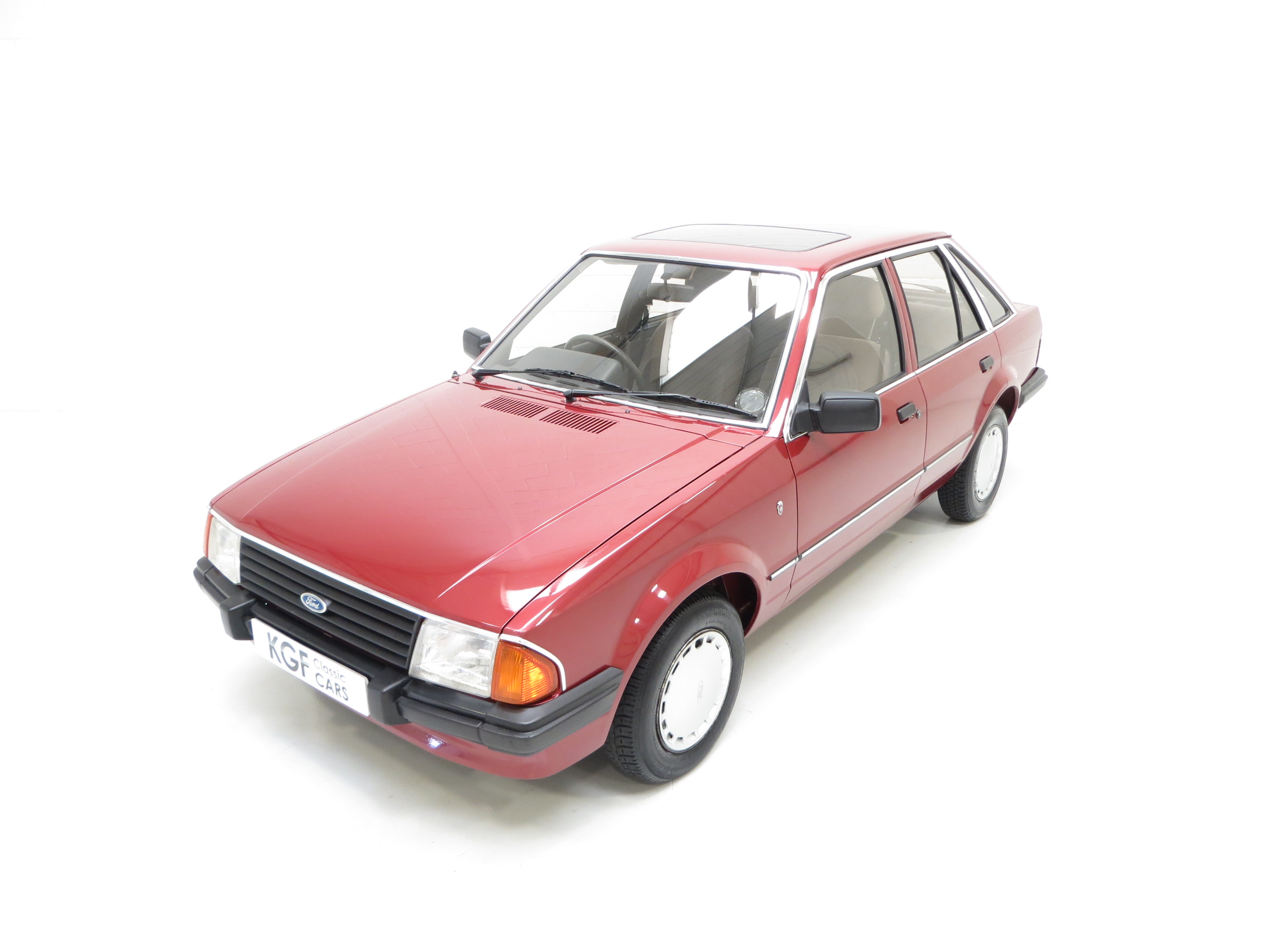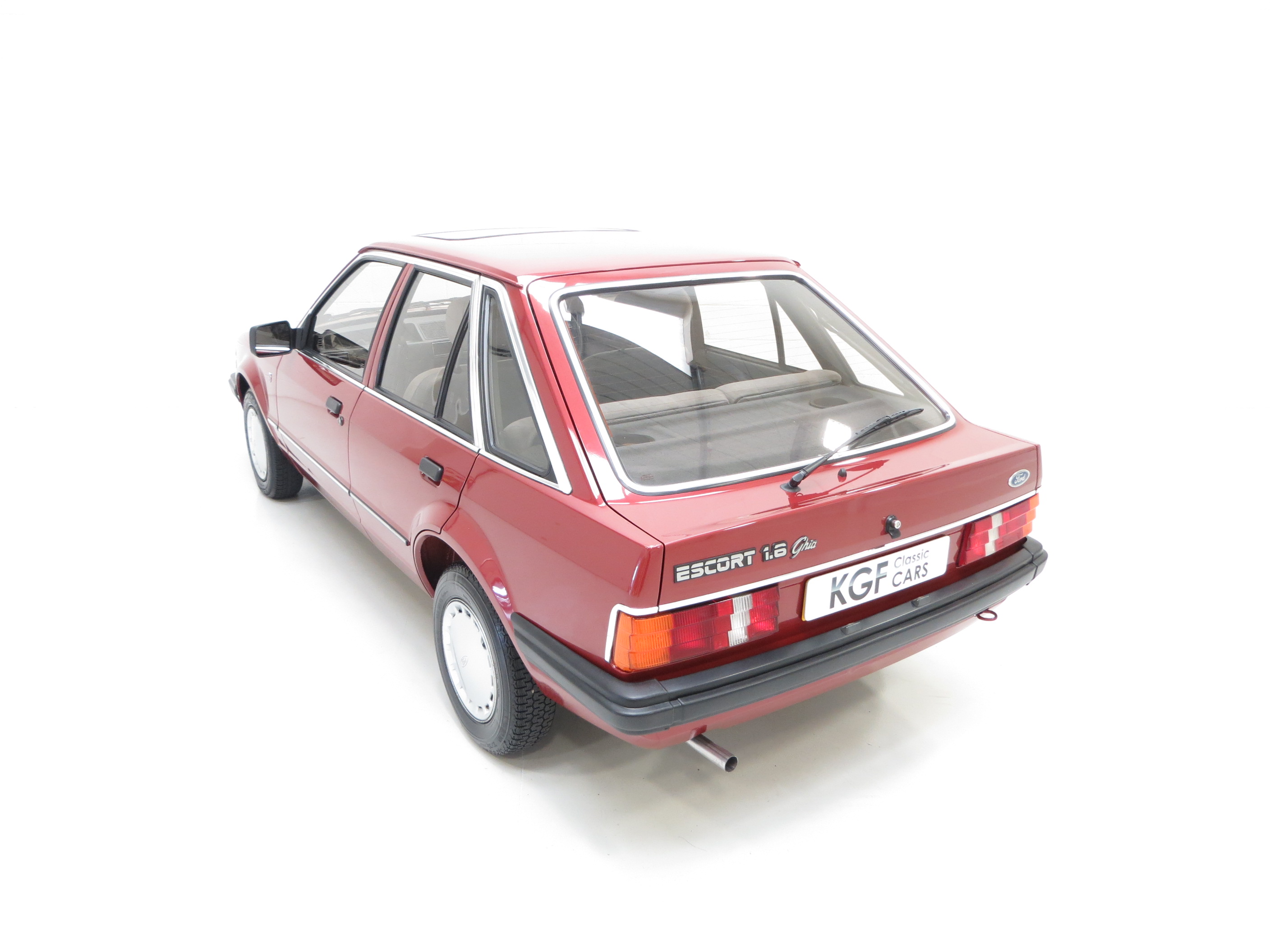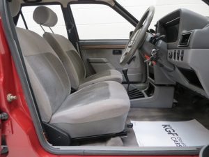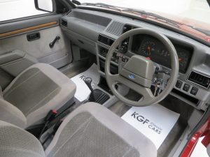 In the lap of luxury this Mk3 Escort Ghia is finished in Ford Regency Red (Code 44). The metallic paintwork boasts a gloss uniform finish and incredibly the car still wears original panels with date stampings visible. A conscientious owner has touched in numerous chips around the vehicle to preserve and protect and some minor dings do not detract from the cars remarkable originality. The extensive chrome work used to distinguish the Ghia specification along with correct badging remains intact and bright as do Dealer supplied number plates front and rear. All tinted glass including the sunroof is factory standard along with the Halogen headlamps. Wheel arch apertures are remarkably clean and help reveal the pampered existence this once common sight model has fortunately enjoyed.