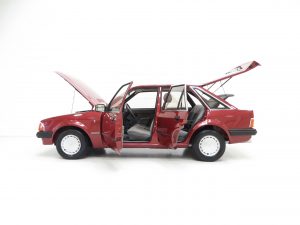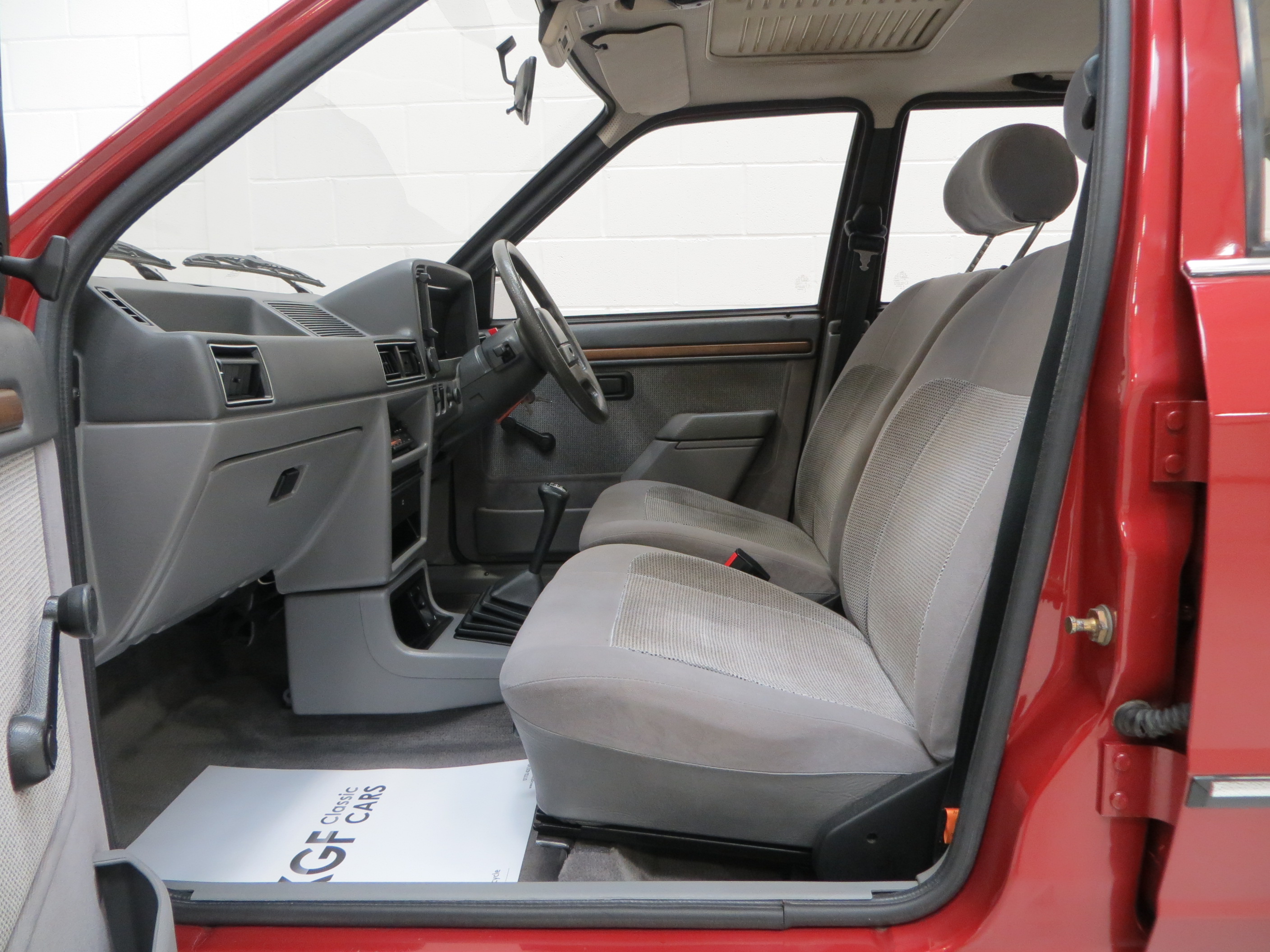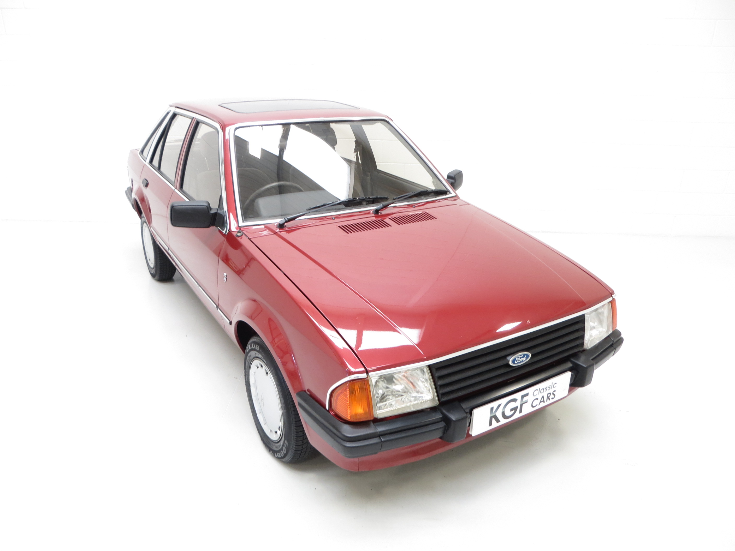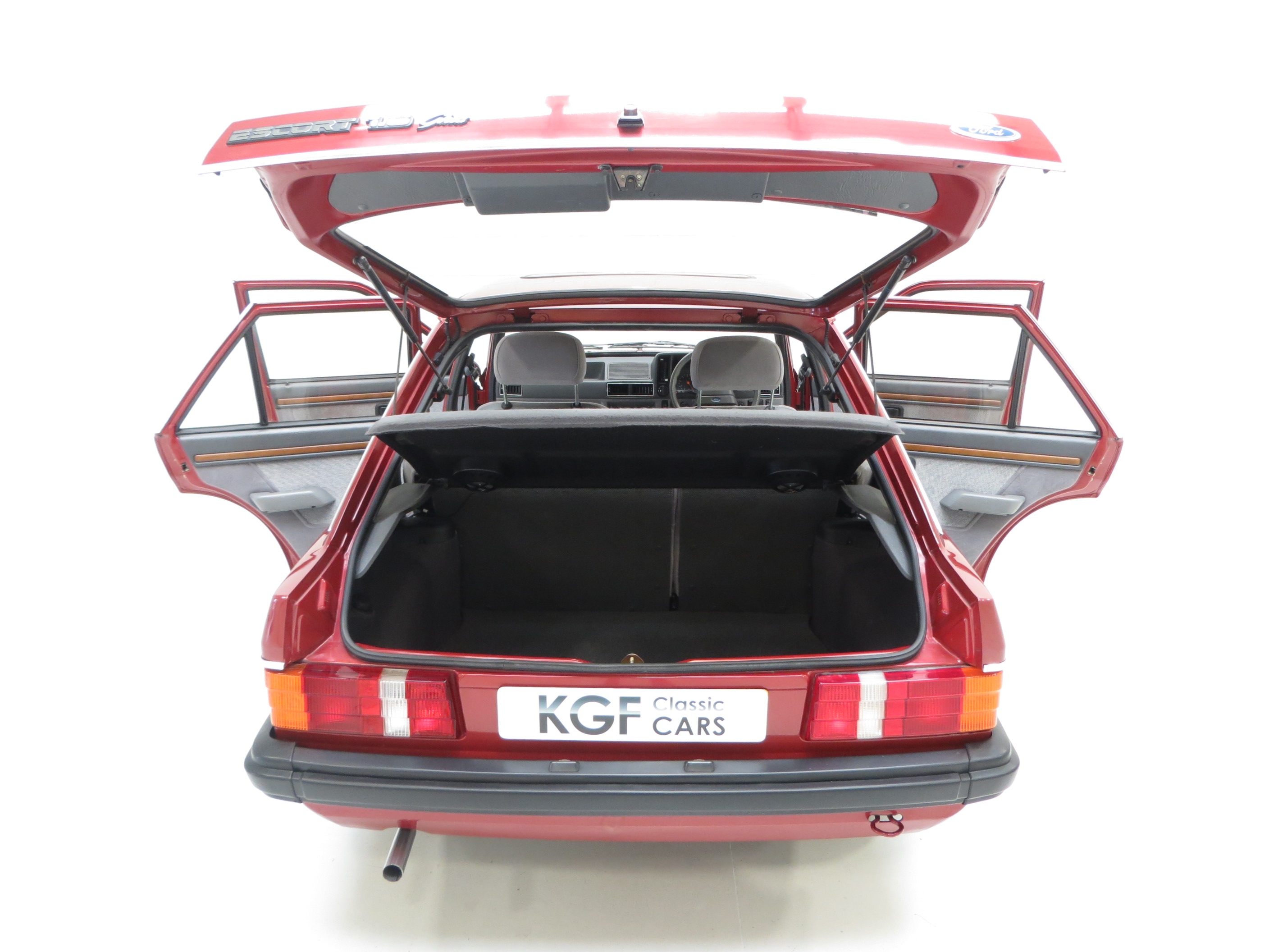 In the lap of luxury this Mk3 Escort Ghia is finished in Ford Regency Red (Code 44). The metallic paintwork boasts a gloss uniform finish and incredibly the car still wears original panels with date stampings visible. A conscientious owner has touched in numerous chips around the vehicle to preserve and protect and some minor dings do not detract from the cars remarkable originality. The extensive chrome work used to distinguish the Ghia specification along with correct badging remains intact and bright as do Dealer supplied number plates front and rear. All tinted glass including the sunroof is factory standard along with the Halogen headlamps. Wheel arch apertures are remarkably clean and help reveal the pampered existence this once common sight model has fortunately enjoyed.