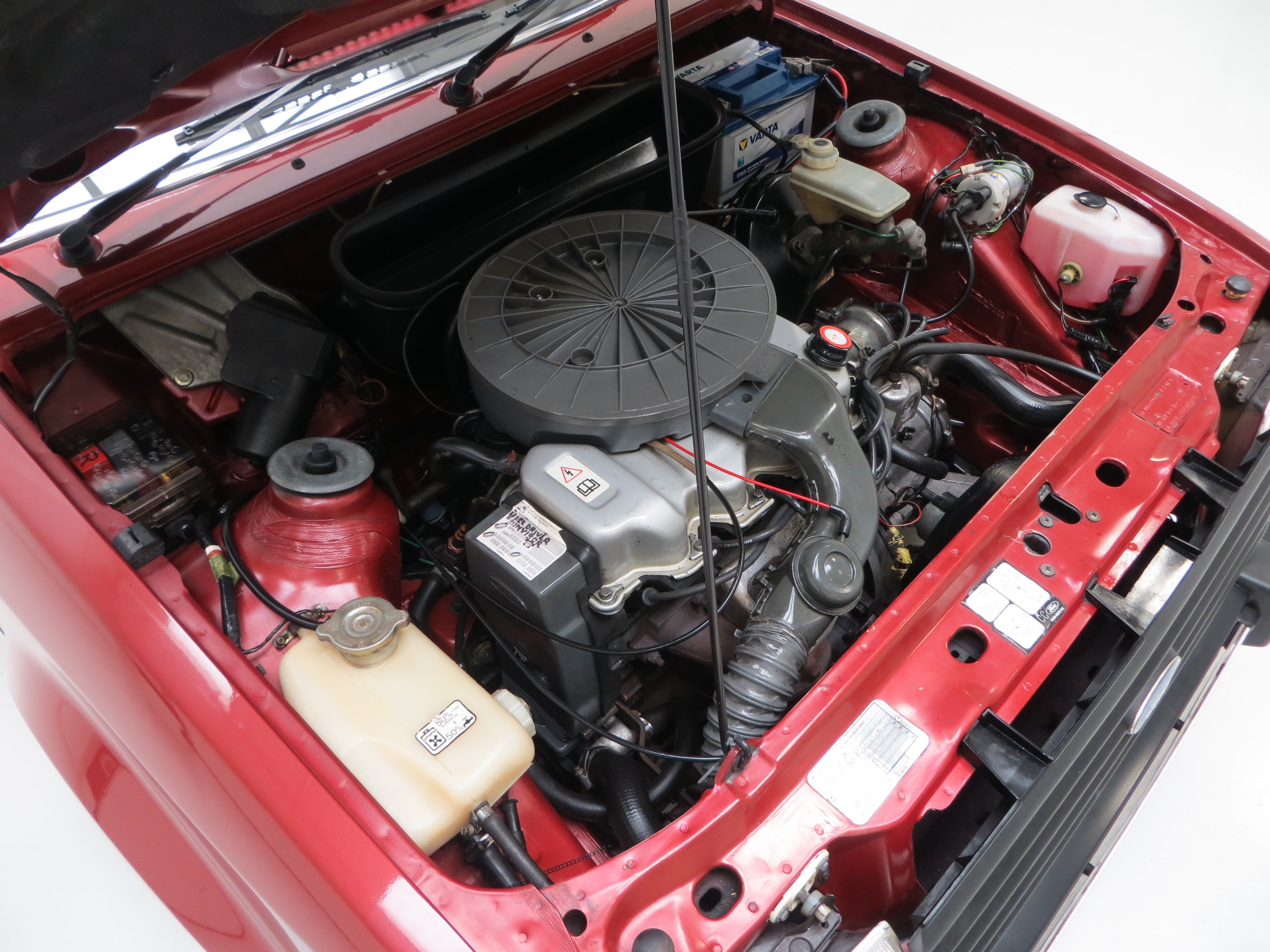 The 5×13 pressed steel wheels still have the correct Ghia full wheel covers with only light markings to the outer edge on one. Premium 155/80 R13 tyres with masses of tread are fitted. The diagonally split hydraulic circuit servo assisted brakes with ventilated 9.4” front discs and rear drums bring the car up to a steady, straight and assured halt.