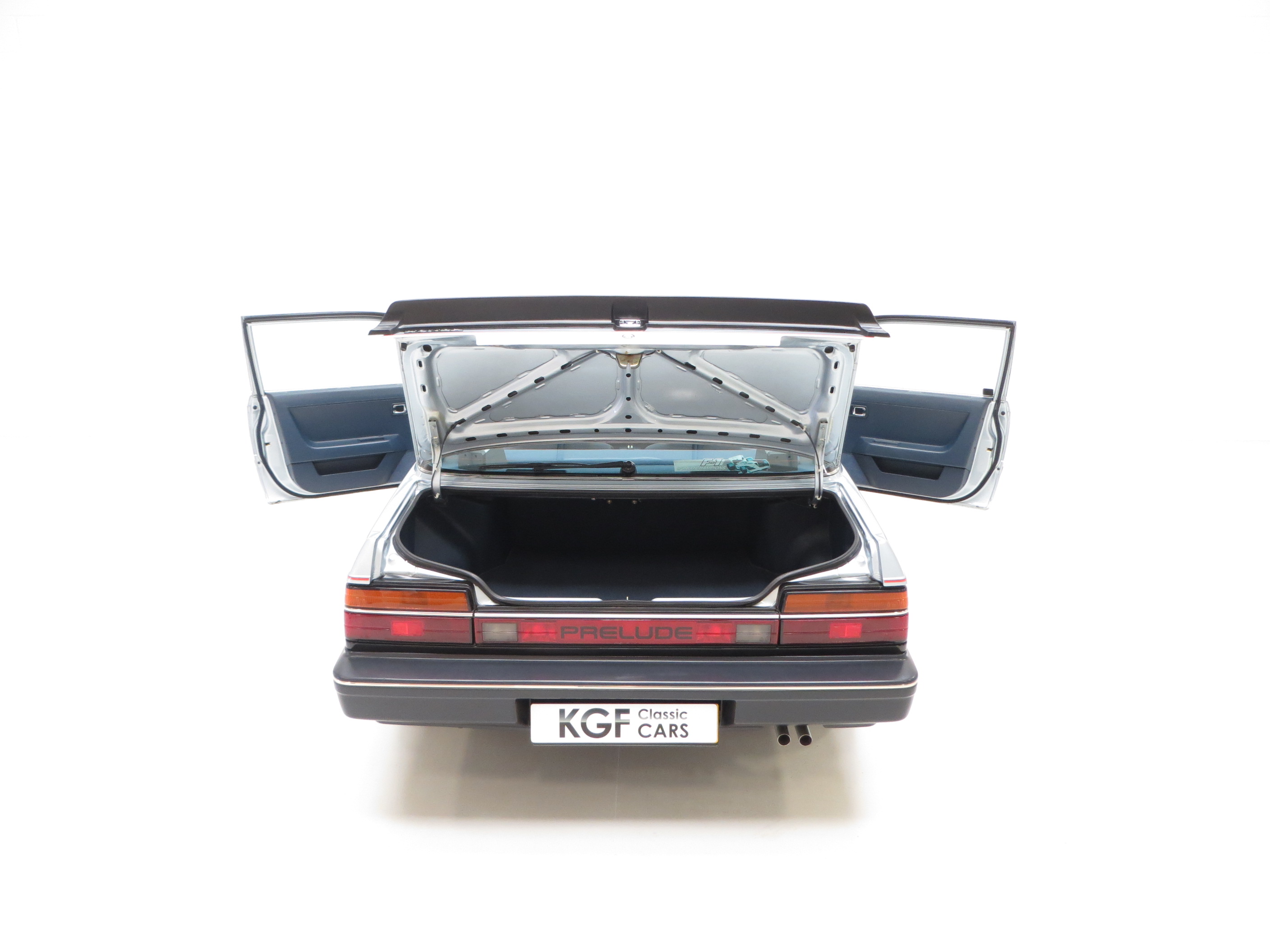 Luxurious interior appointments and advanced technical specification help explain why this second generation Prelude was at the forefront of design. The firmly contoured rally style seats finished in Blue, (Type C), show virtually no wear with only the drivers bolster corduroy material slightly stretched. Perfection seeking purists will note the factory interior and exterior colour code stickers in the spotless door shuts and tyre inflation sticker to the driver’s door bottom. Four genuine Honda logoed rubber floor mats have protected the blue carpeting from new and all controls function with precision including the easy read instruments backlit with a soft orange glow. The supplying dealer tax disc holder is present. Practicality is offered with folding rear seat backs, 2+2 seating with rear seatbelts and a generous boot capacity. Difficult to fault.