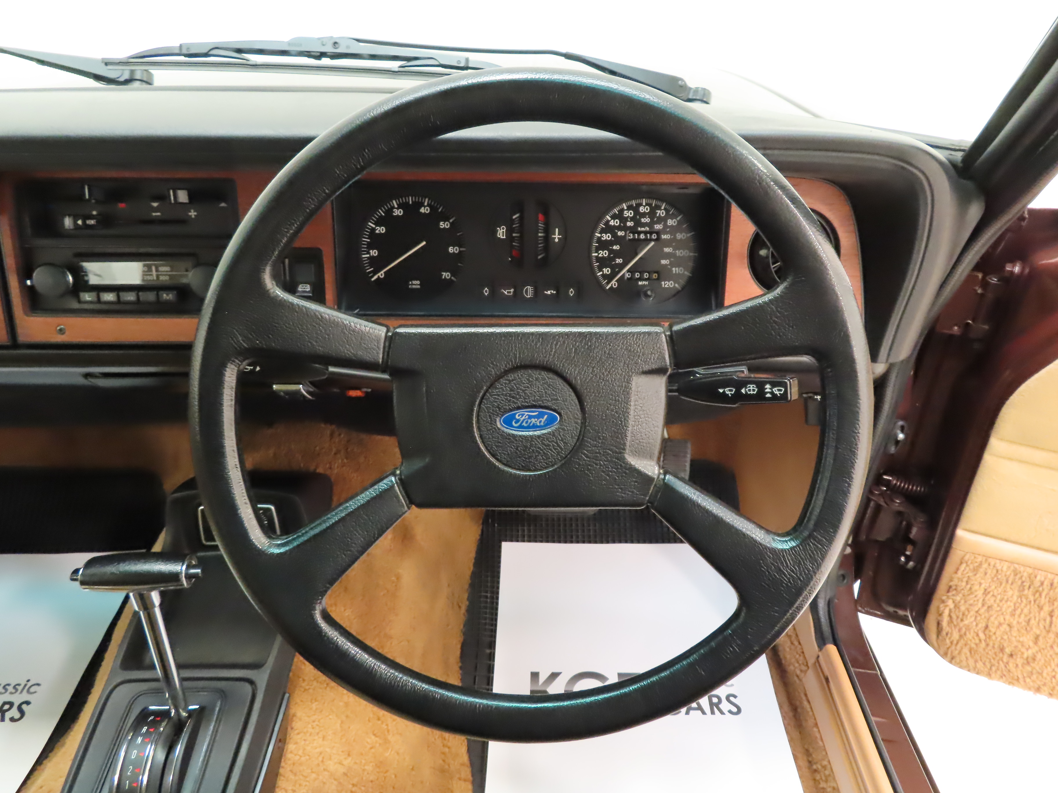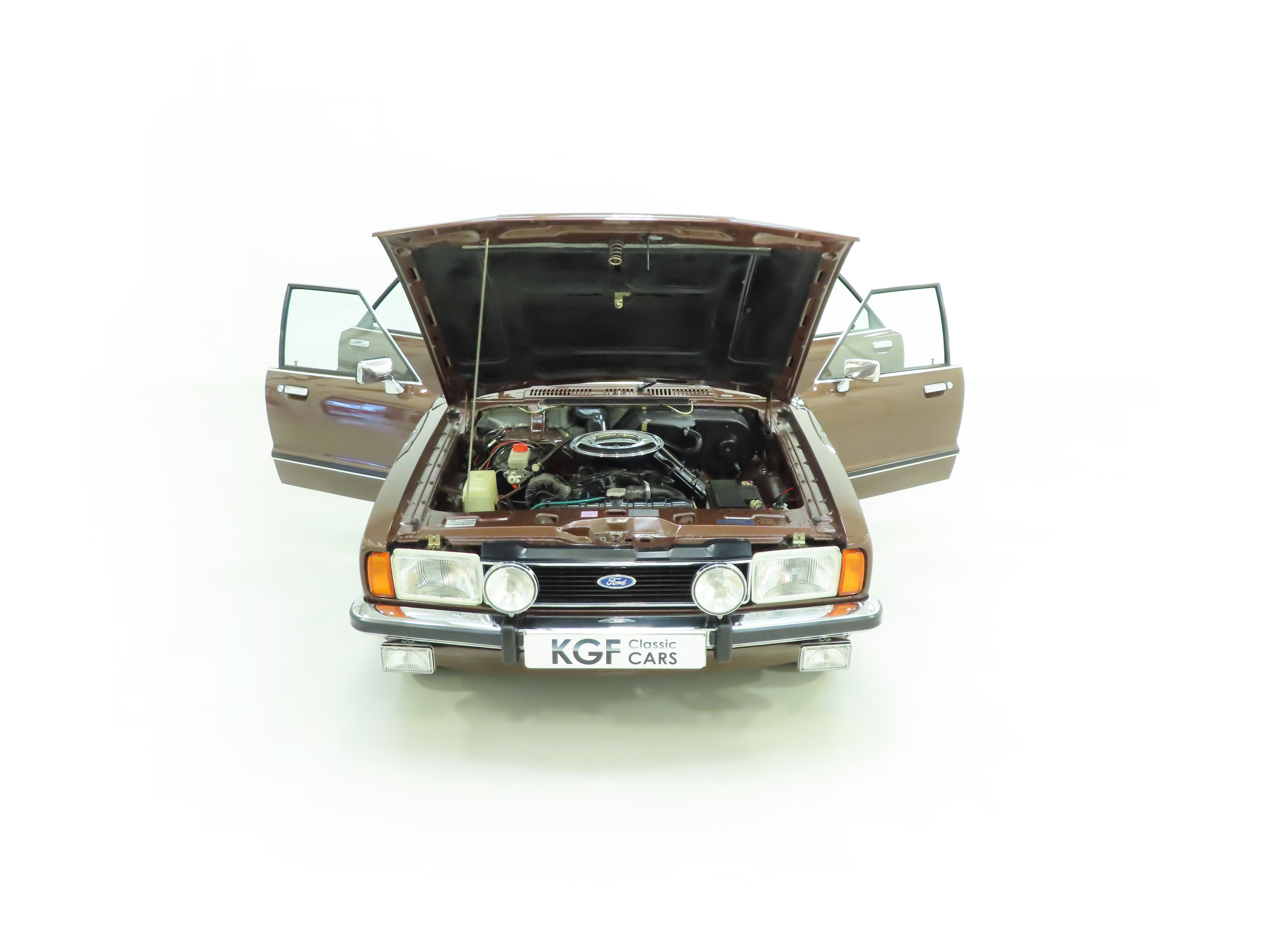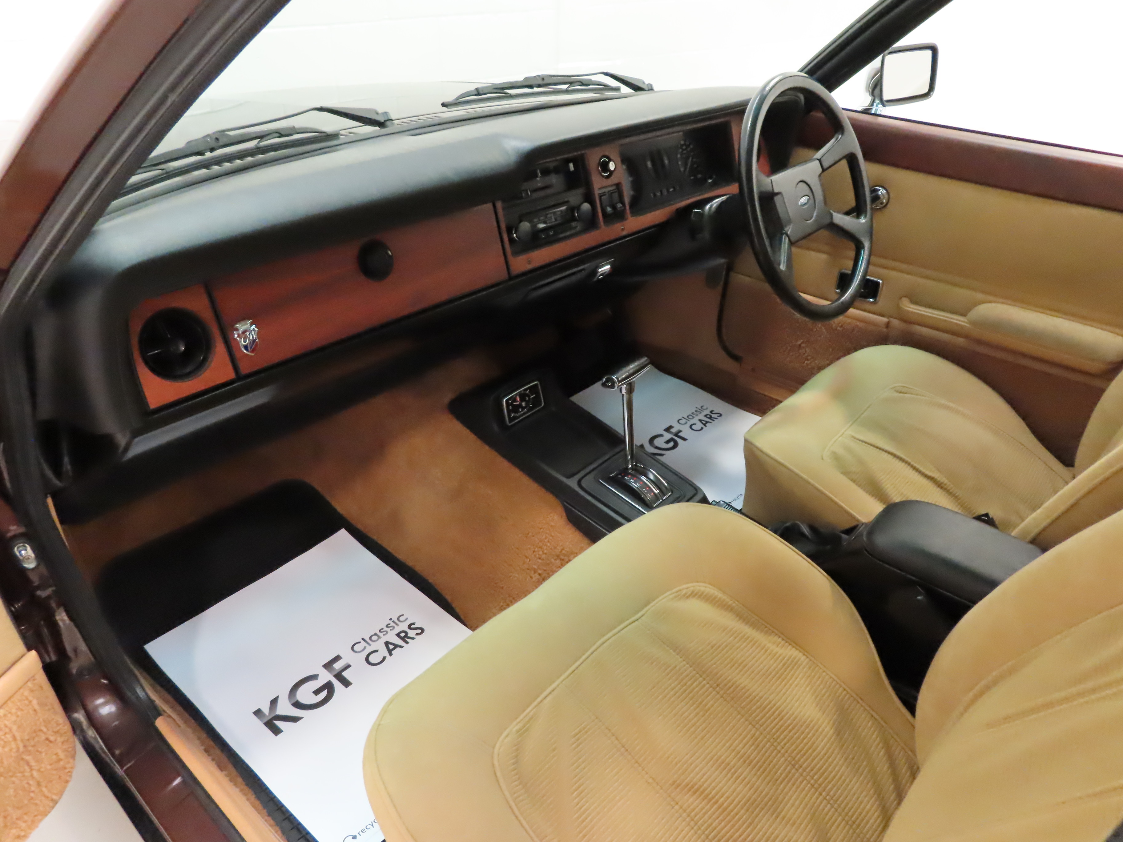 This beautifully preserved range topping Ghia interior is deliciously 1970’s from the Crushed velour trim with Verona inserts in Tan, (Code W1), to the real wood trim. This pampered example boasts a spotlessly clean interior with immaculate door cards, carpets and headlining. The seats have been protected from new by Cortina tailored lambskin seat covers and as such are spotlessly clean but display typical creasing commonly found. The fascia and padded dash are in fantastic order with only a small slightly raised area to one section. All functions and controls operate perfectly including gauges and the original Ford push-button radio.