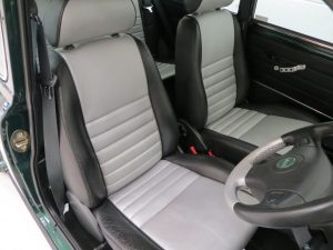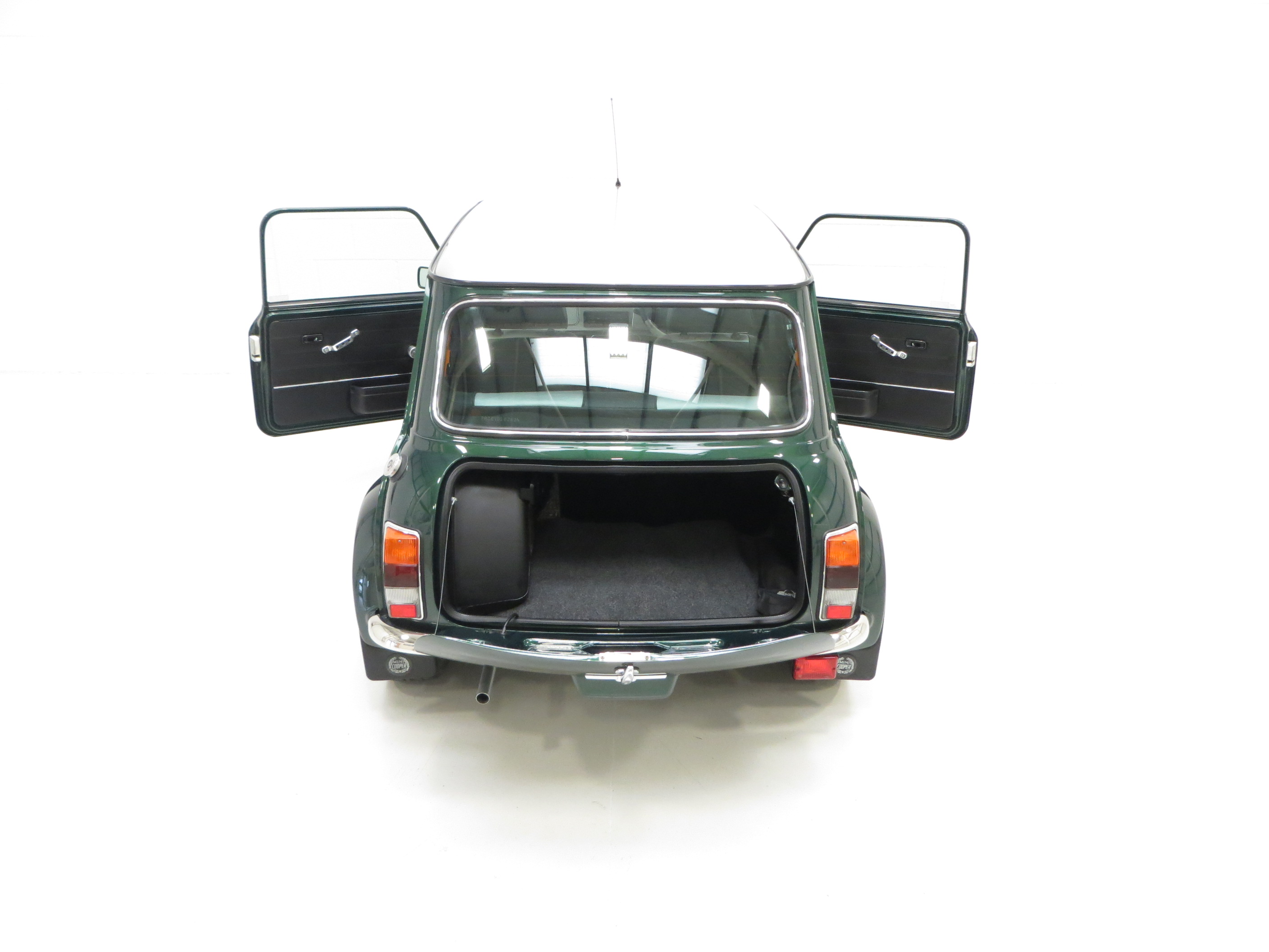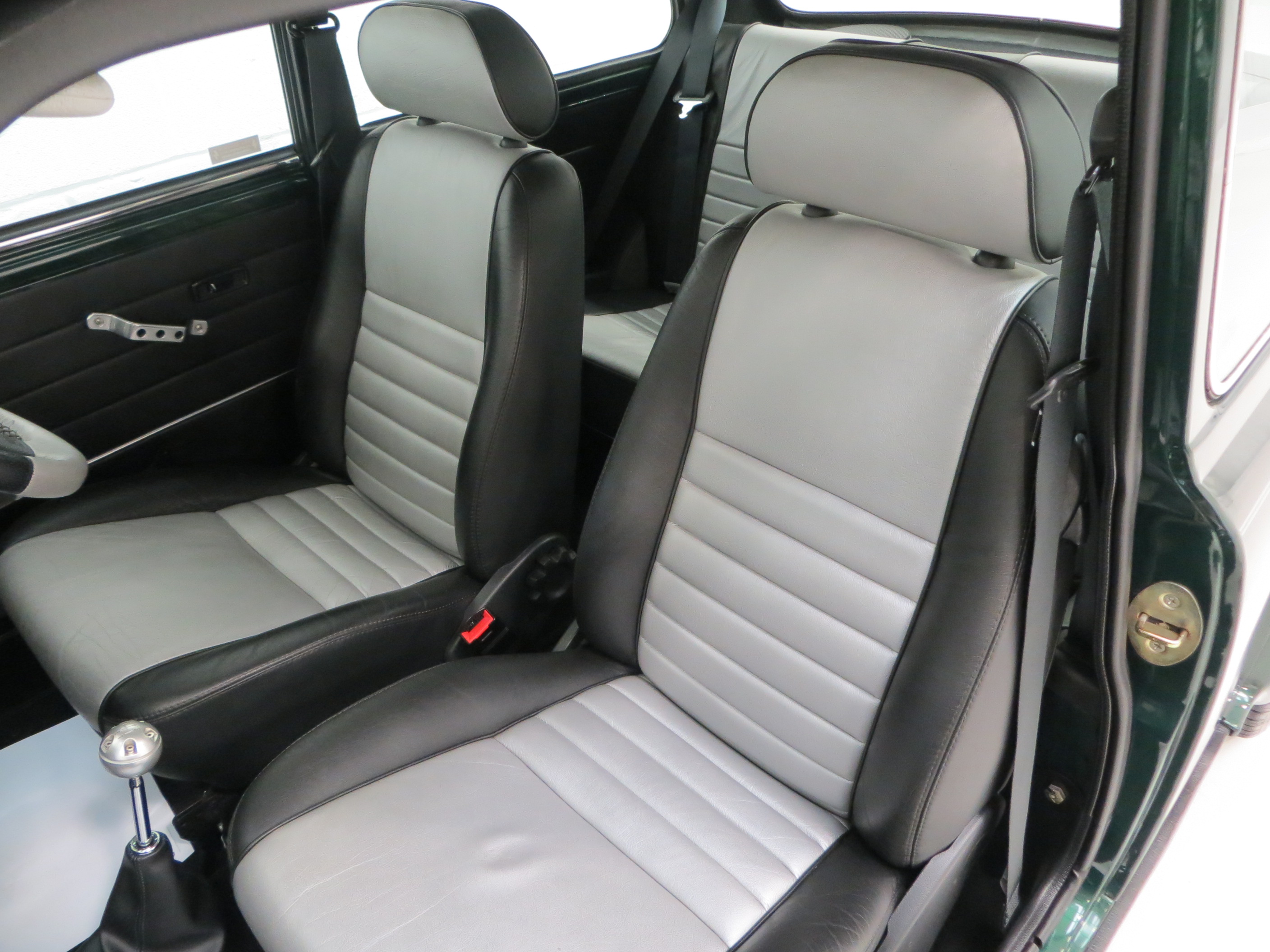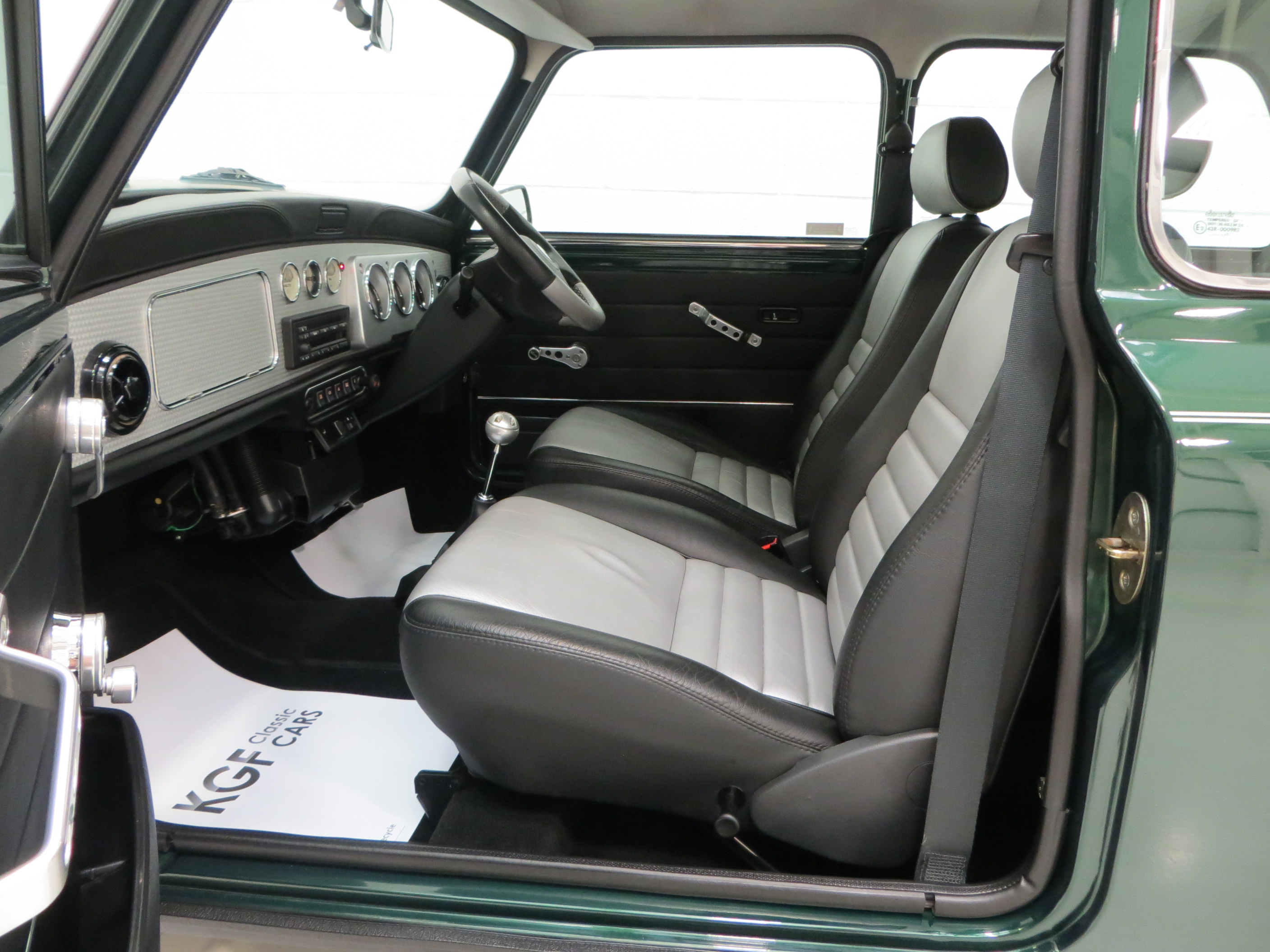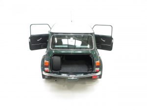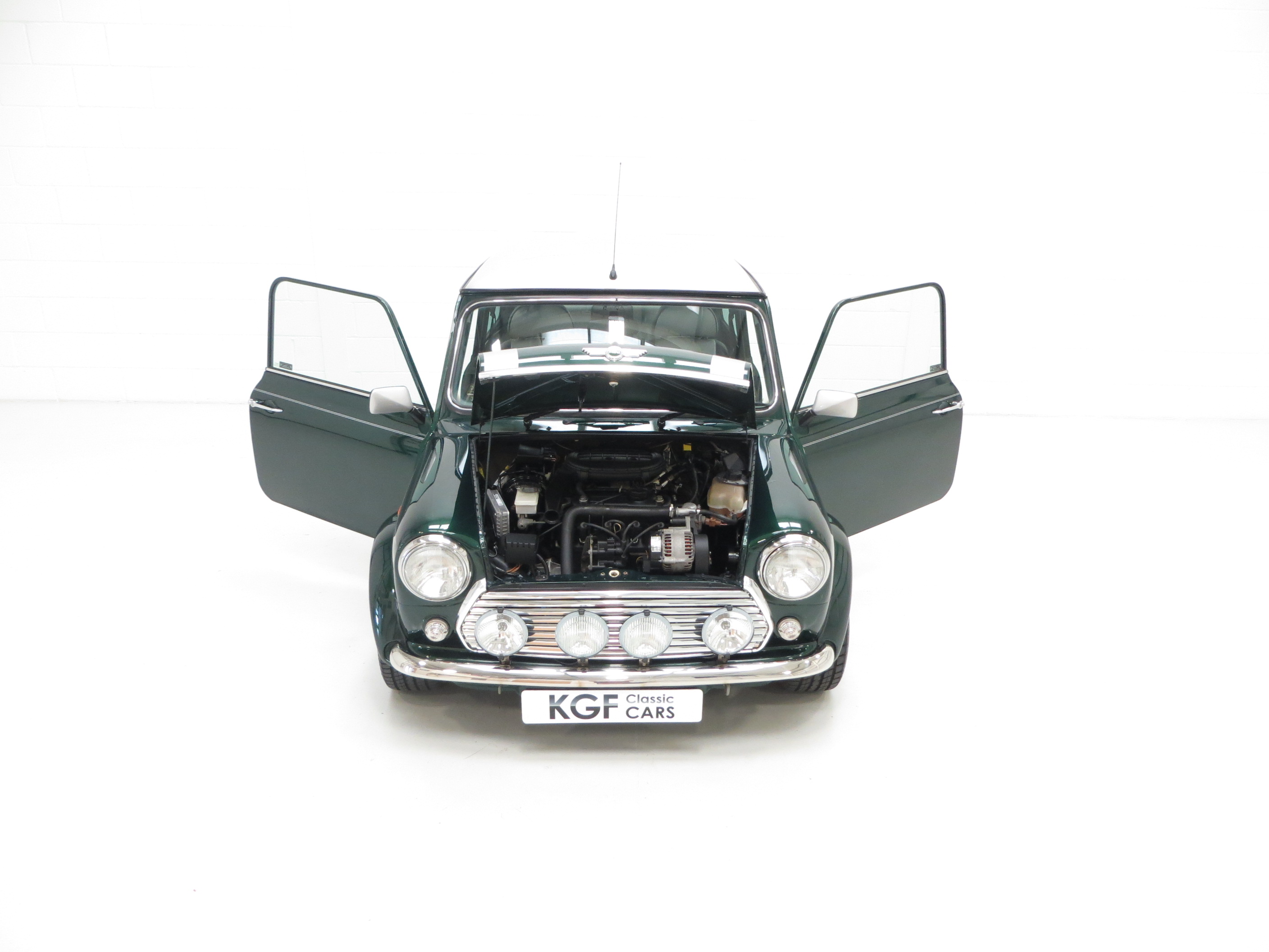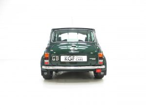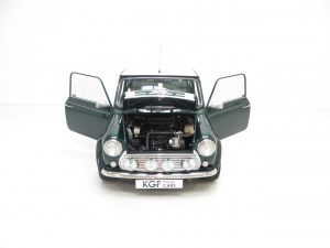 This historically important Mini was made at the end of the line and is finished in British Racing Green, (Code WNS) with a contrasting Platinum Silver roof, (Code MNX). The paintwork boasts a beautiful glossy shine with a silky smooth and uniform finish which warrants the low miles covered. The purposeful Sport Pack, unmarked decals and bright chrome work complement the polished paint to create an outstanding appearance. The front bumper has a tiny mark along with the bonnet which does not detract from the show winning credentials. Factory stickers to the front and side glass remain and the correct Quadoptic halogen lights, driving lamps and front fogs are fitted. At the rear the proud GB, Sport chrome badges and dealer supplied number plate are present. Stunning.