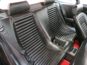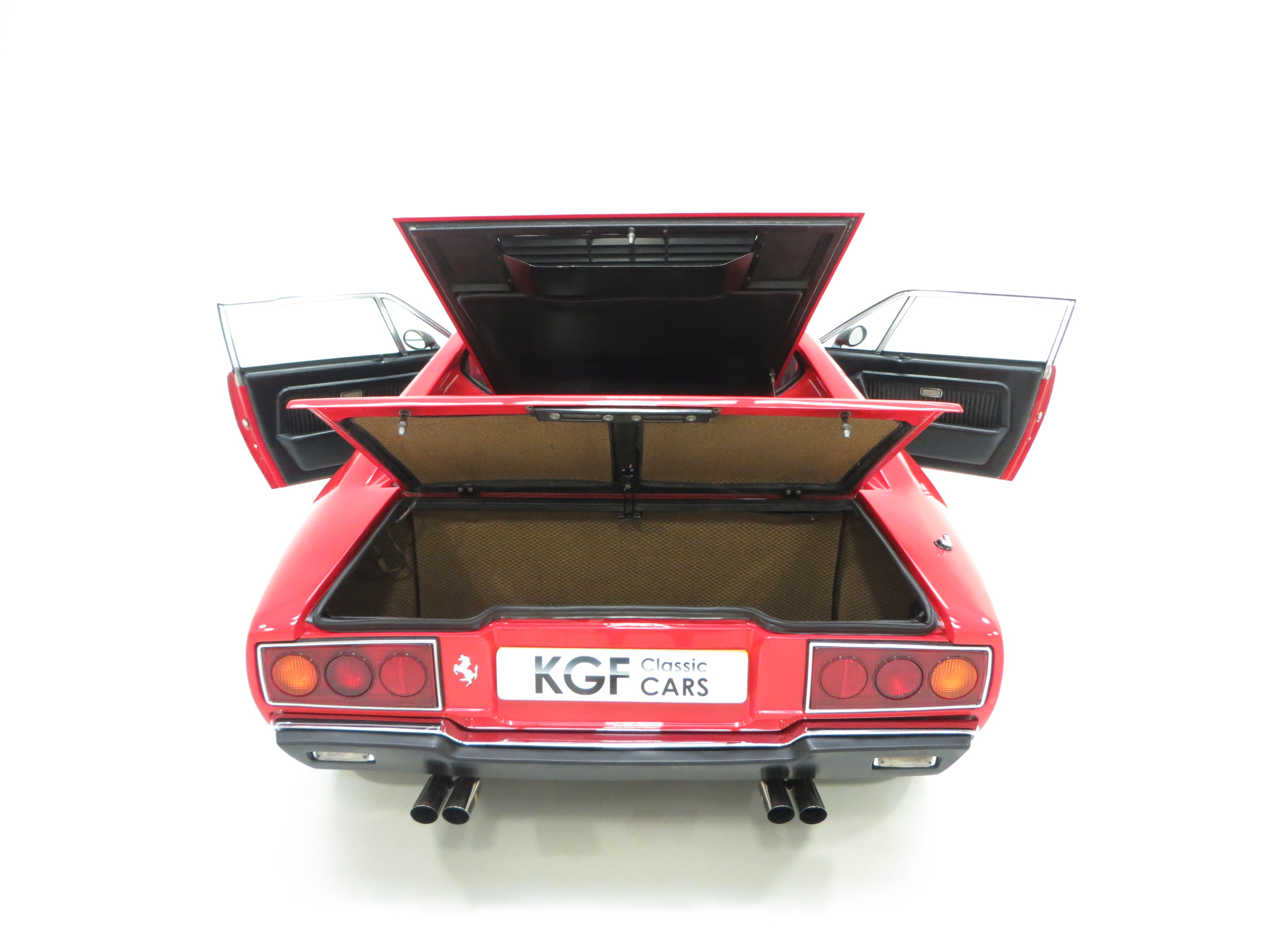 Optional black full leather seat facings in this 308GT4 are in excellent condition along with the contrasting Bordeaux carpeting. Some minor wear to the clean carpets and piping do not detract from the impressive cockpit. Seven Veglia Borletti instruments bearing a Dino script logo work perfectly along with all the attractive chrome sliders and switch gear. The three brushed aluminium dash panels angled towards the driver are simply automotive art and the Momo leather-rimmed steering wheel with the circular horn push proudly displaying the ‘cavallino rampante’ reminds the driver how special this car is. Often missing items such as the seat belt clip to assist access to the rear proves the originality. Sculpted rear seats with head restraints and seatbelts offers practically as does the deep luggage area still carpeted in the original heavy-duty hessian style weave.