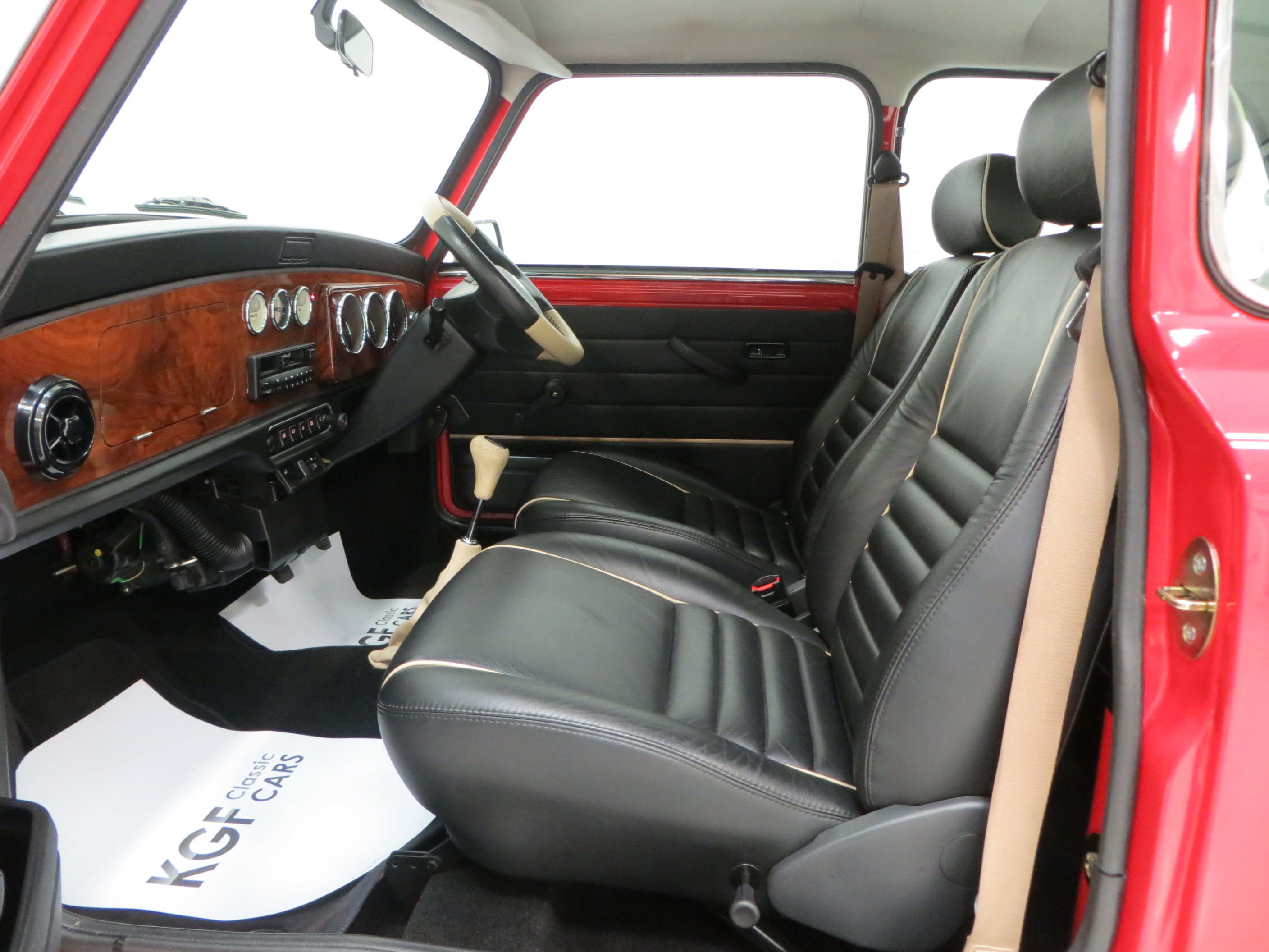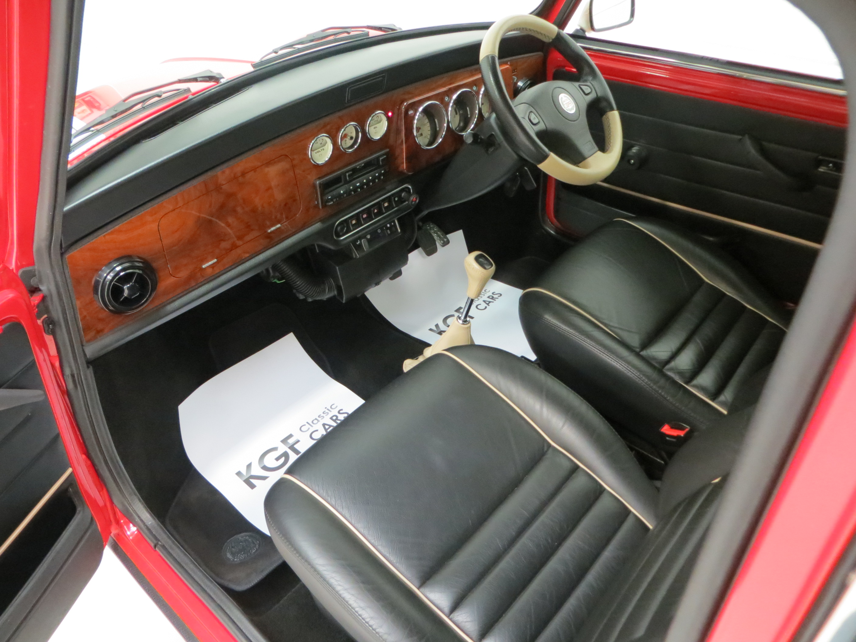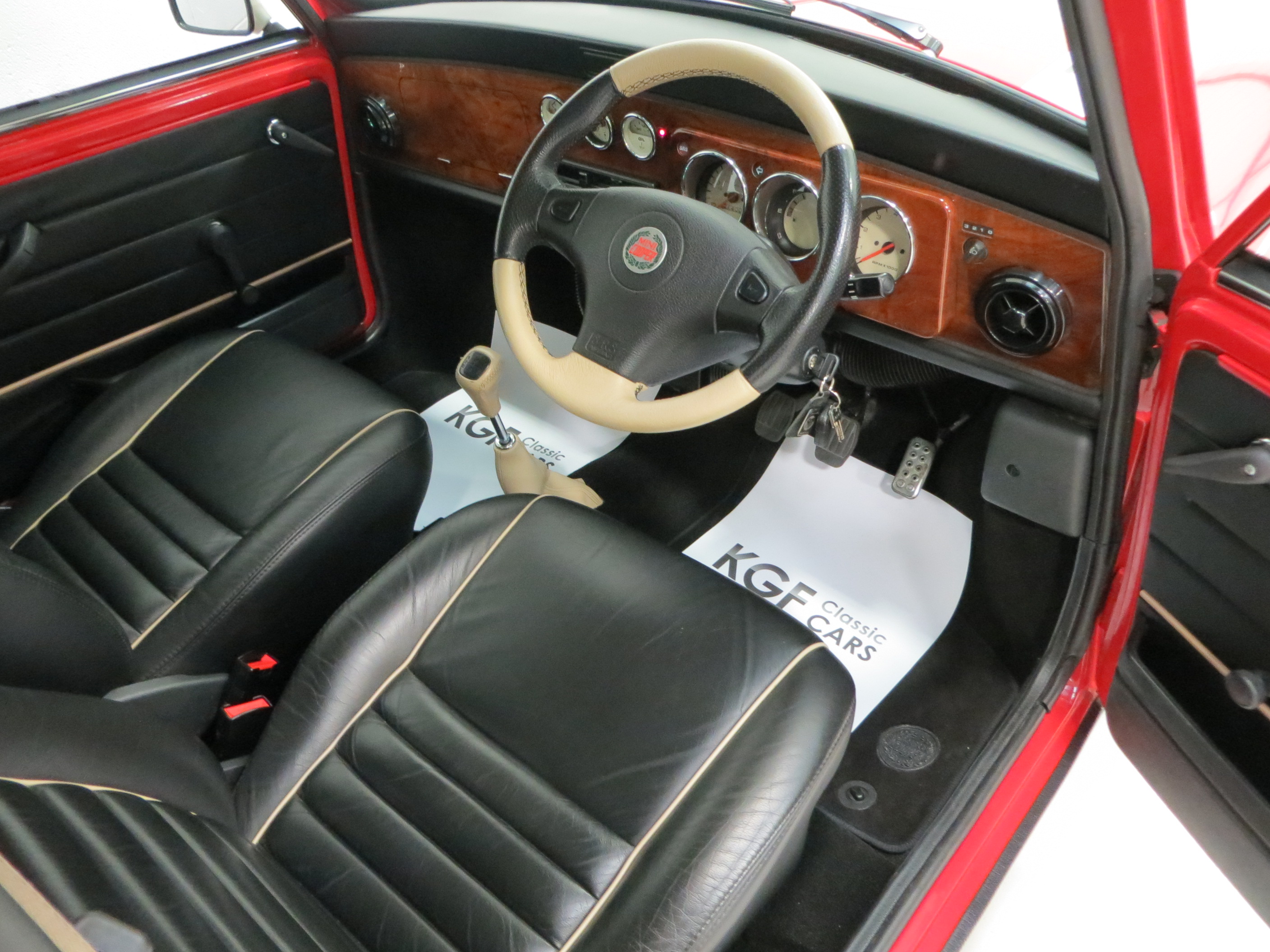 Lavishly trimmed, the factory optional full leather interior in Black (Code PMA), is in pristine order thanks again to the very low miles. Natural light veins to the steering wheel often worn smooth on most examples remain prominent but the gearknob colouring has faded slightly. The immaculate carpets have been protected by genuine Mini Cooper velour mats and the door cards are perfect. The cream faced instruments set within the unmarked burr walnut facia function correctly along with all other controls. The correct stereo cassette player with the Mini logo remains fitted. The spotless boot area houses the original steel spare wheel alongside the factory supplied jack in its Mini logo pouch. A stunning classic Mini interior, totally unspoilt and utterly faultless.