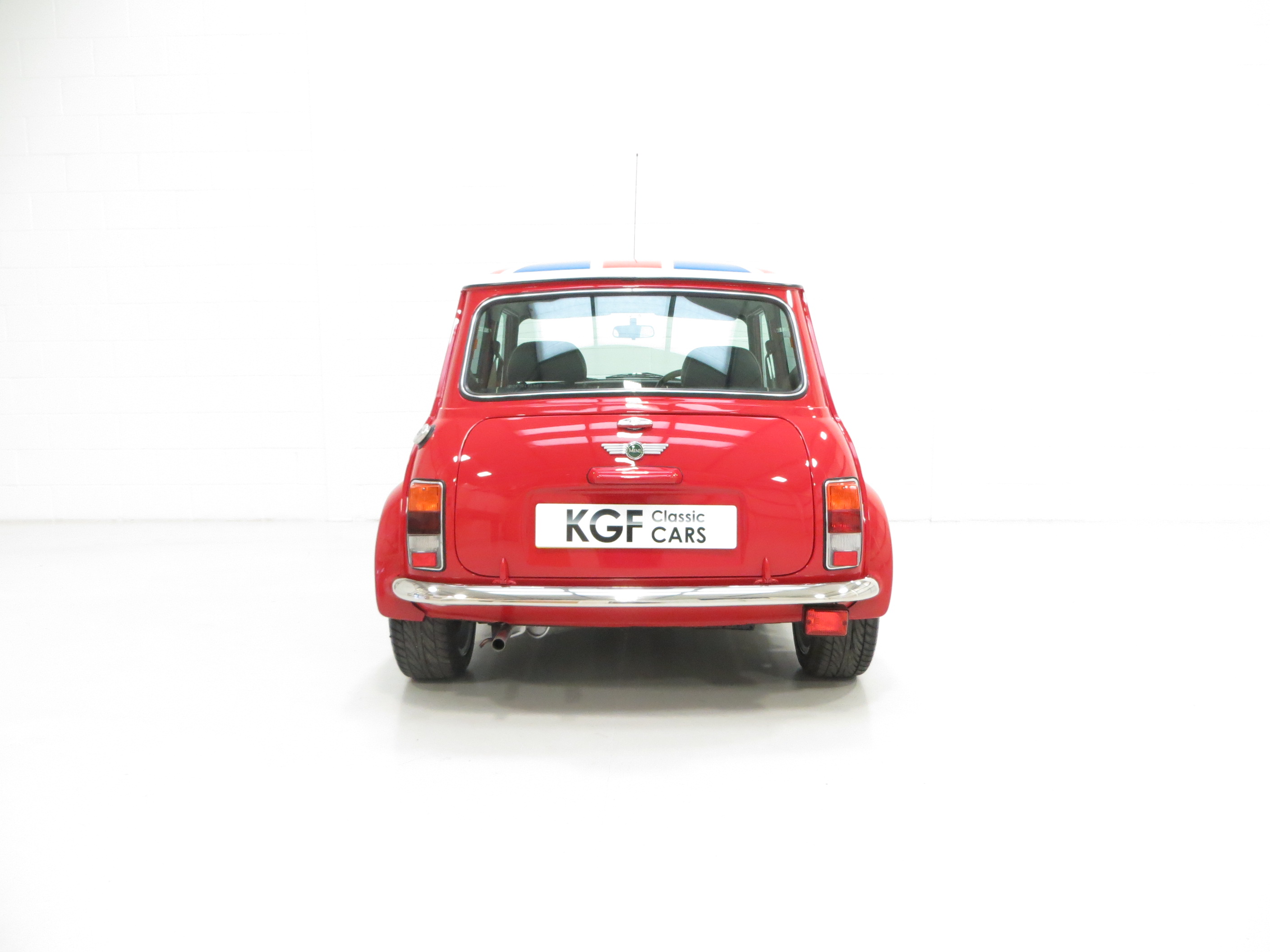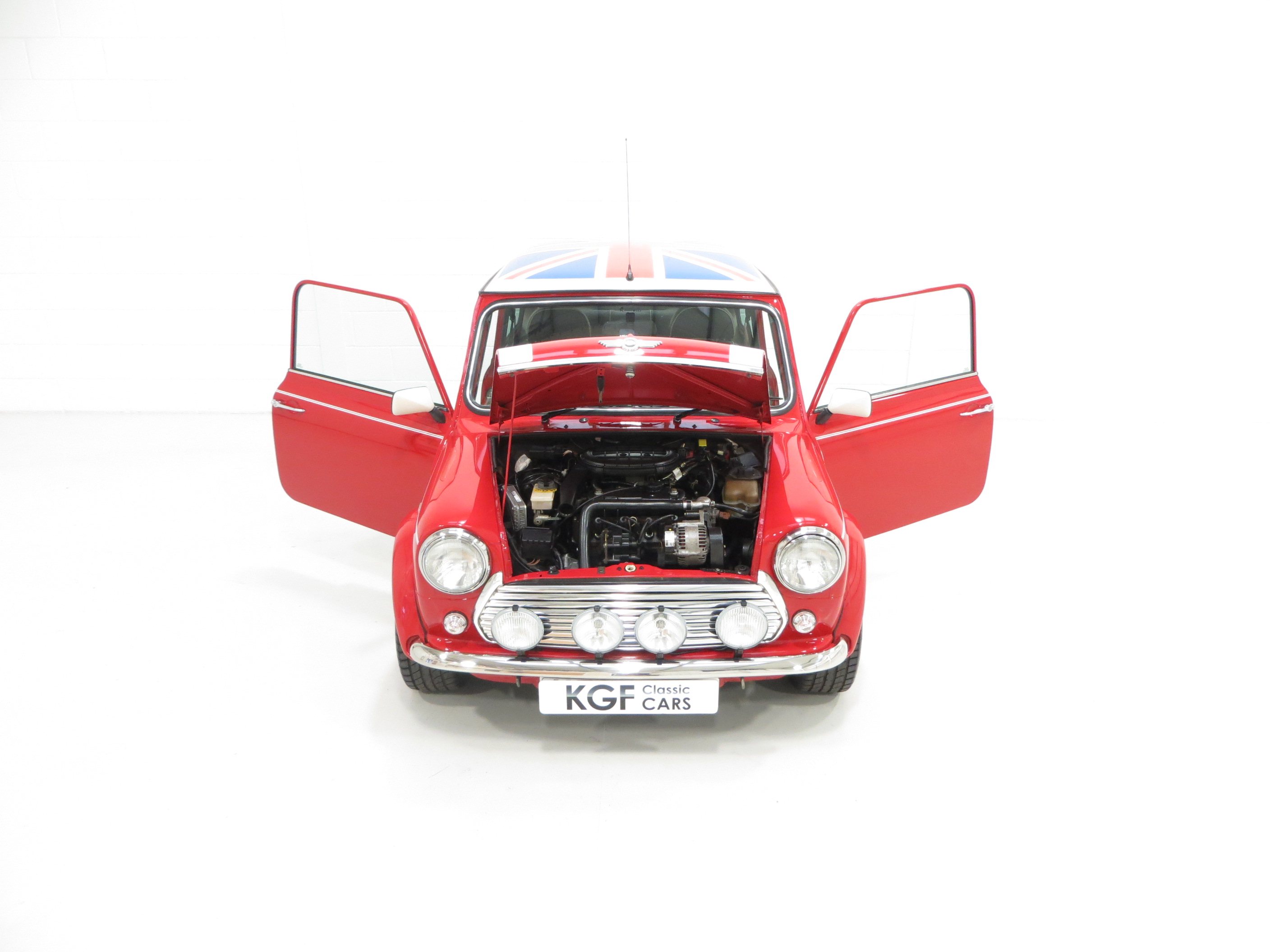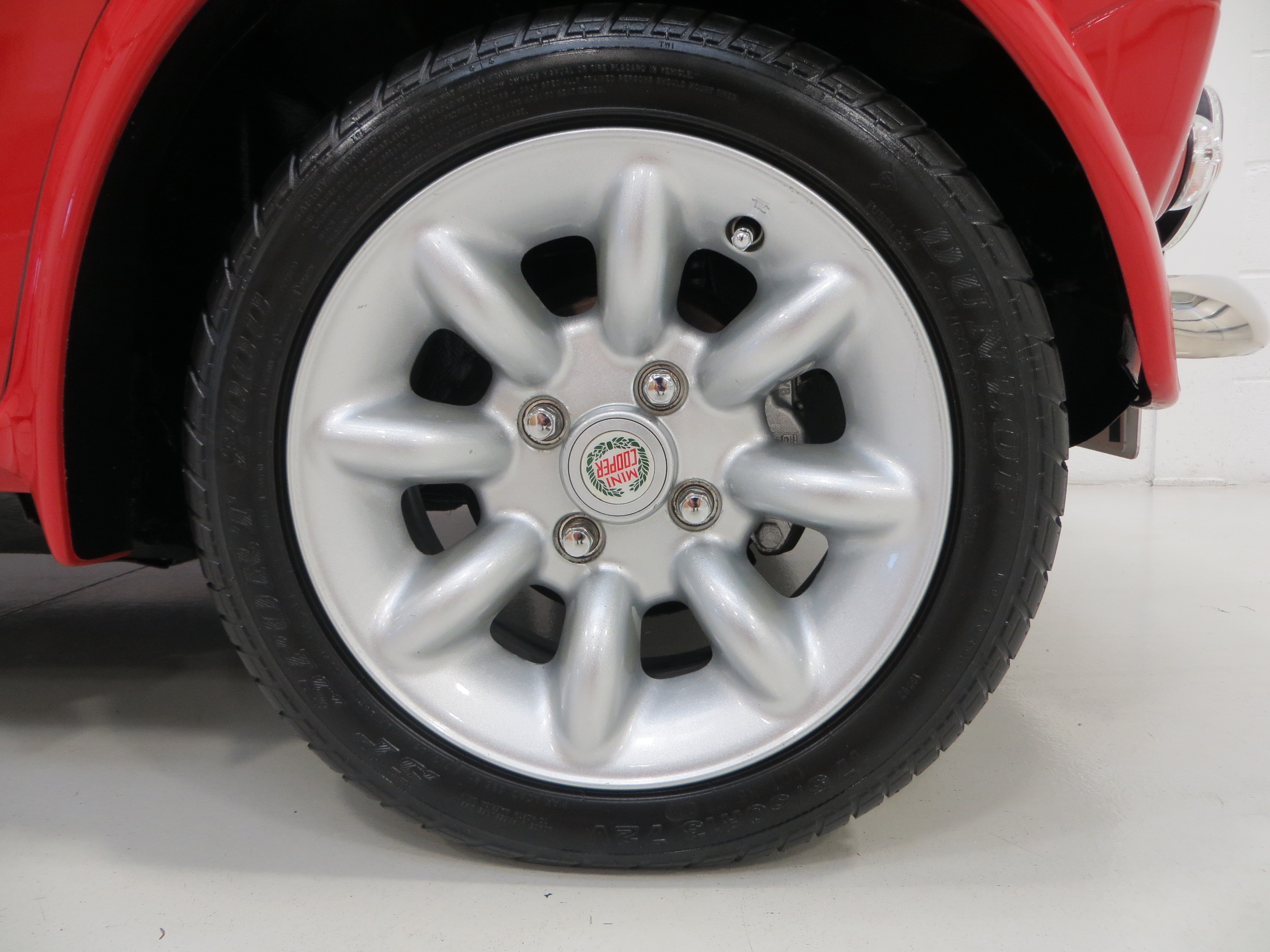 Lavishly trimmed, the factory optional full leather interior in Black (Code PMA), is in pristine order thanks again to the very low miles. Natural light veins to the steering wheel often worn smooth on most examples remain prominent but the gearknob colouring has faded slightly. The immaculate carpets have been protected by genuine Mini Cooper velour mats and the door cards are perfect. The cream faced instruments set within the unmarked burr walnut facia function correctly along with all other controls. The correct stereo cassette player with the Mini logo remains fitted. The spotless boot area houses the original steel spare wheel alongside the factory supplied jack in its Mini logo pouch. A stunning classic Mini interior, totally unspoilt and utterly faultless.