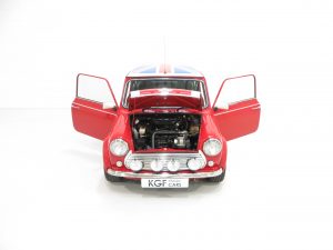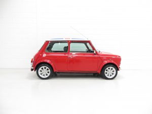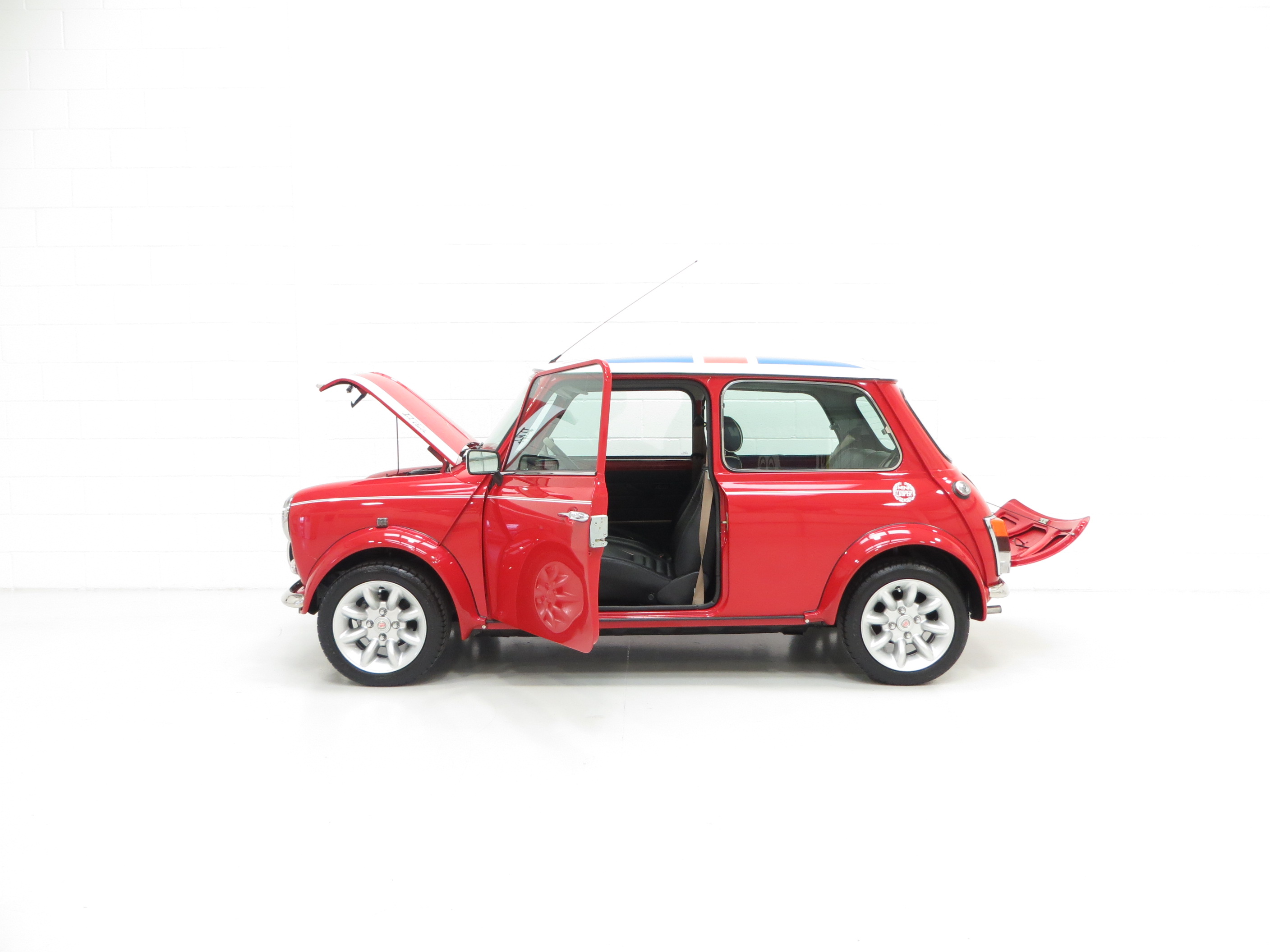 Old English White roof, door mirrors, and bonnet stripes, chrome brightwork, opening rear quarter windows, twin coachlines and decals, Mini winged bonnet and boot badges, halogen headlamps, headlamp levelling switch, heated rear window, cream faced instrument gauges, full width burr walnut fascia, chrome gear lever, beige leather gearknob and gaiter, driver’s airbag, side intrusion beams, perimetric anti-theft alarm with passive engine immobiliser and remote activation, internal bonnet release. Factory options; Black full leather seats facings. Factory Sports Option Pack comprising; Large body coloured wheelarch extensions, 2 driving lamps + 2 fog lamps, sports accelerator pedal, Koni shock absorbers, additional gauges in fascia, 13”x6” Sports Style alloy wheels. Dealer accessories; Union Jack roof decal, ‘John Cooper’ signature on bonnet stripes.