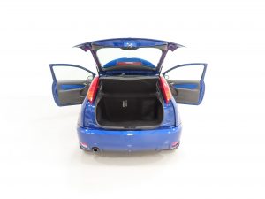Inside this white-hot Ford are a pair of body-hugging Sparco road-race seats swathed in luxurious Racing Black and Blue Leather and Black Alcantara, (Code AR). The RS and Sparco logos are embossed and stitched into the upholstery, coupled with this are the aluminium fittings, push button start and numbered plaque. The non-double-stitched front seats are correct for an earlier car and the interior is very clean with only very light wear to the driver’s outer bolster. The steering wheel blue leather, a known weak point, is bright and unworn and has never been recovered. The near impossible to source RS front carpet mats remain with the car with some wear to the driver’s side visible. A second set of genuine Focus mats have been bought for usage and to protect the originals. The number 2744 plaque is present and the green starter button with ‘engine start’ lettering is correct for all but the earliest cars. Ford built this car to truly delight its motorsport loving RS devoted fan base and the long-awaited car did not disappoint.