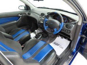 Build number 2744 is completely factory standard and finished in stunning Imperial Blue Metallic, (Code Q2), the only available colour. The paintwork boasts a deep polished shine and all factory panels are straight and undamaged and the bumpers, side skirts and trim sections are immaculate. The conscientious second owner applied discreet clear 3M wrap to the front facing area of the rear wheel arches to protect from the all-too-common gravel rash. All original fit Ford etched glass, badges and light fittings remain fitted as are the supplying Ford dealer rear screen sticker and Ford main dealer number plates. This superb and unmolested example is a credit to this fast Ford icon and completely factory standard.