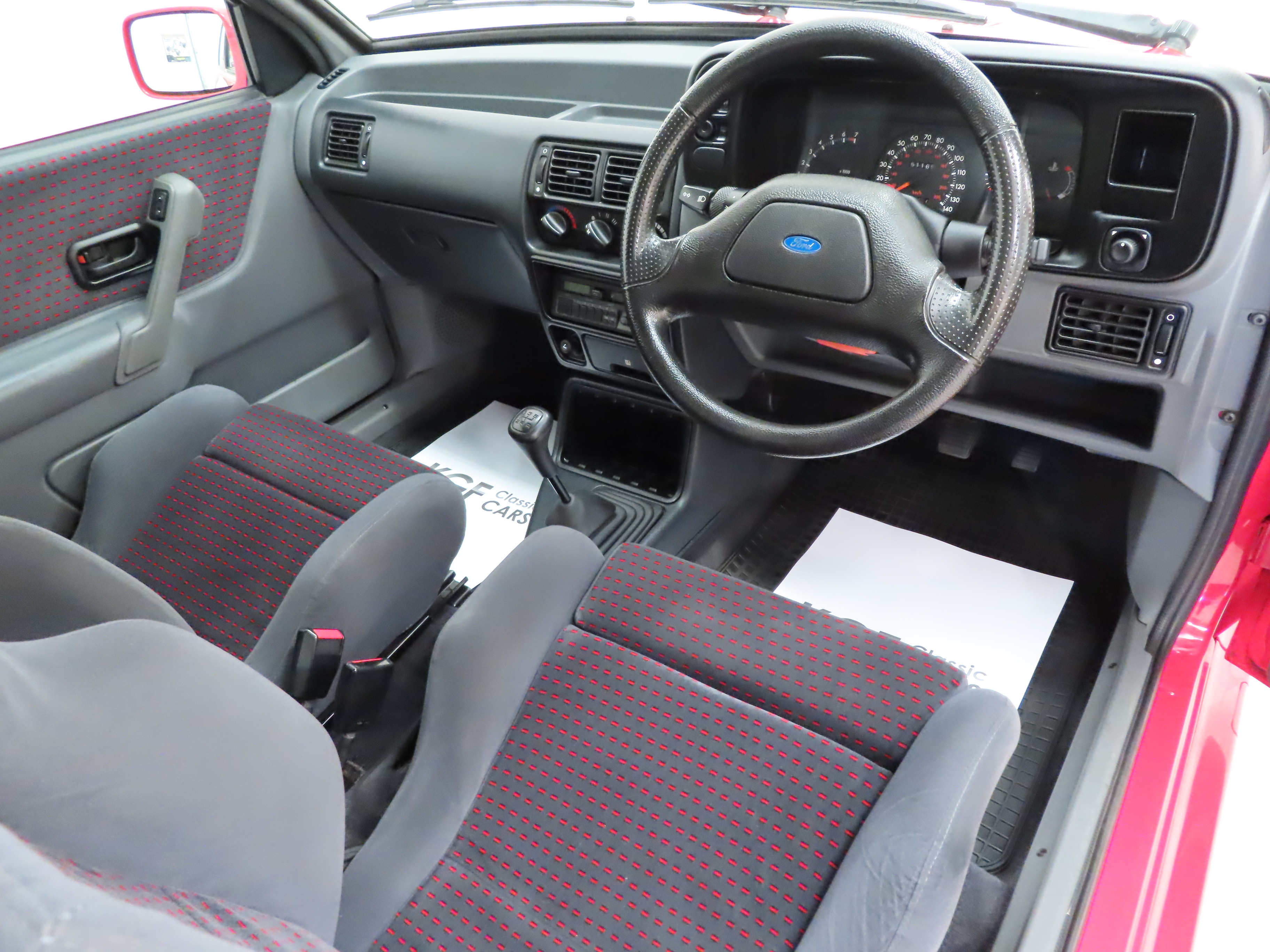 Body coloured bumpers with black insert, body coloured wheel arch extensions, 88 spec tailgate spoiler, halogen headlamps, front driving lamps, cooling vents in bonnet, central door locking, heated rear window, dual-tone horn, tailgate wash/wipe, tinted glass, quartz digital clock, aerial incorporated in rear windscreen, Recaro front reclining seats, 60/40 split rear back rest, soft feel sports steering wheel, tilt/slide glass sunroof, tachometer, electrically operated front windows, Ford ECU2 Self-Seek Stereo, speaker control. Dealer Options; Ford tailored rubber mats, Extra Cover Ford Optional Warranty Plan, (expired).