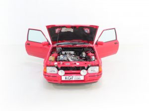 The 1.6 OHC (CVH) fuel injected engine with a Garrett AiResearch T3 turbo charger and intercooler is completely factory standard making this vehicle a rare example and highly sought after. Producing 132bhp in such a lightweight car, the 0-60 dash is dealt with in 8.2 seconds and a top speed of 128mph is achieved. A completely standard and unspoilt engine compartment displays factory labels and metal plates to the slam panel including the coloured-coded body plate that had never been repainted. The inner front wings display correct date stamps to the rear of the panel and small Ford emblem pressing toward the front edge. Accuracy seekers will be pleased to see Motorcraft leads, hoses and service items including the fuel filter. Even the original Ford battery cover has not gone missing! The 5-speed manual Ford BC box is light and precise with crisp clutch action.