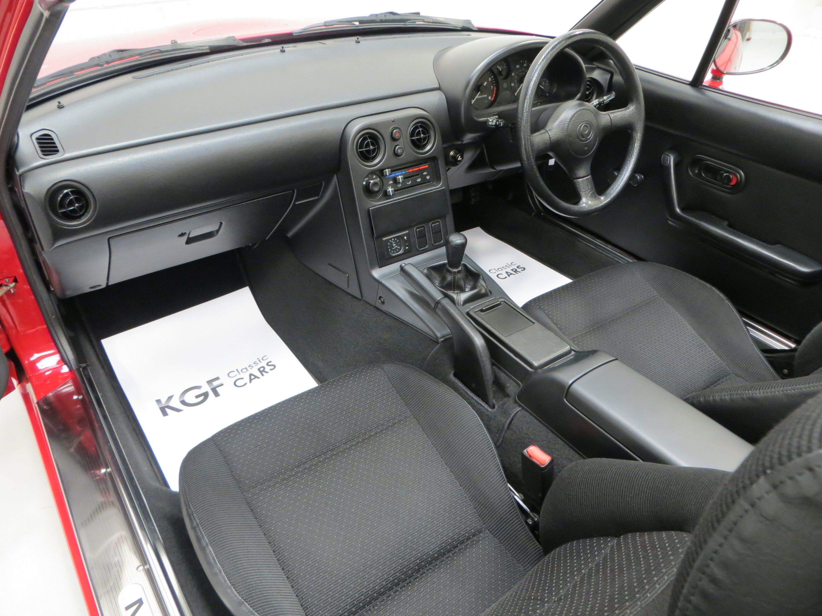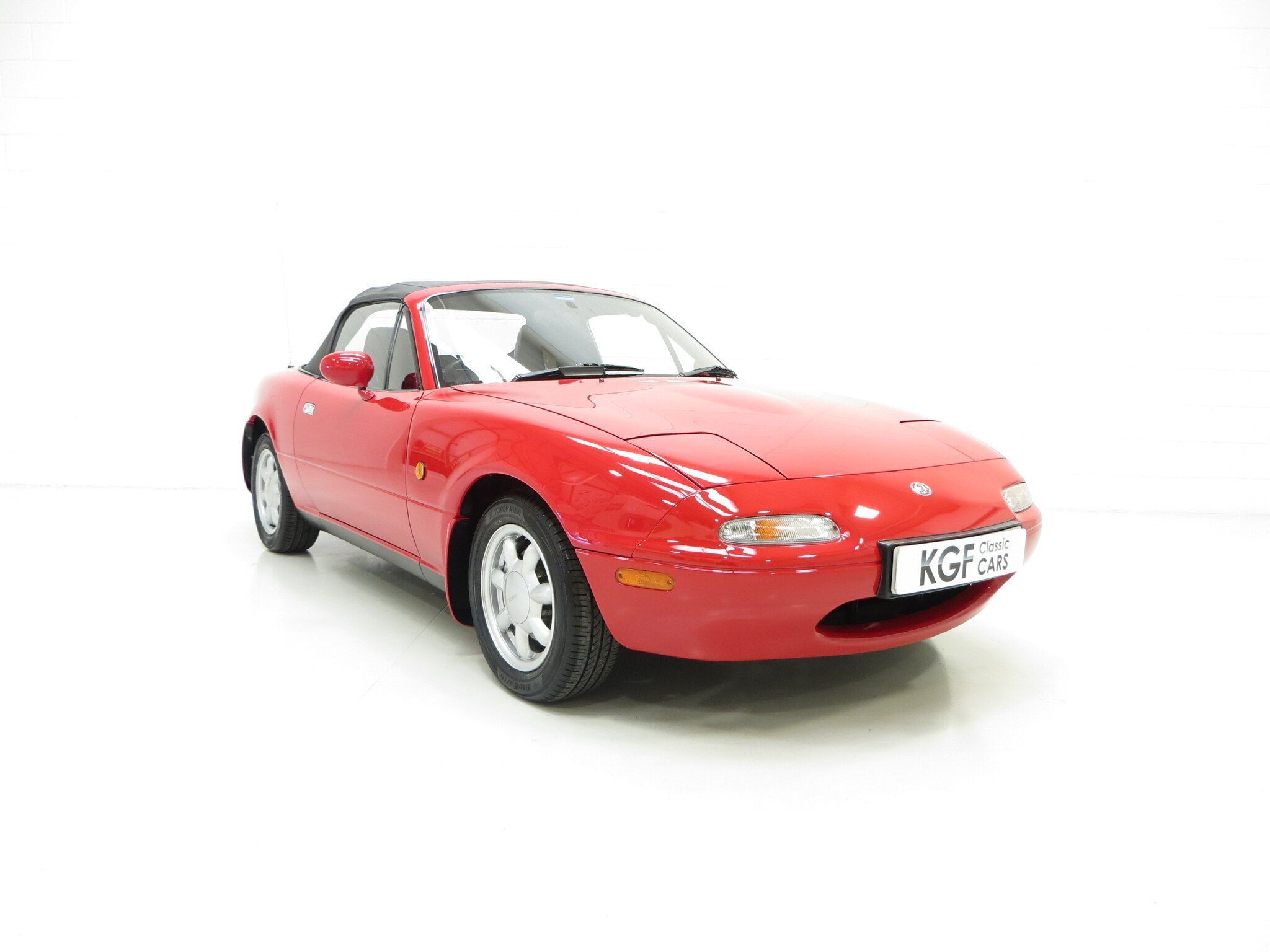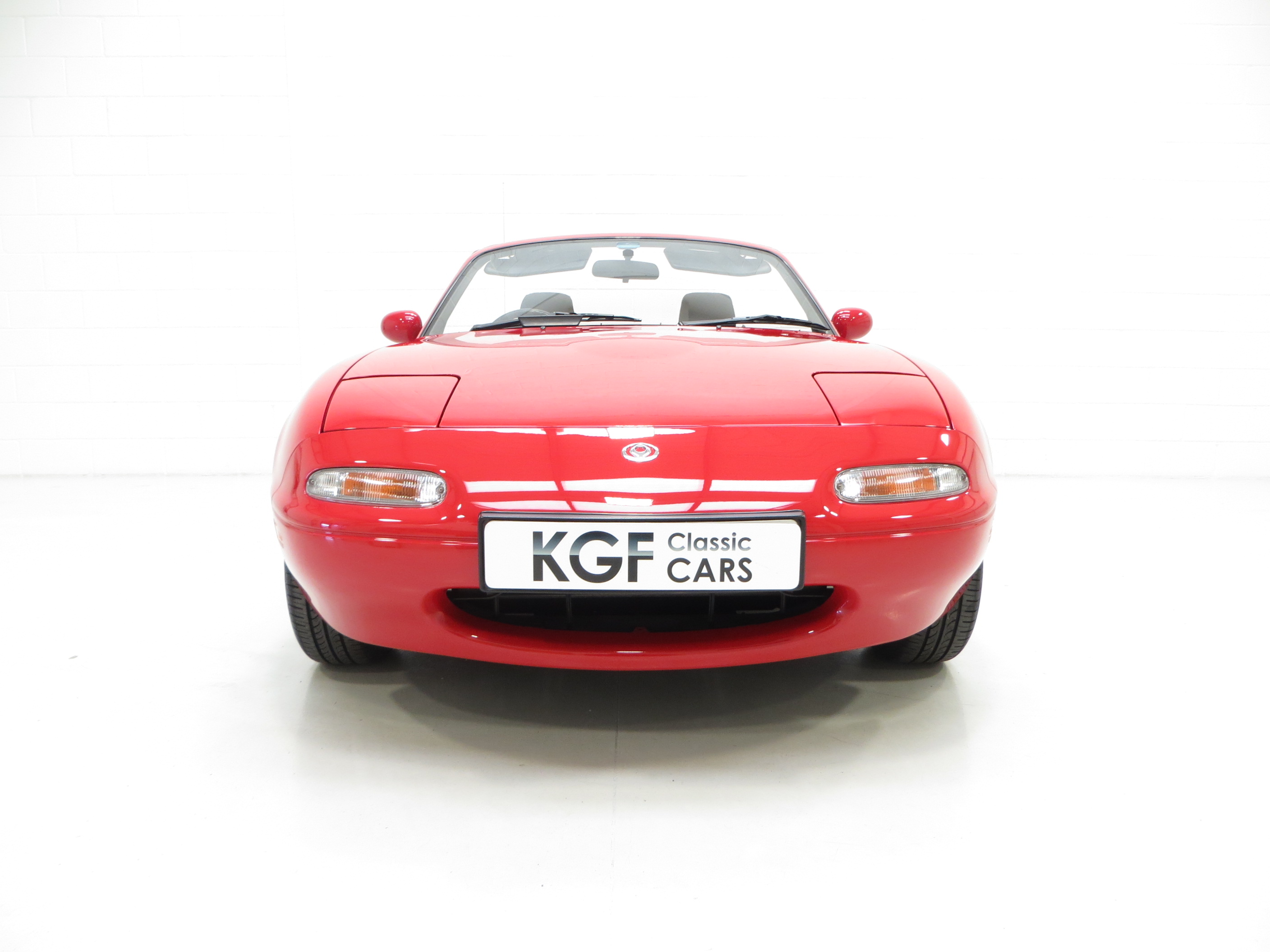 This amazing example was registered new by Mazda Main Dealers, Bourne Road Garage of Kent, on 3rd April 1996. Supplied to first owner Mr Mark Sweet with three UK keepers since the incredibly low 20,342 miles from new is fully verified in the history file. The original Mazda Service Record booklet houses eleven stamped entries, the first nine of which are the supplying Mazda dealer. The most recent stamped entry at Bridley Mazda of Stourbridge was at 18,964 miles. All handbooks, manuals and spare key are neatly contained in the grey leather Mazda wallet along with an immaculately kept folder containing invoices and every MOT carried out from three years old. Sold in December 2016 by KGF Classic Cars to a customer in France, the car has been professionally stored in his collection before the opportunity to purchase it back was welcomed enthusiastically, knowing that the car would be returning to the UK and that low mileage examples are highly sought after. KGF Classic Cars are delighted to be able to present this stunning example back to the open market ready for a new lucky owner.