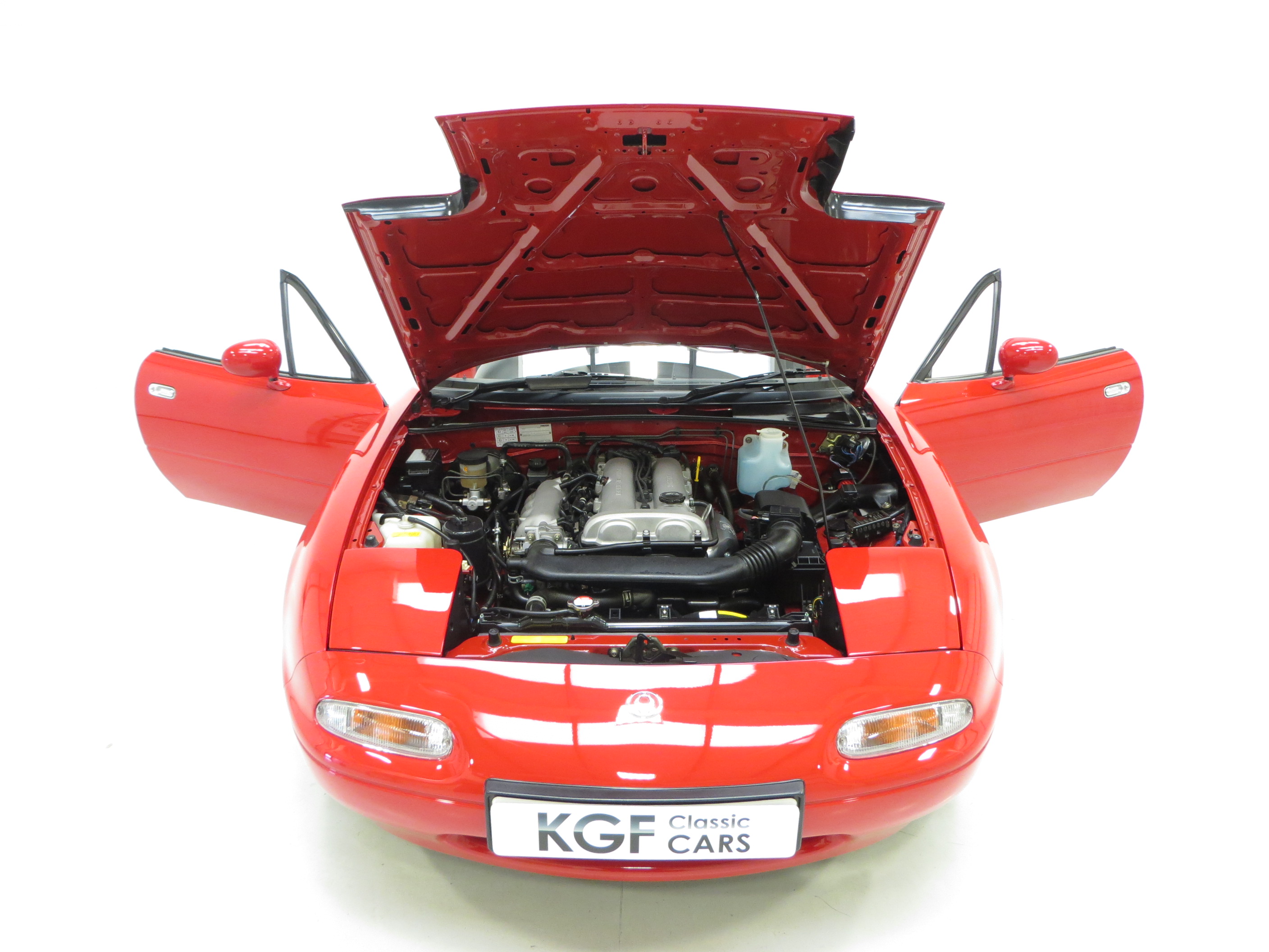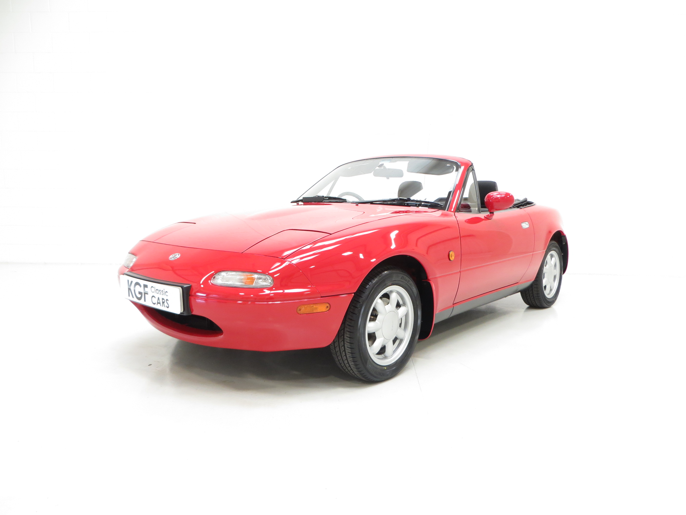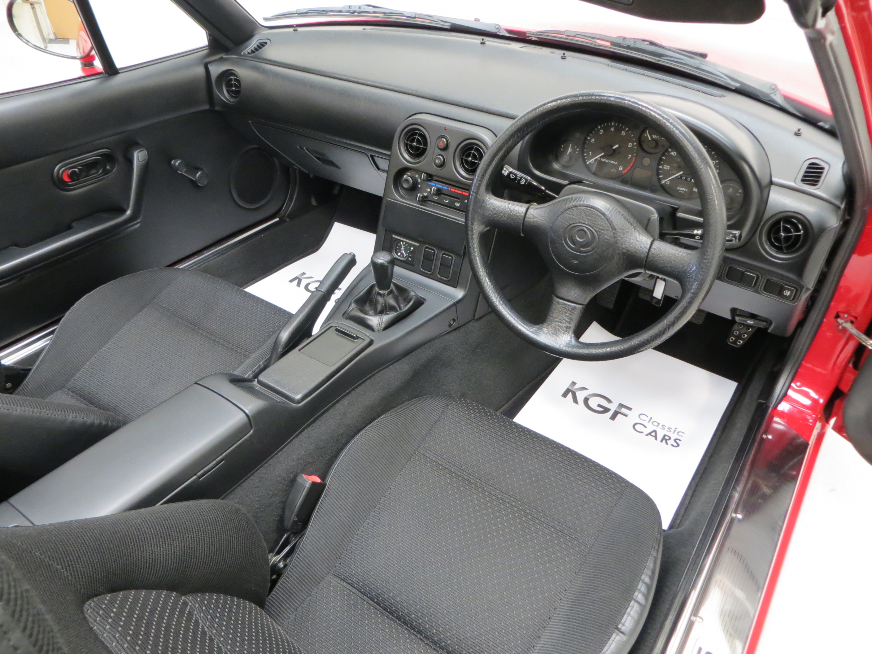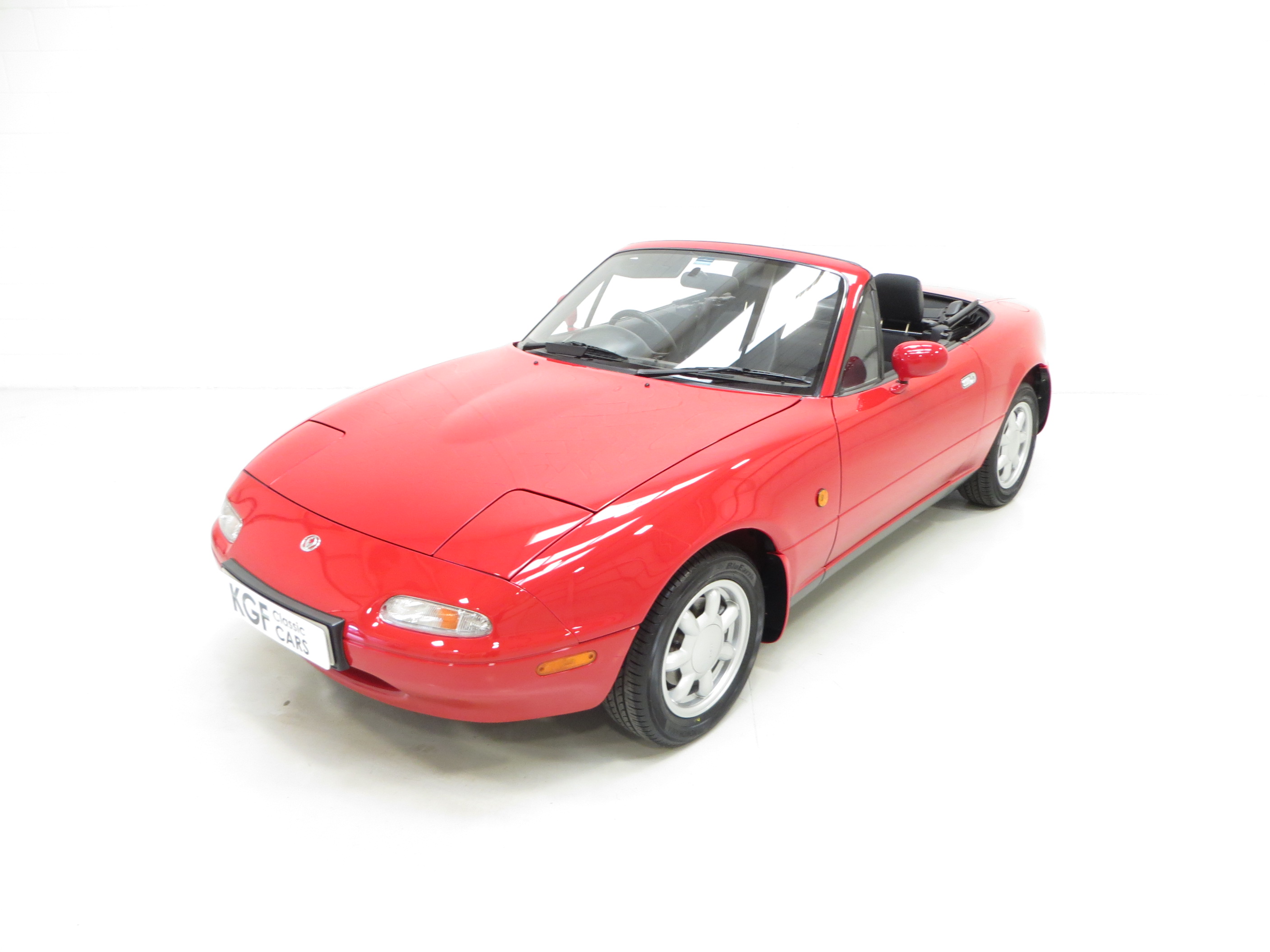 This amazing example was registered new by Mazda Main Dealers, Bourne Road Garage of Kent, on 3rd April 1996. Supplied to first owner Mr Mark Sweet with three UK keepers since the incredibly low 20,342 miles from new is fully verified in the history file. The original Mazda Service Record booklet houses eleven stamped entries, the first nine of which are the supplying Mazda dealer. The most recent stamped entry at Bridley Mazda of Stourbridge was at 18,964 miles. All handbooks, manuals and spare key are neatly contained in the grey leather Mazda wallet along with an immaculately kept folder containing invoices and every MOT carried out from three years old. Sold in December 2016 by KGF Classic Cars to a customer in France, the car has been professionally stored in his collection before the opportunity to purchase it back was welcomed enthusiastically, knowing that the car would be returning to the UK and that low mileage examples are highly sought after. KGF Classic Cars are delighted to be able to present this stunning example back to the open market ready for a new lucky owner.