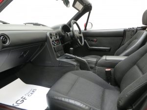 This truly exceptional Mazda MX-5 in factory original Classic Red, (Code SU), boasts a pristine deep gloss shine and impeccable finish. The showroom fresh appeal with absolutely no colour fade or deterioration to the paintwork is owing to the incredible low mileage, garaged storage from new and dry usage only. The underside and sills are detailed to concours standard and the car has competed successfully at such events. Miniscule chips around the fuel filler and a tiny 1cm scratch on the rear bumper are utterly minor imperfections. The black canvas hood is in perfect order with a tight fit and no cracks or damage and the rear plastic window is clear with no crease marks whatsoever. The epitome of a modern classic sports car, preserved to the highest order.